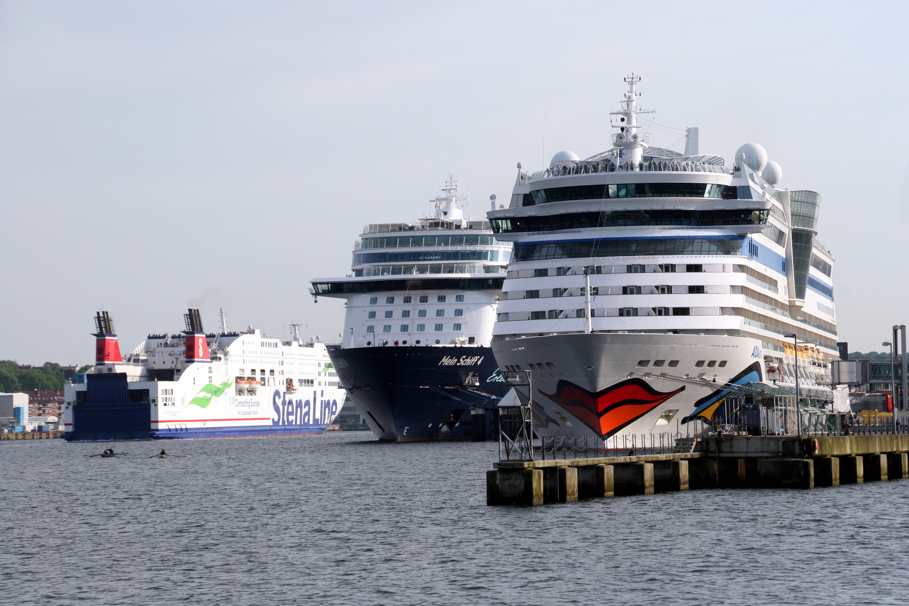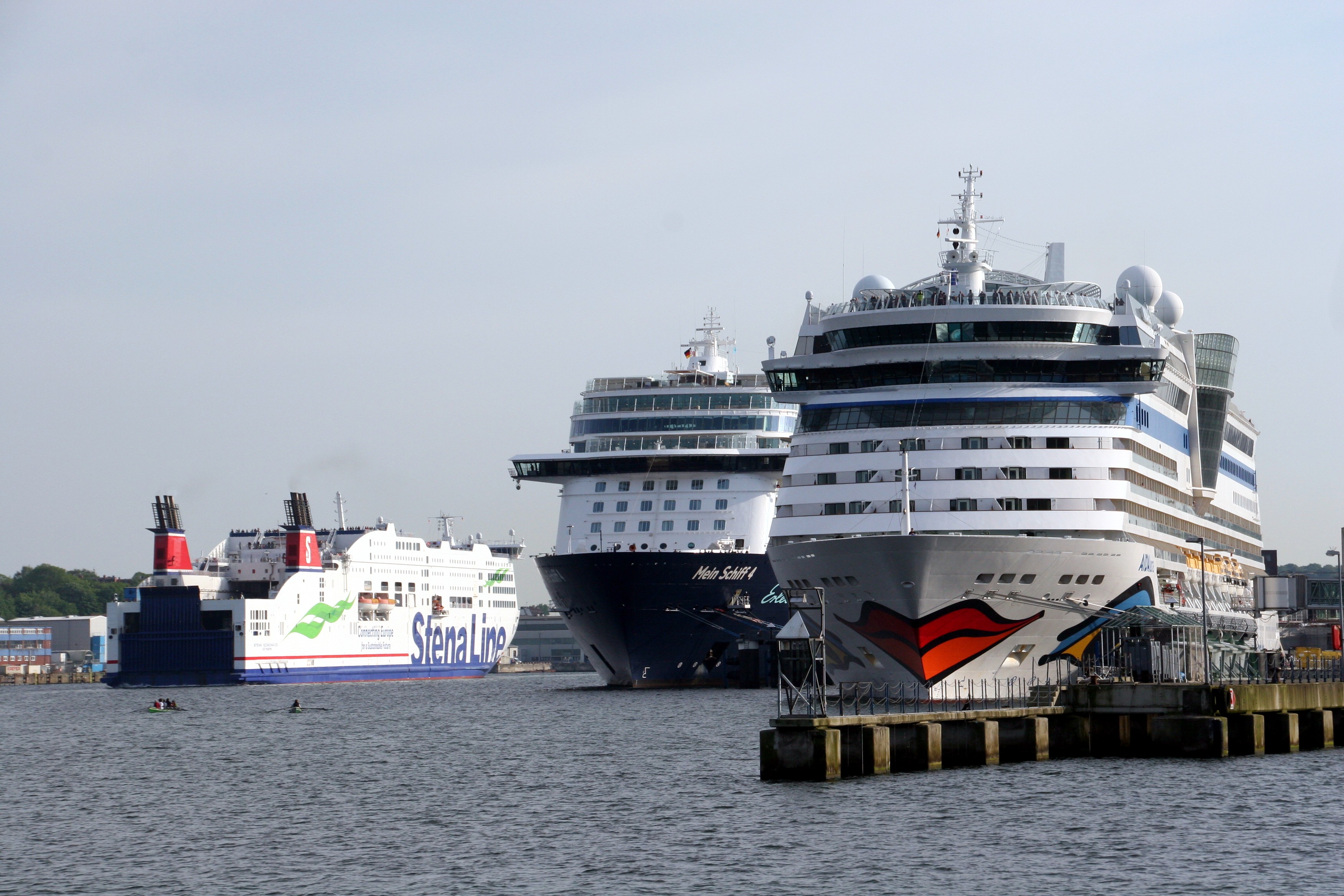 Vor ihren Auslaufmanövern warten die "Mein Schiff 4" und die AIDAluna am Ostseekai auf das Auslaufmanöver der "Stena Scandinavica"