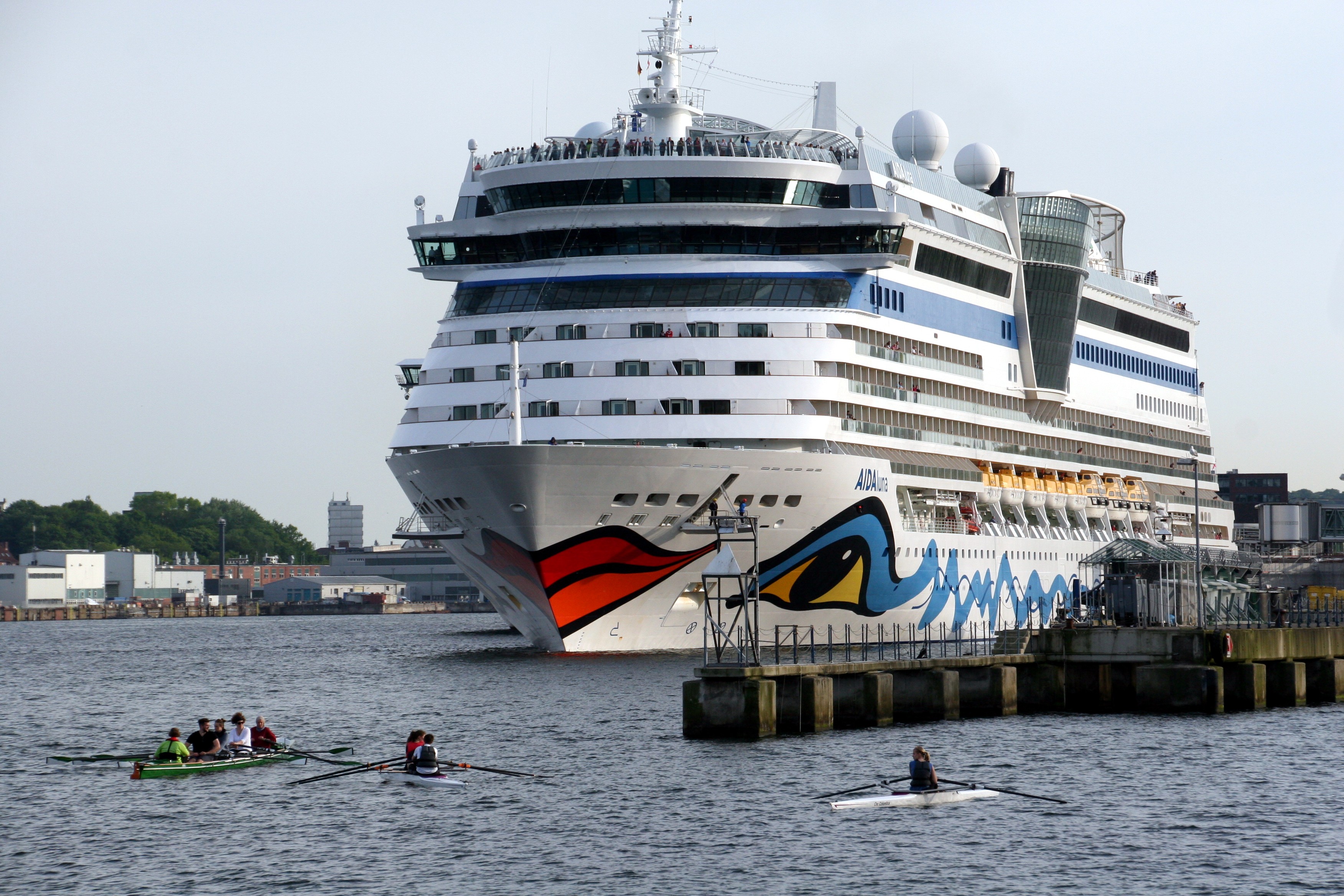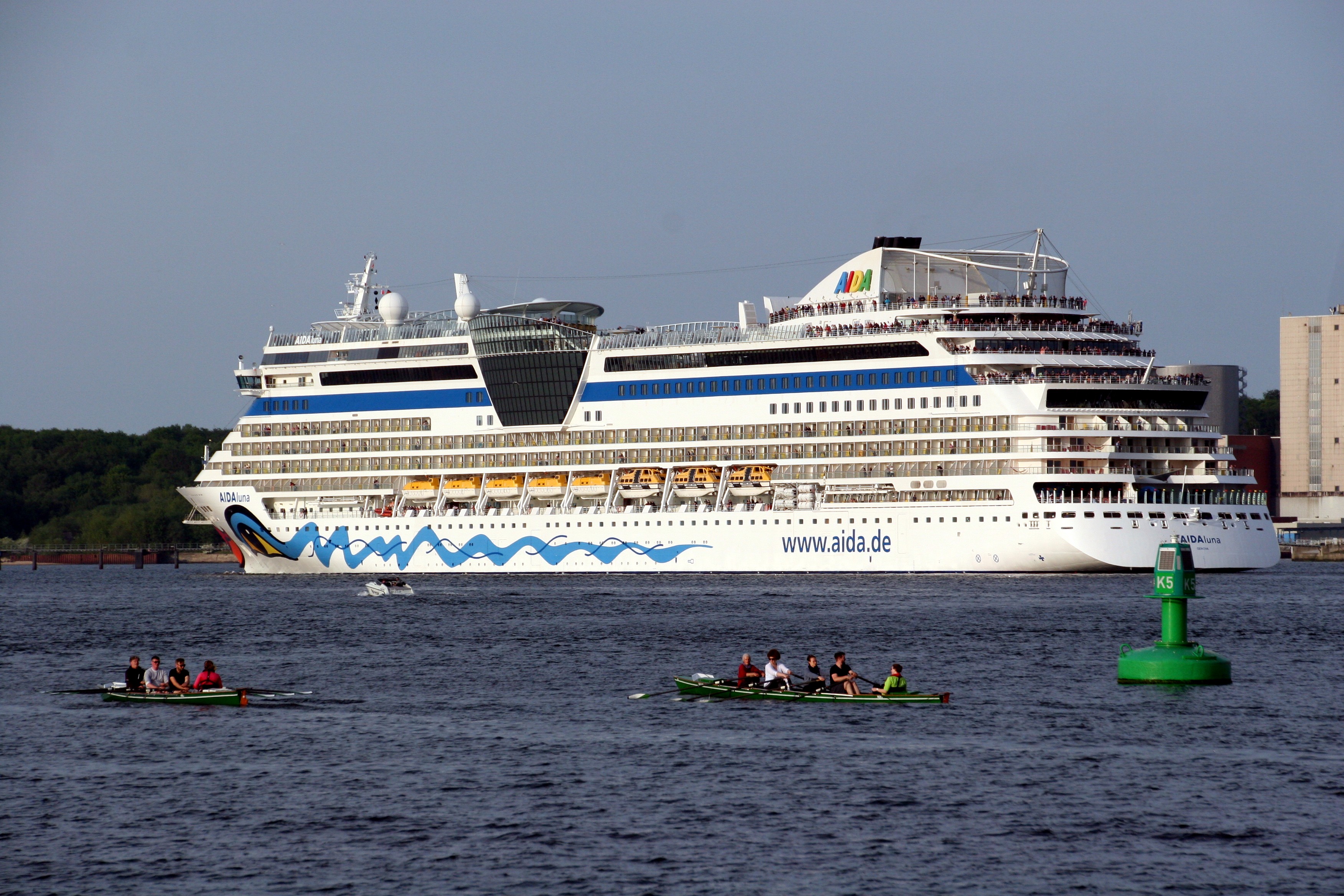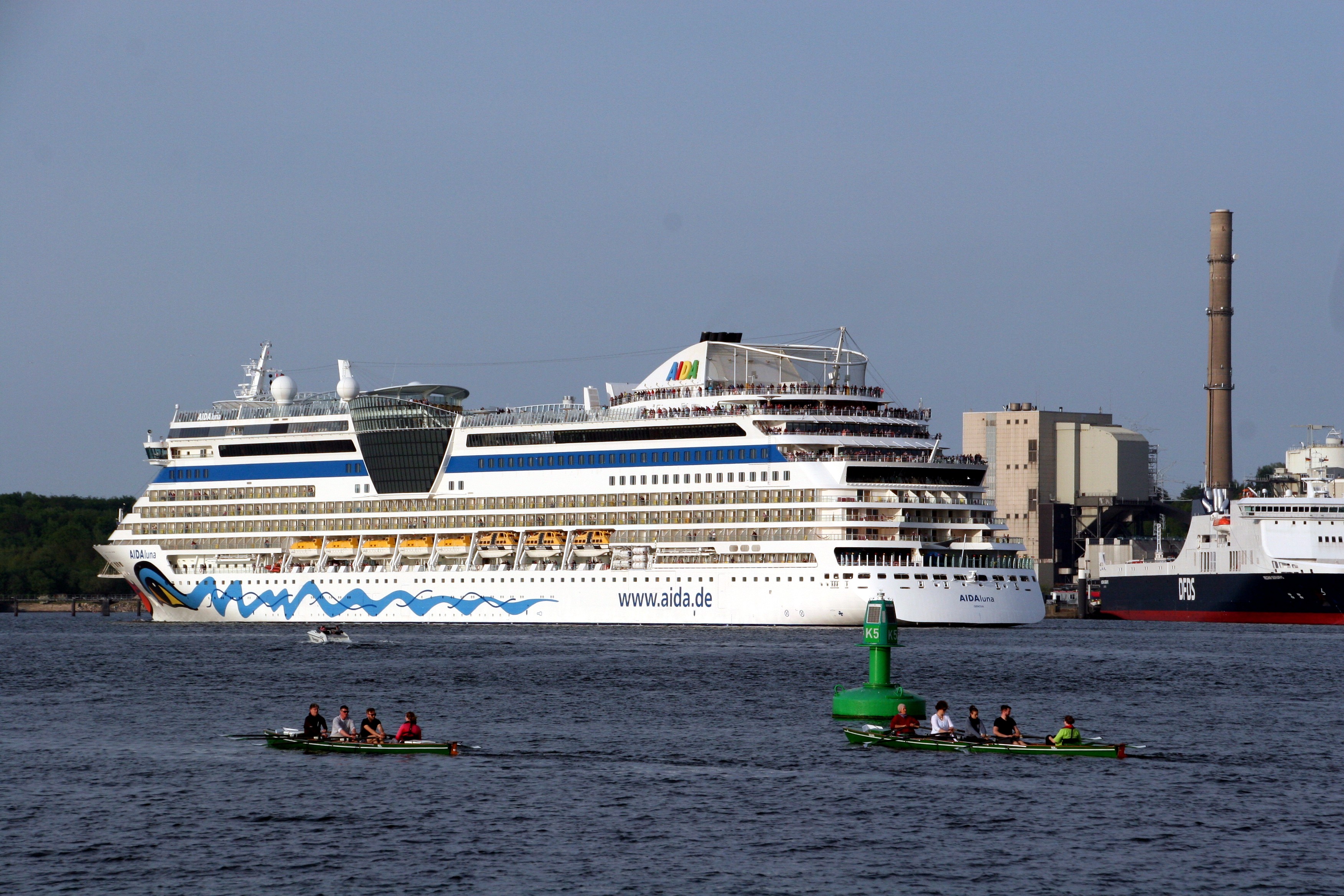 Die Passagiere in den kleinen Booten genießen auch das Auslaufmanöver der AIDAluna in ihrer unmittelbarer Nähe auf der "Kieler Förde"