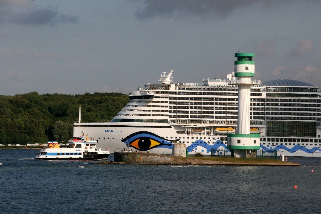 Die AIDAprima fährt ihre "Revierfahrt" auf der "Kieler Förde" in der Höhe vom Leuchtturm in "Friedrichsort"