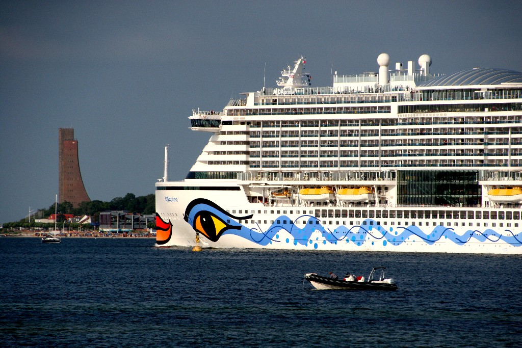 Die AIDAprima ist kurz vor dem futuristischen "Marine-Ehrenmal" in Laboe