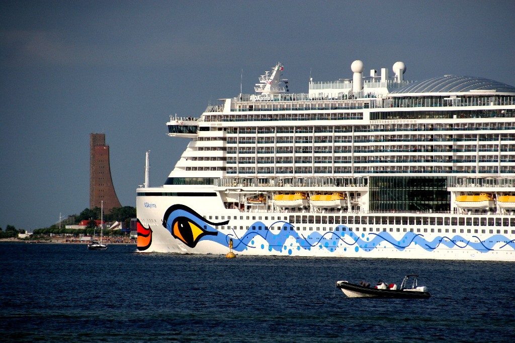 Die AIDAprima ist kurz vor dem futuristischen "Marine-Ehrenmal" in Laboe