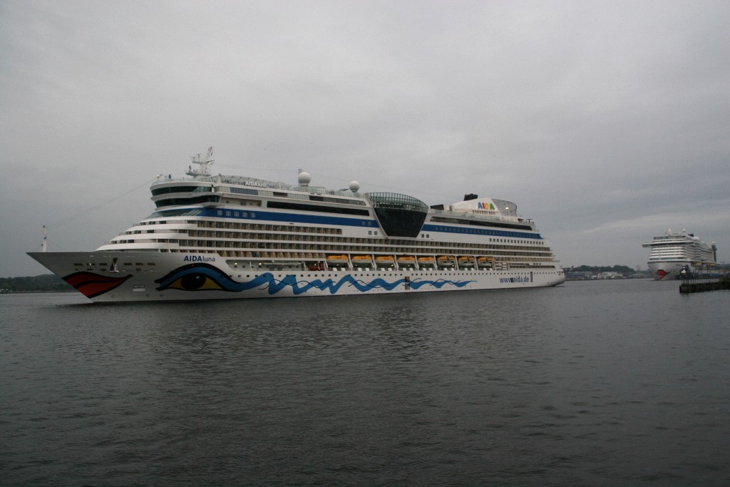 Die AIDAprima und die AIDAluna warten auf das Auslaufmanöver der Stena Germanica