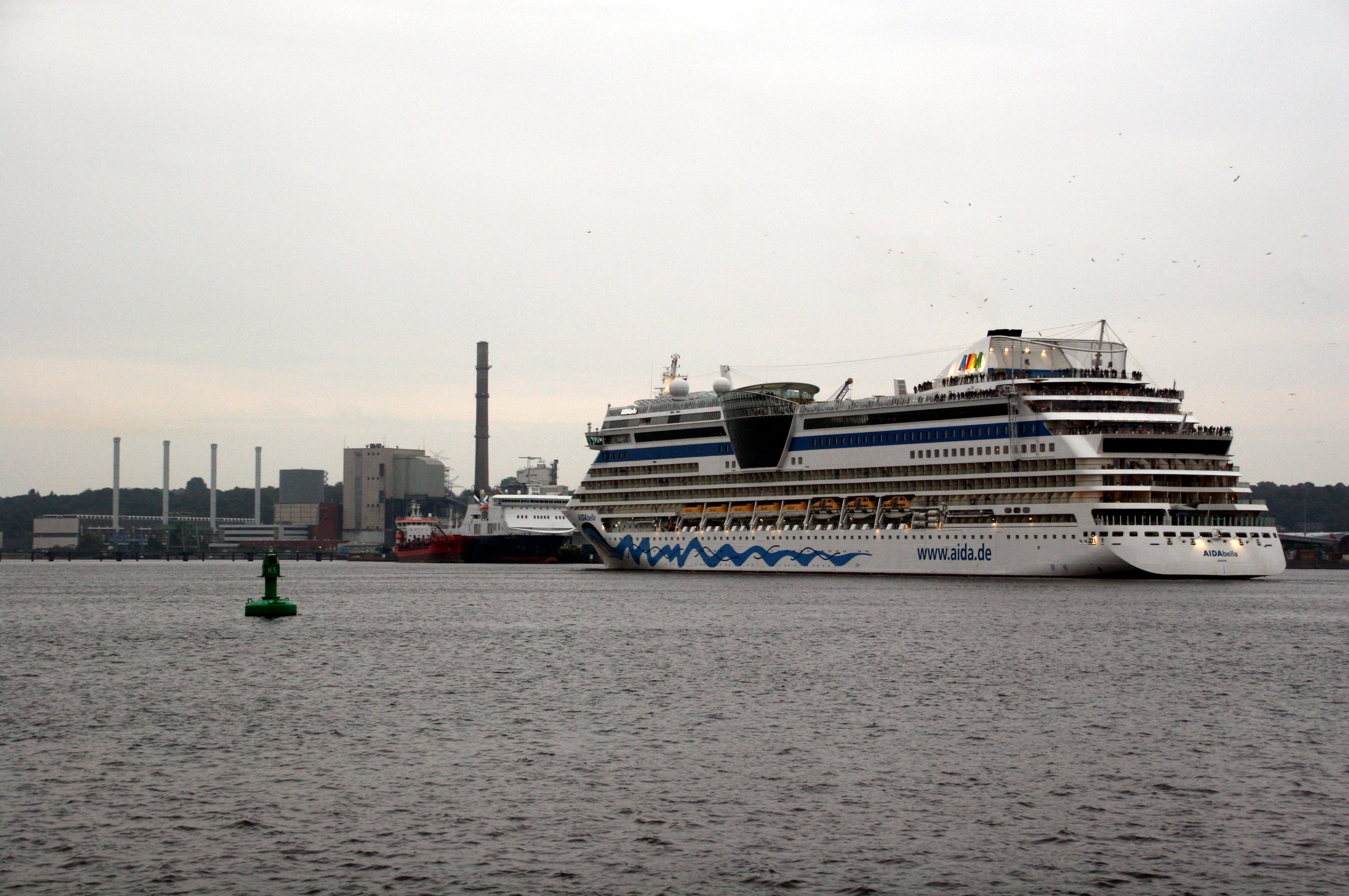 Die AIDAbella fährt ihre Revierfahrt auf der "Kieler Förde" in Höhe des noch schönstgelegenen aber stillgelegten Kraftwerks in Deutschland