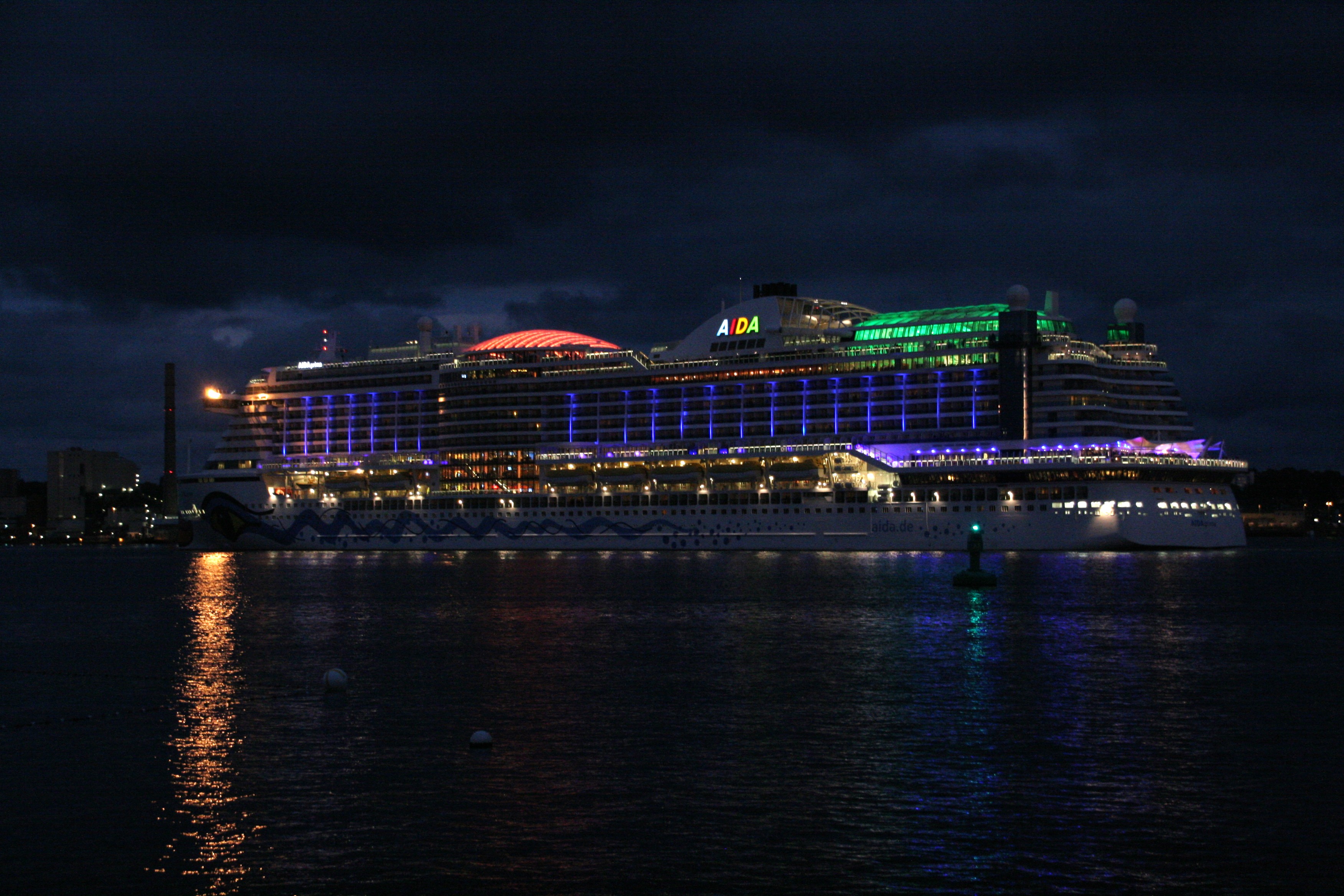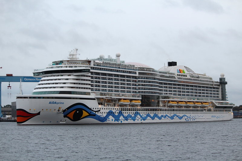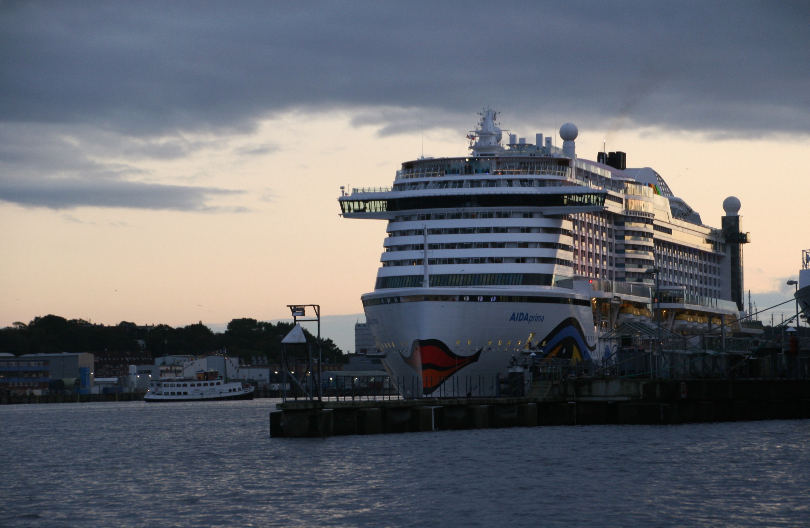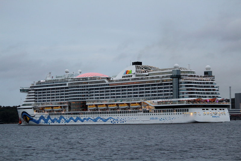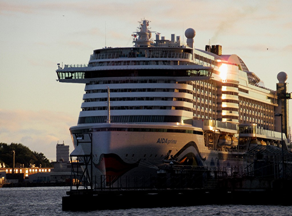 Die AIDAprima fährt um 19:03h mit einer Stunde Verspätung ihr Auslaufmanöver am Ostseekai in Kiel