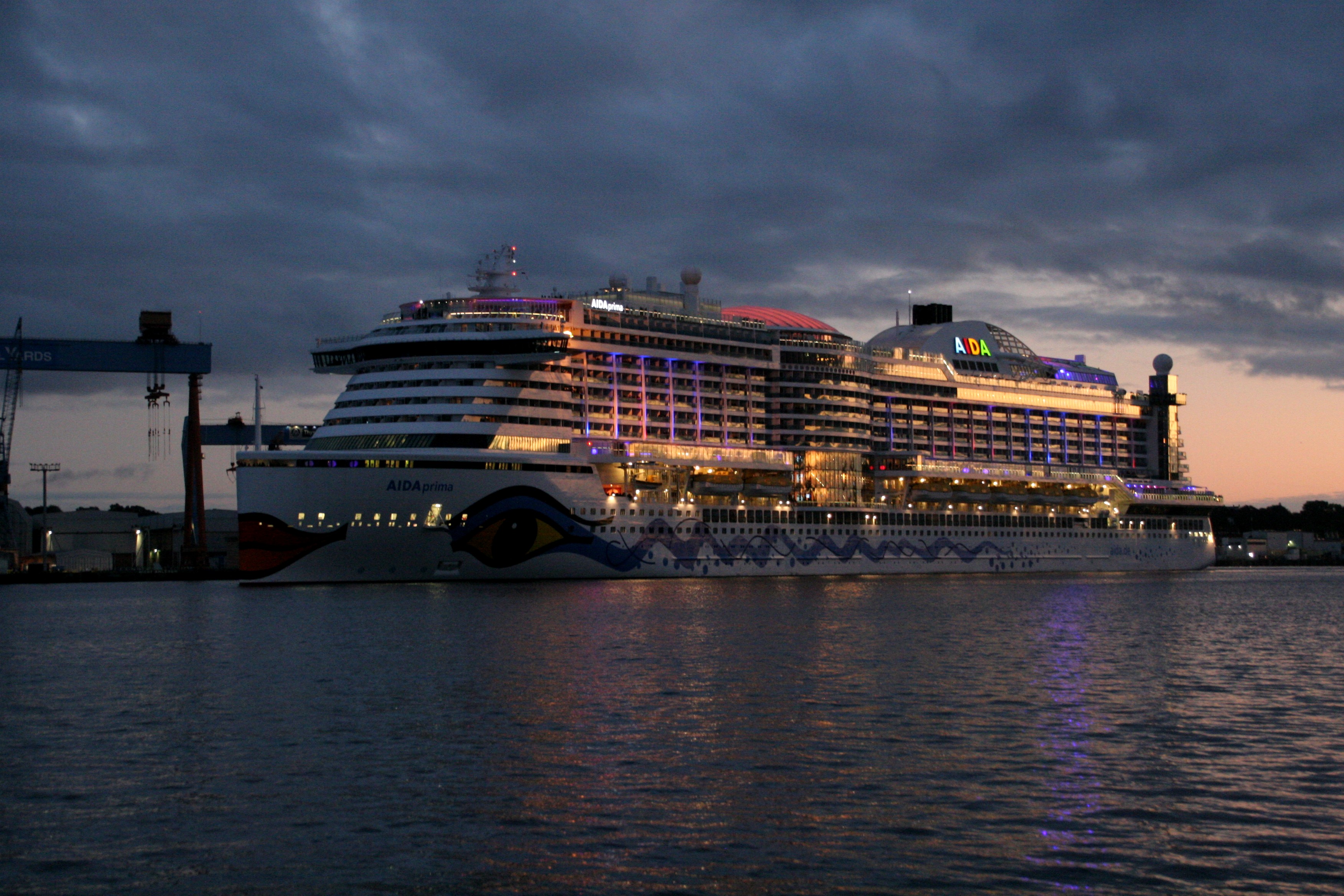 Die AIDAprima fährt im abendlichen Lichterglanz der untergehenden Sonne ihr Auslaufmanöver auf der "Kieler Förde"
