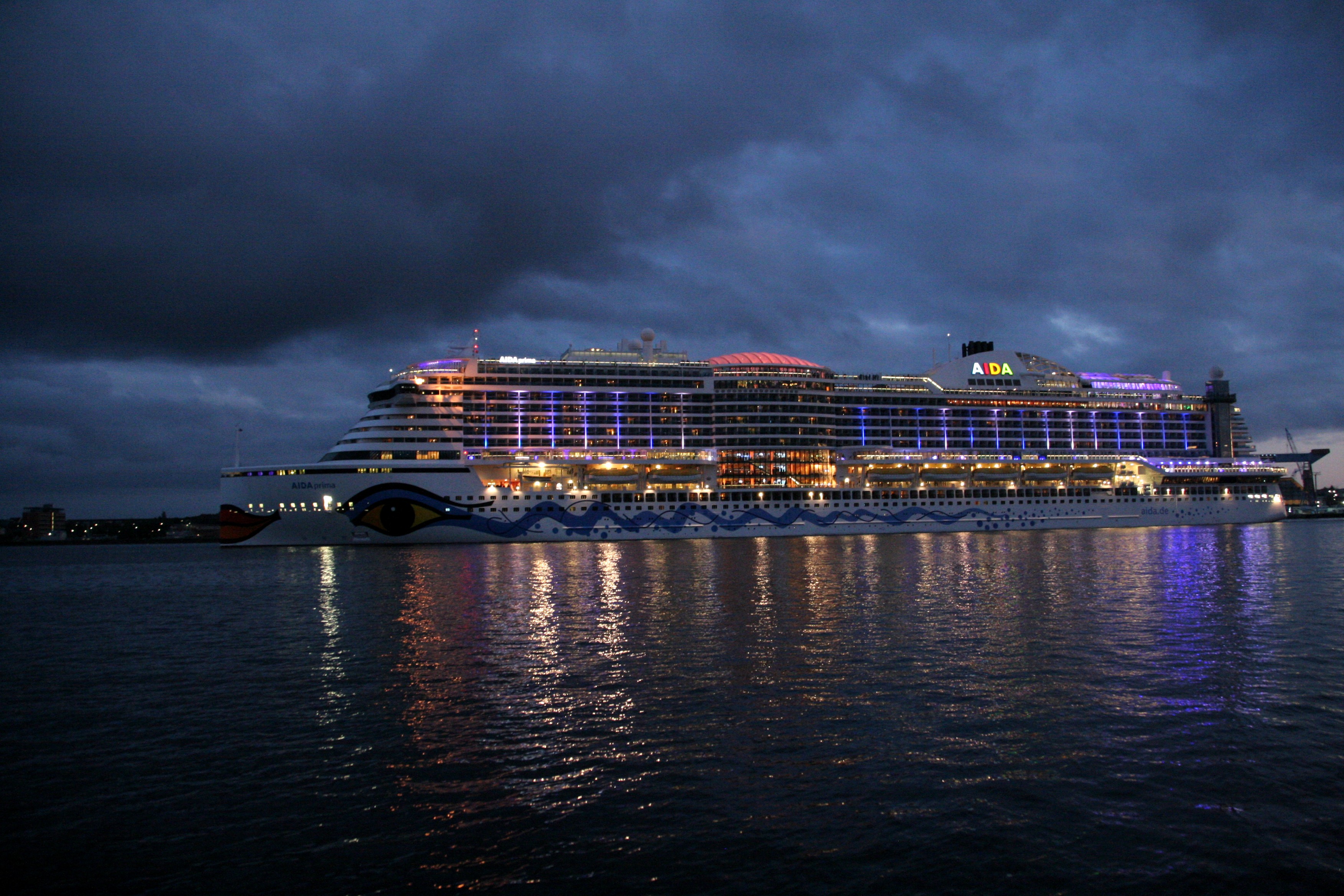 Die AIDAprima mit einem funkelnden Lichterglanz unter einem grandiosen Wolkenpanorama