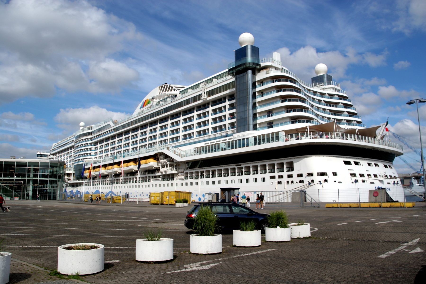 Die AIDAprima wartet am Ostseekai (LP 27) auf das Auslaufmanöver der "Stena Germanica"