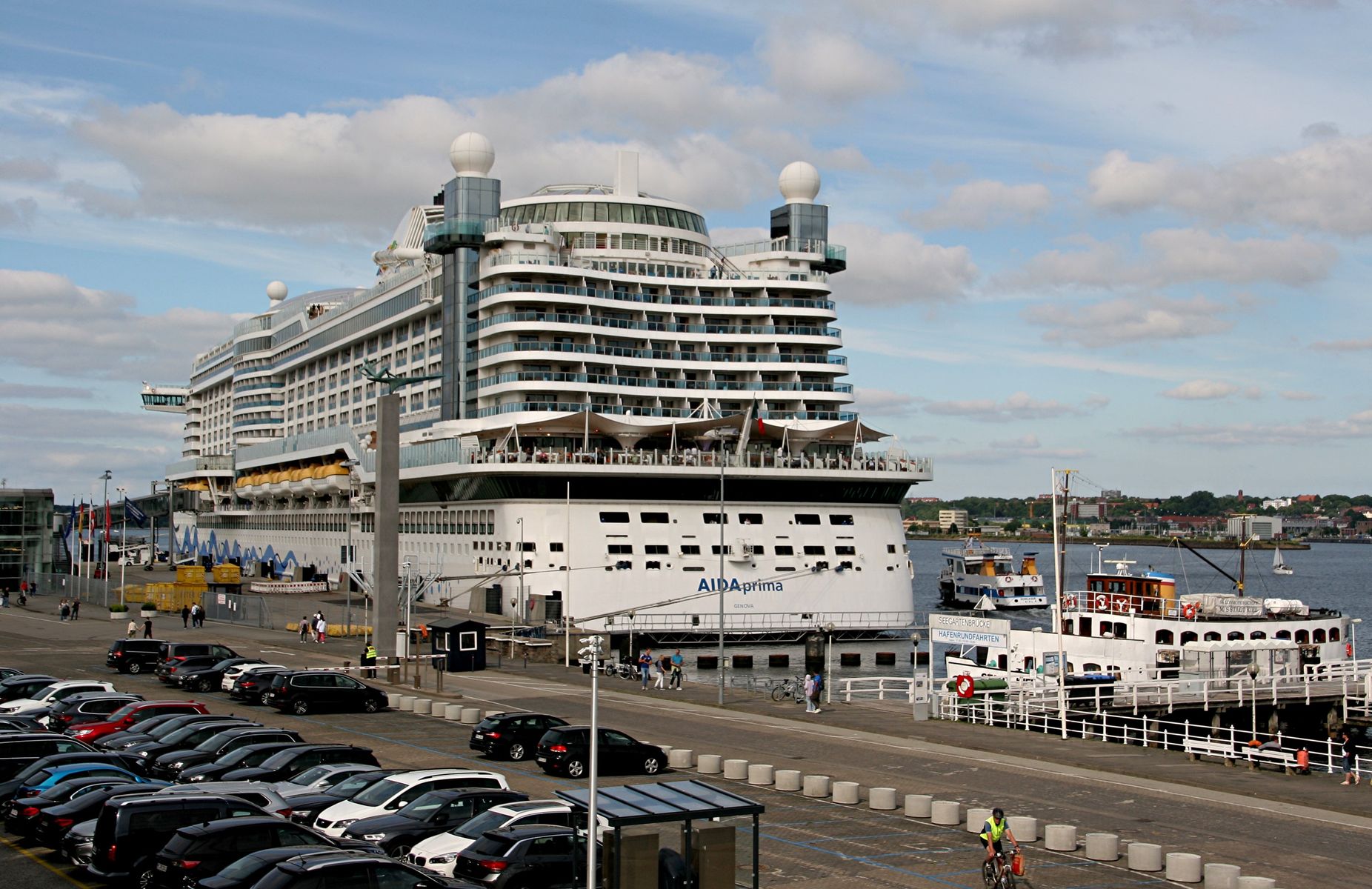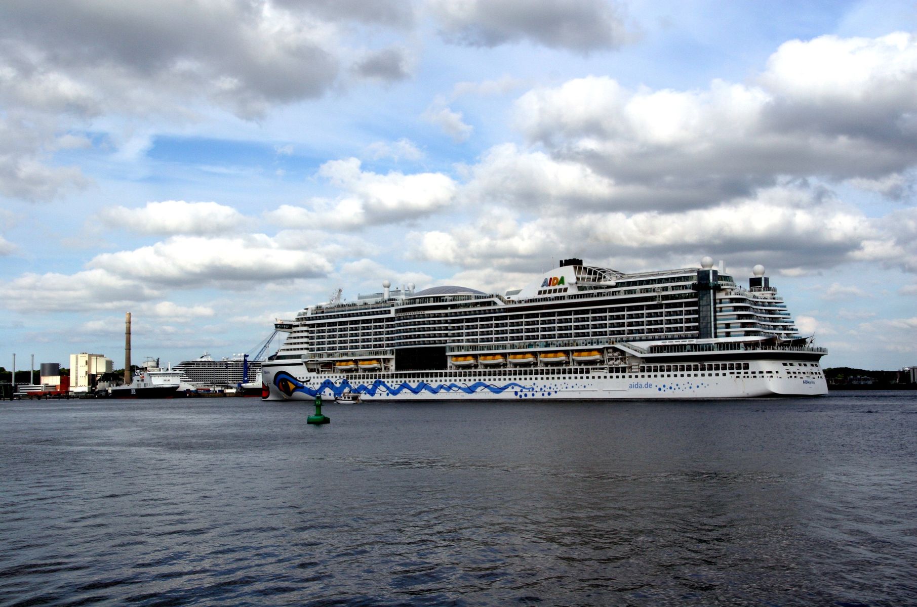 Die AIDAprima fährt um 18:13h bei 28 °C und Wassertemperatur 22°C ihr Auslaufmanöver auf der "Kieler Förde"