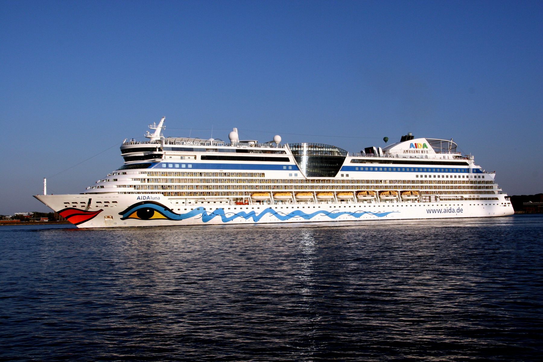 Die AIDAprima fährt unter einem azurblauen Himmel mit einem "Lichterglanz" der untergehenden Sonne ihr Auslaufmanöver auf der "Kieler Förde"