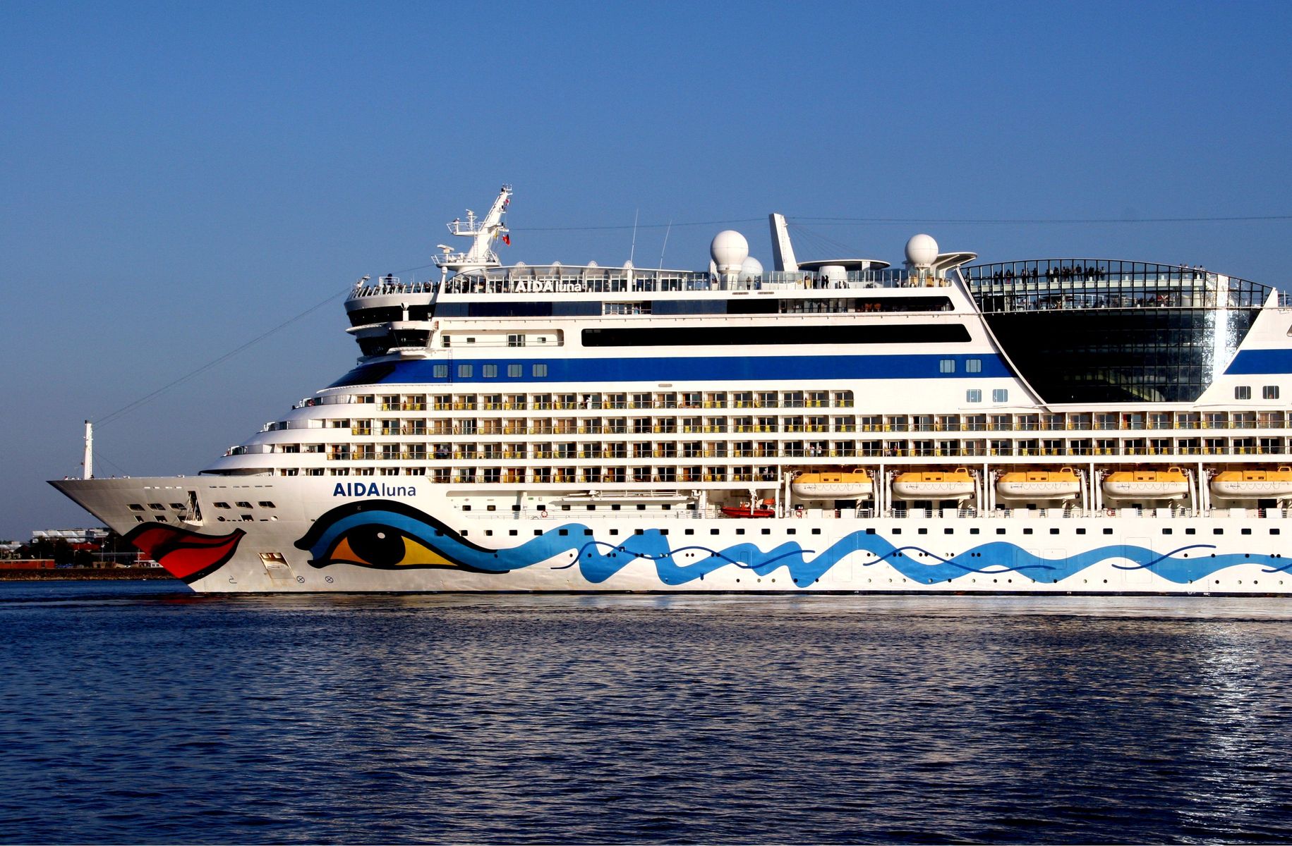 Die AIDAluna dreht unter einem azurblauen Himmel vor der Flaniermeile "Kiellinie" auf dem "Teller"