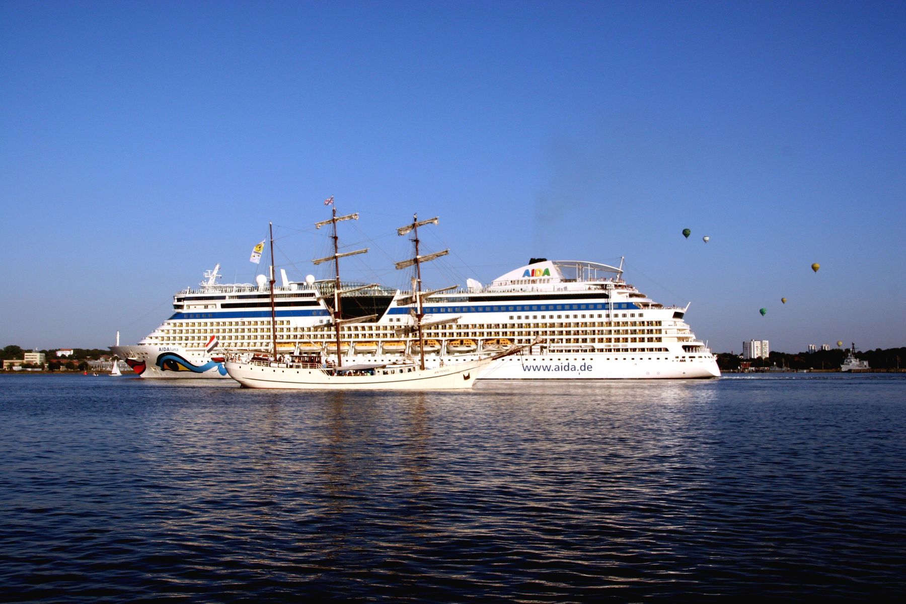 Die AIDAluna fährt unter einem azurblauen Himmel ihre Revierfahrt auf der "Kieler Förde"