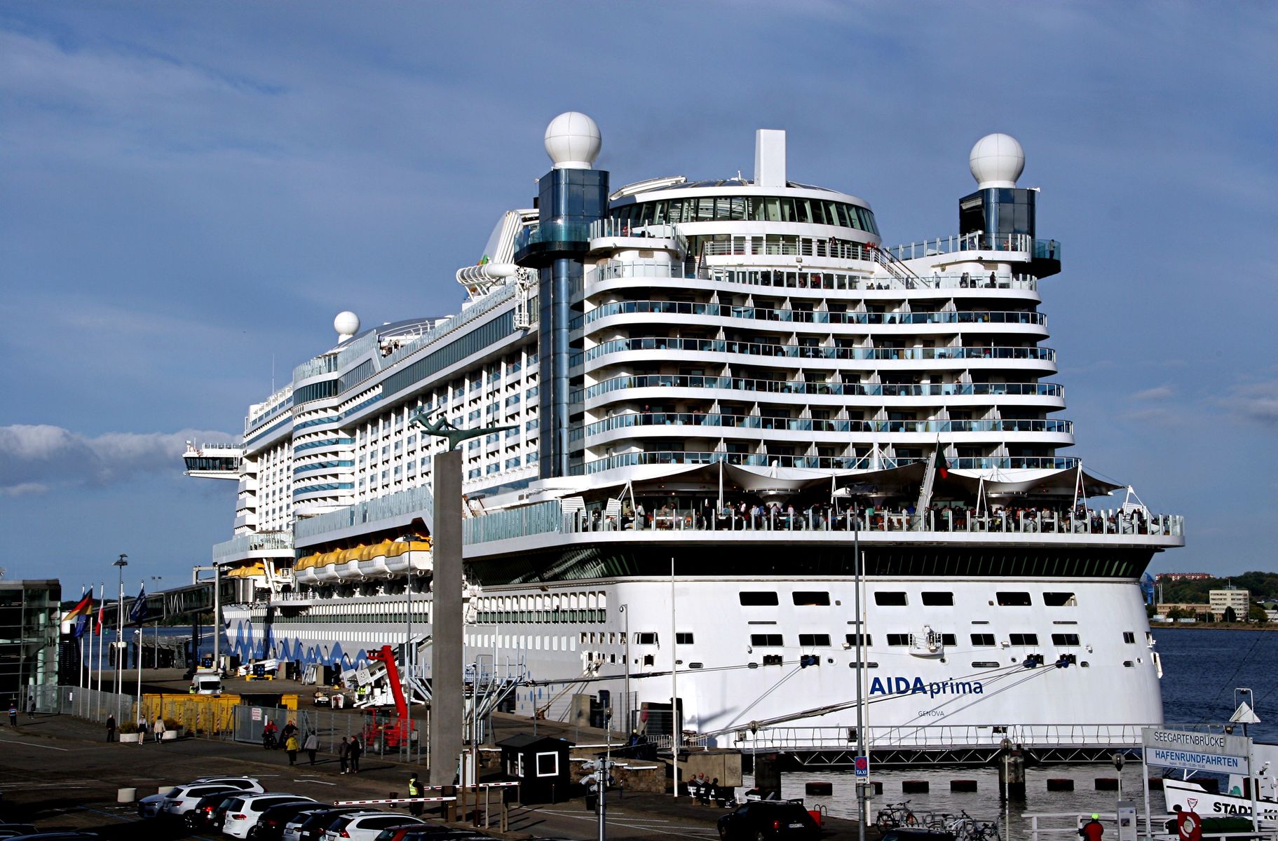 Die AIDAprima unter einem azurblauen Himmel an ihrem "Liegeplatz 27" am Ostseekai