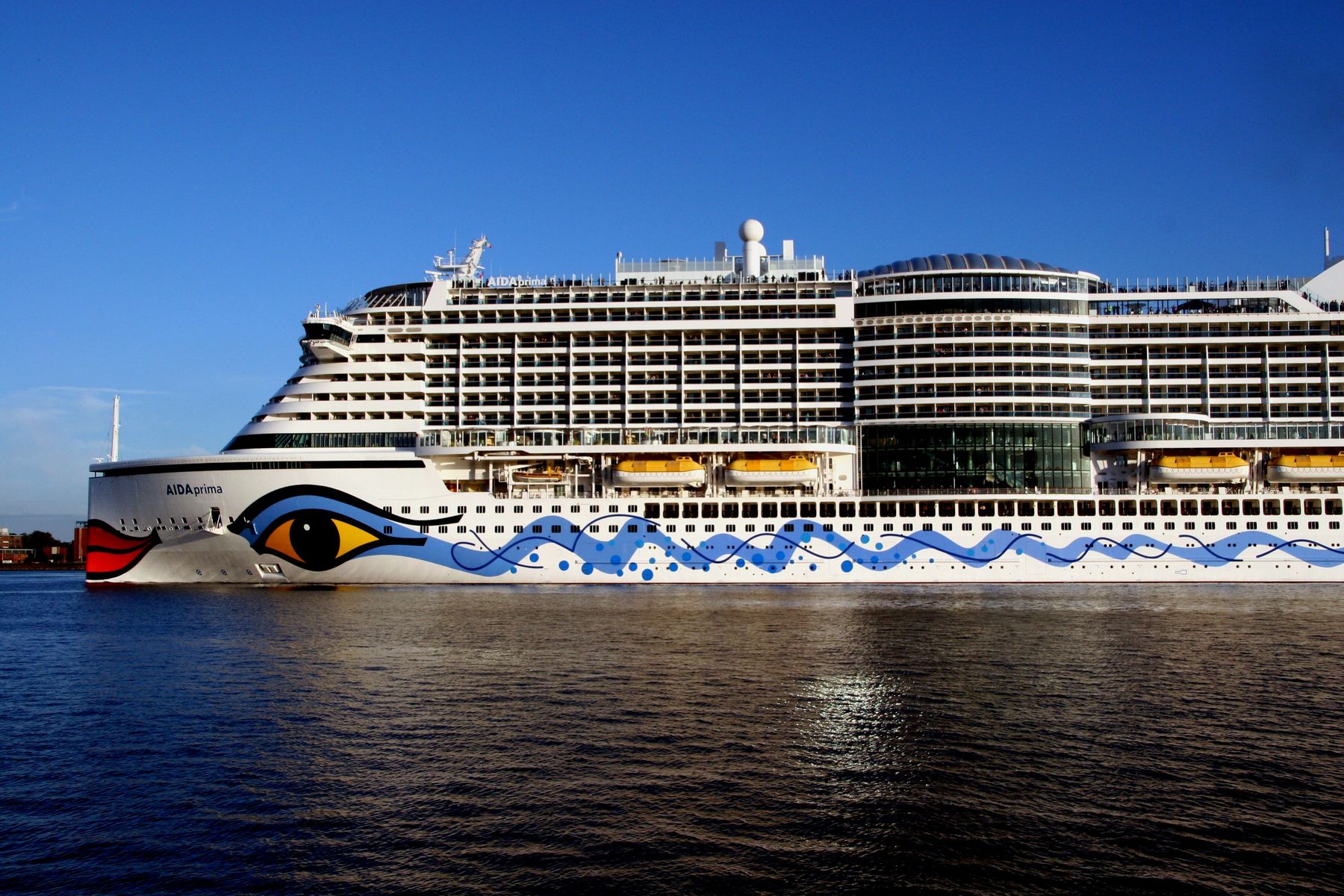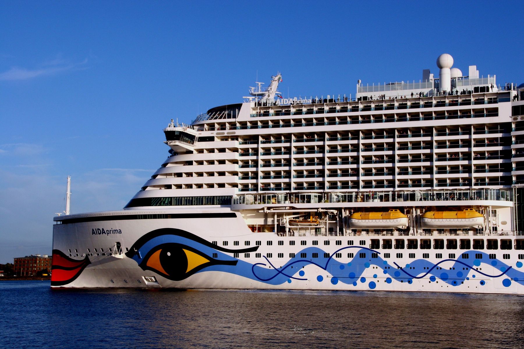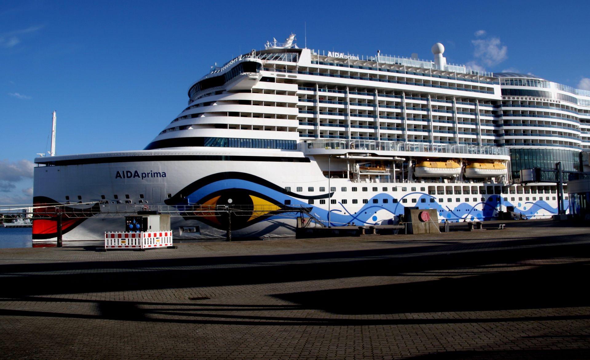 Die AIDAprima unter einem azurblauen Himmel an ihrem "Liegeplatz 27" am Ostseekai