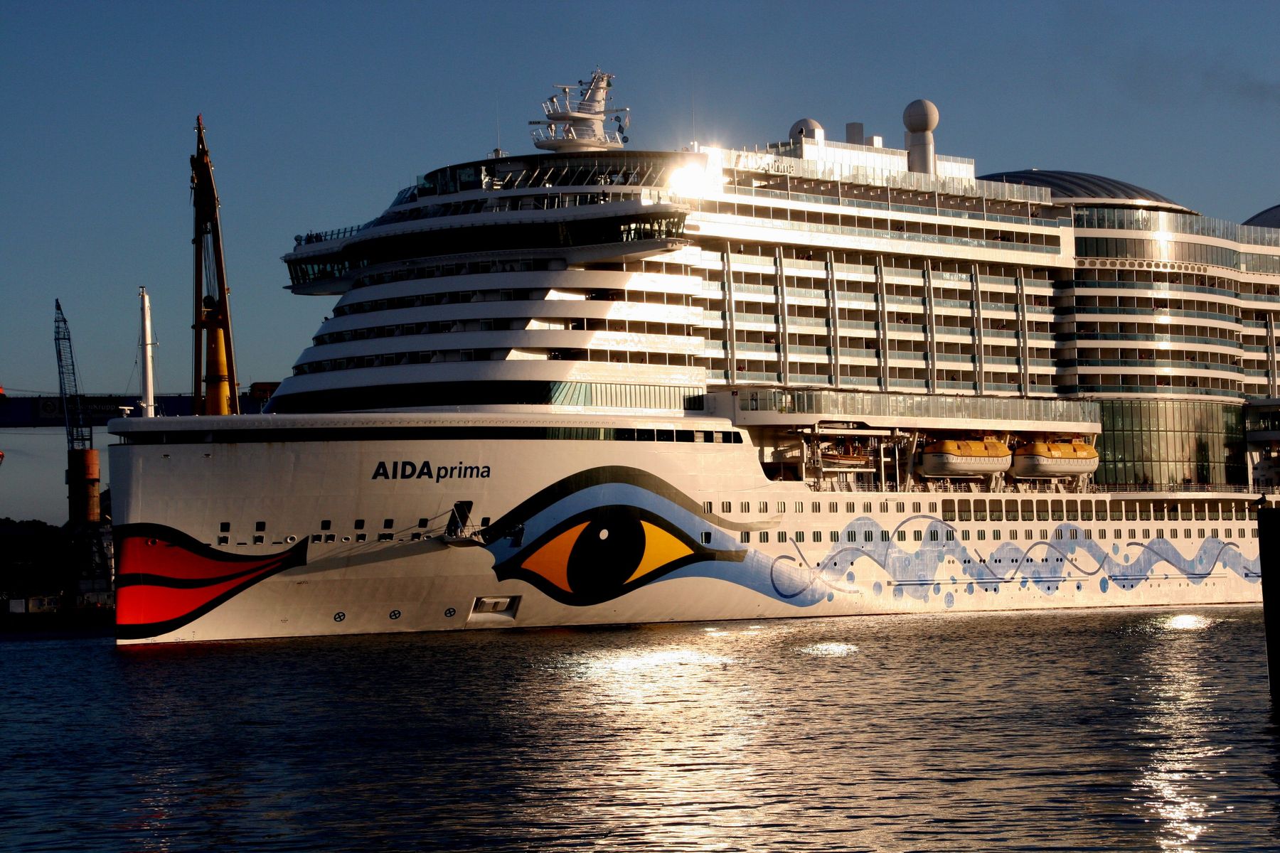Die AIDAprima fährt in leuchtender Eleganz ihr Auslaufmanöver auf der "Kieler Förde"