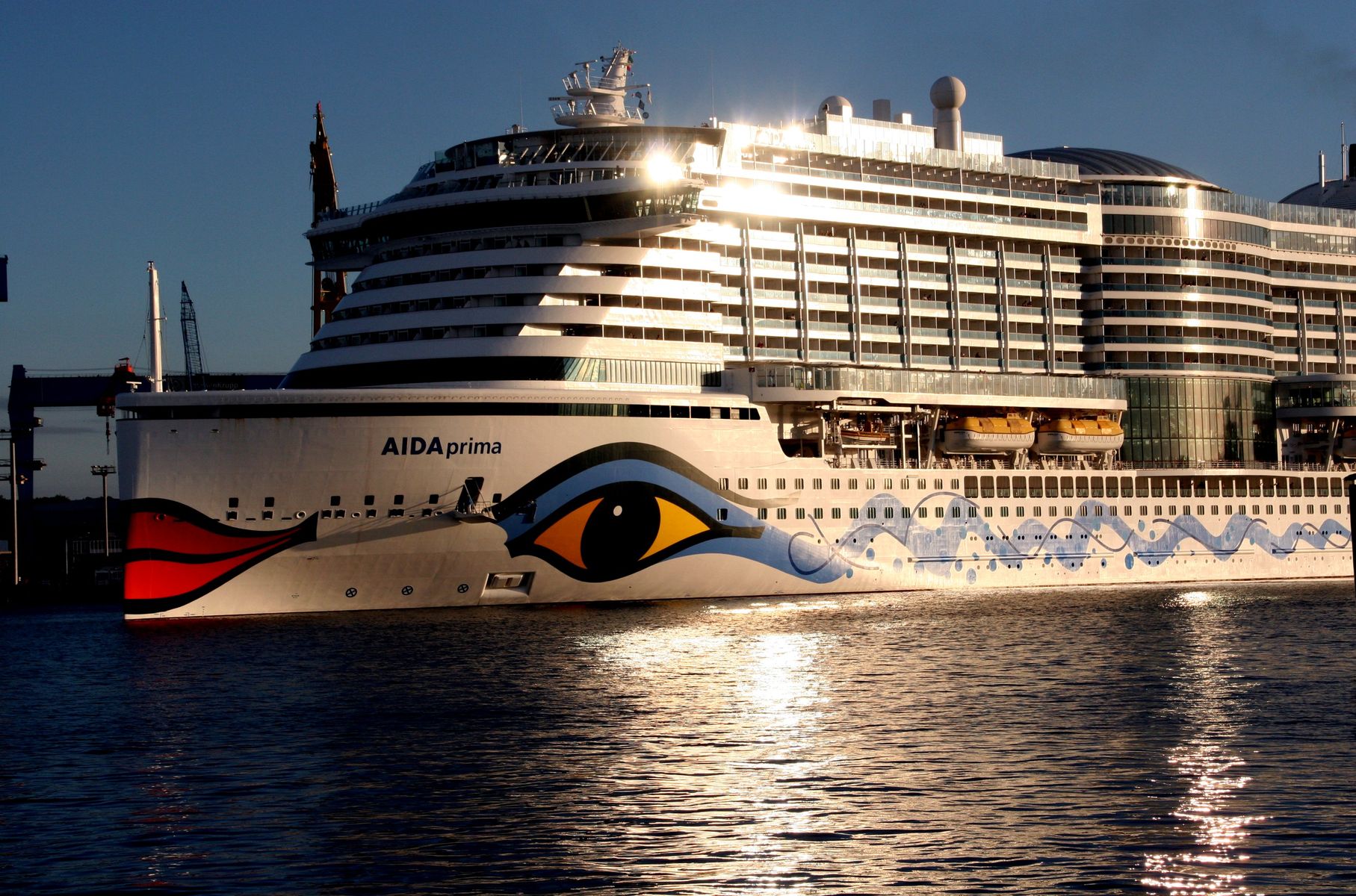 Die AIDAprima in stimmungsvoller/abendlicher Atmosphäre der untergehenden Sonne während ihrem Auslaufmanöver auf der "Kieler Förde"