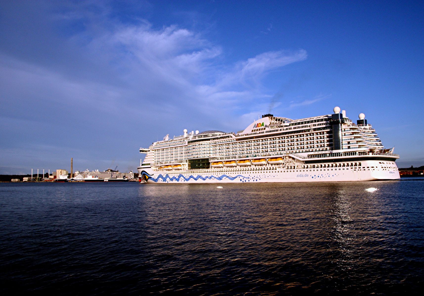 Die AIDAprima fährt unter einem azurblauen Himmel mit einem "Lichterglanz" der untergehenden Sonne ihr Auslaufmanöver auf der "Kieler Förde"