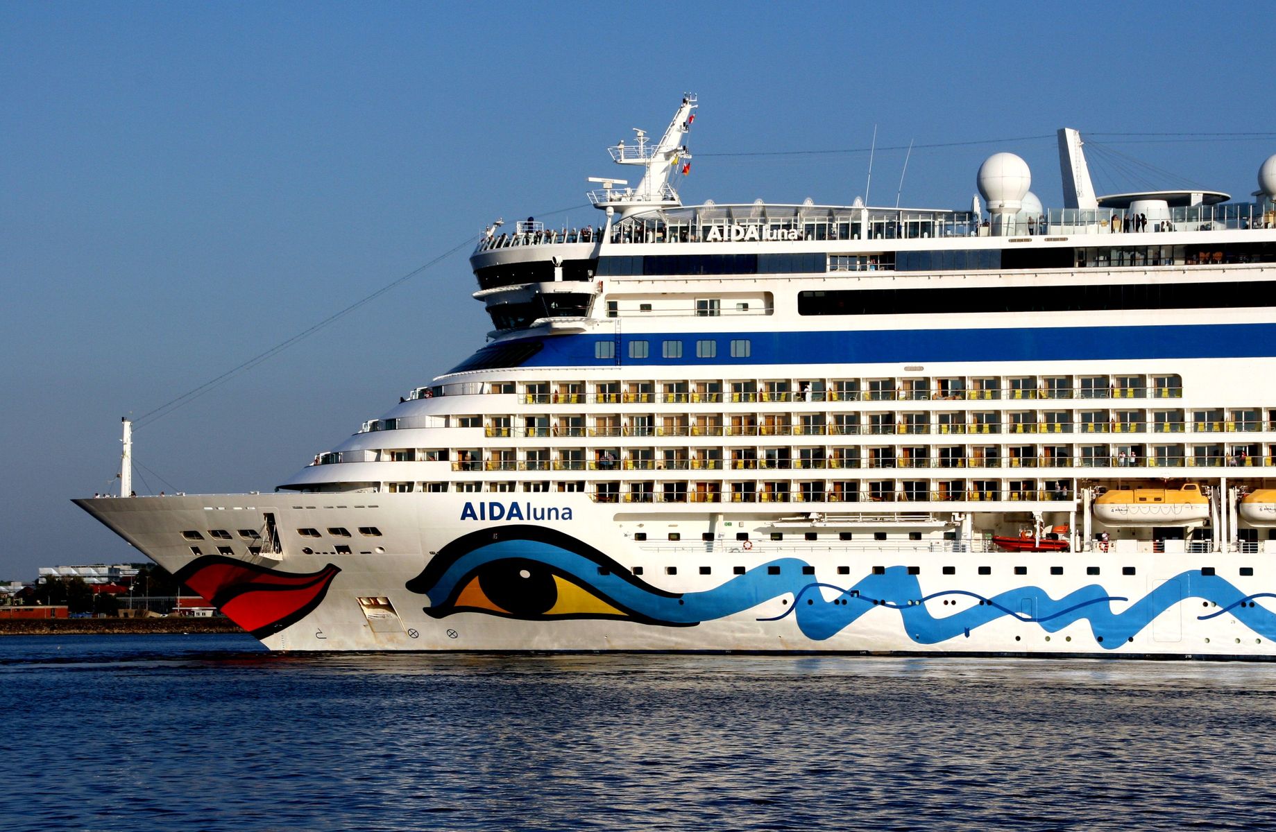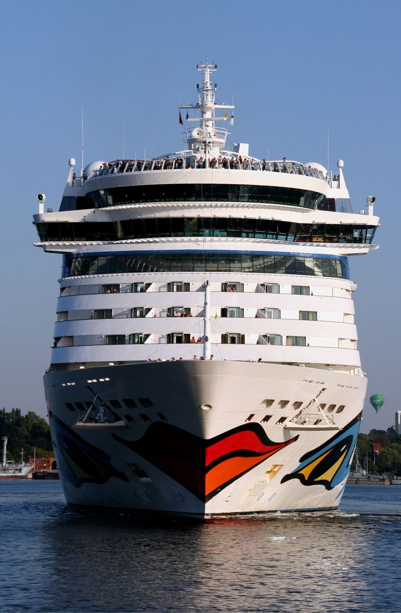 Die AIDAluna dreht unter einem azurblauen Himmel vor der Flaniermeile "Kiellinie" auf dem "Teller"