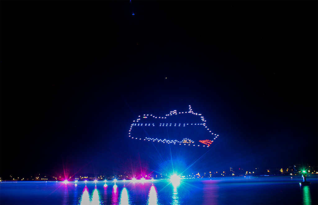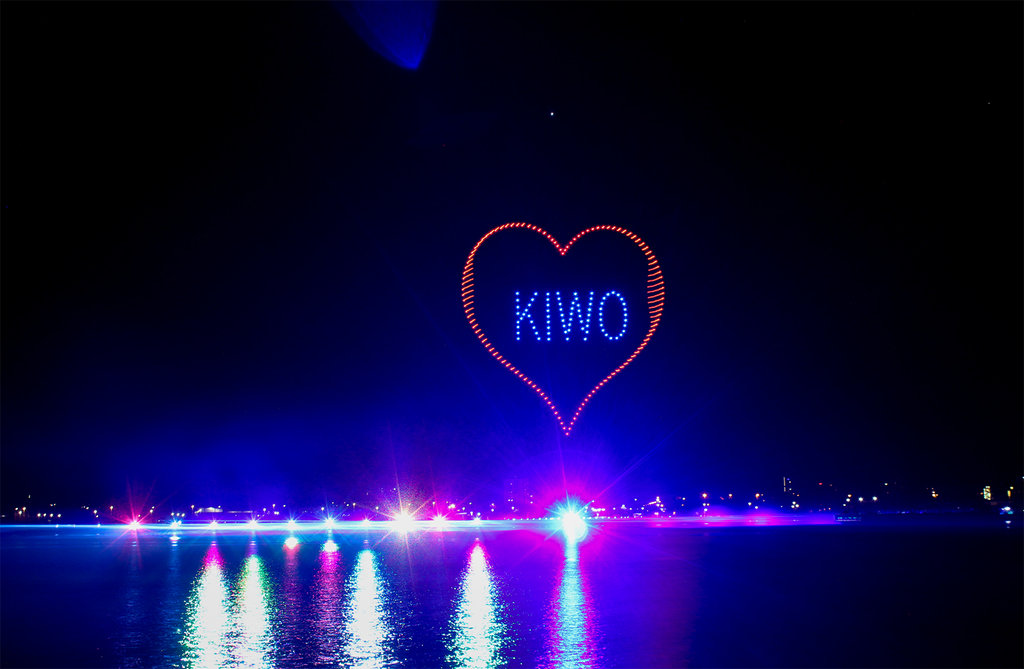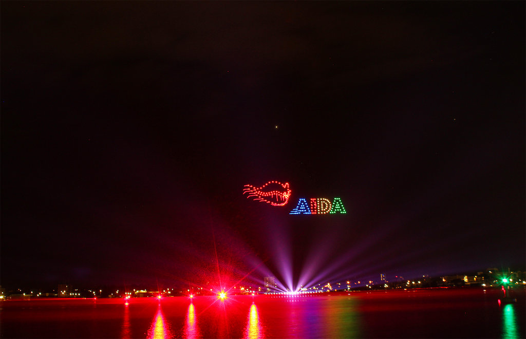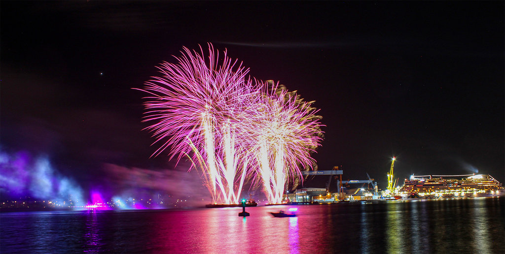 Die AIDAprima fährt in leuchtender Eleganz ihr Auslaufmanöver auf der "Kieler Förde"