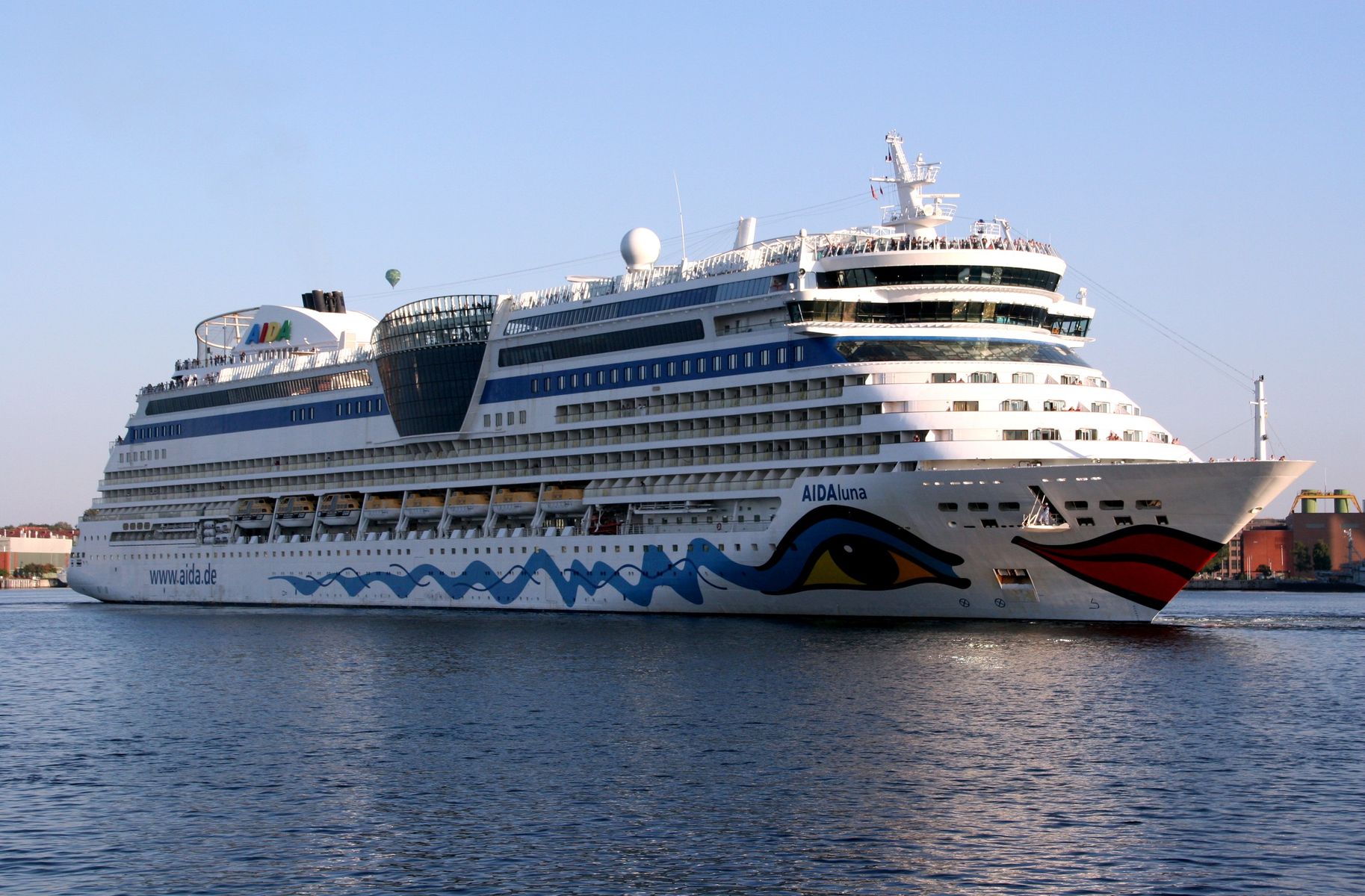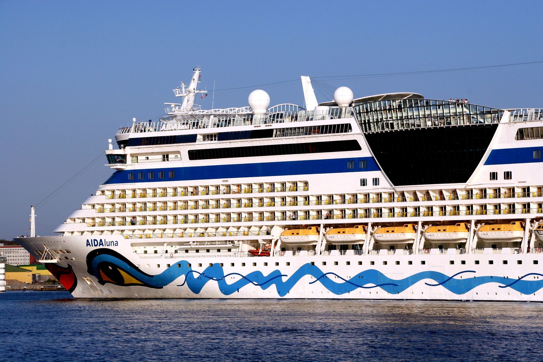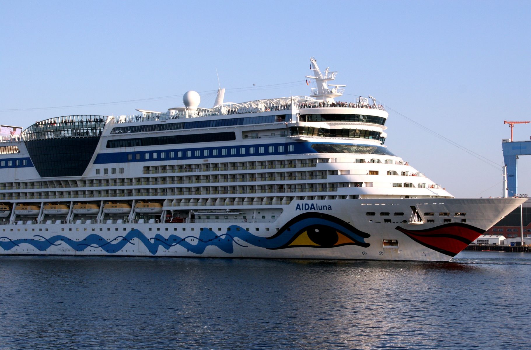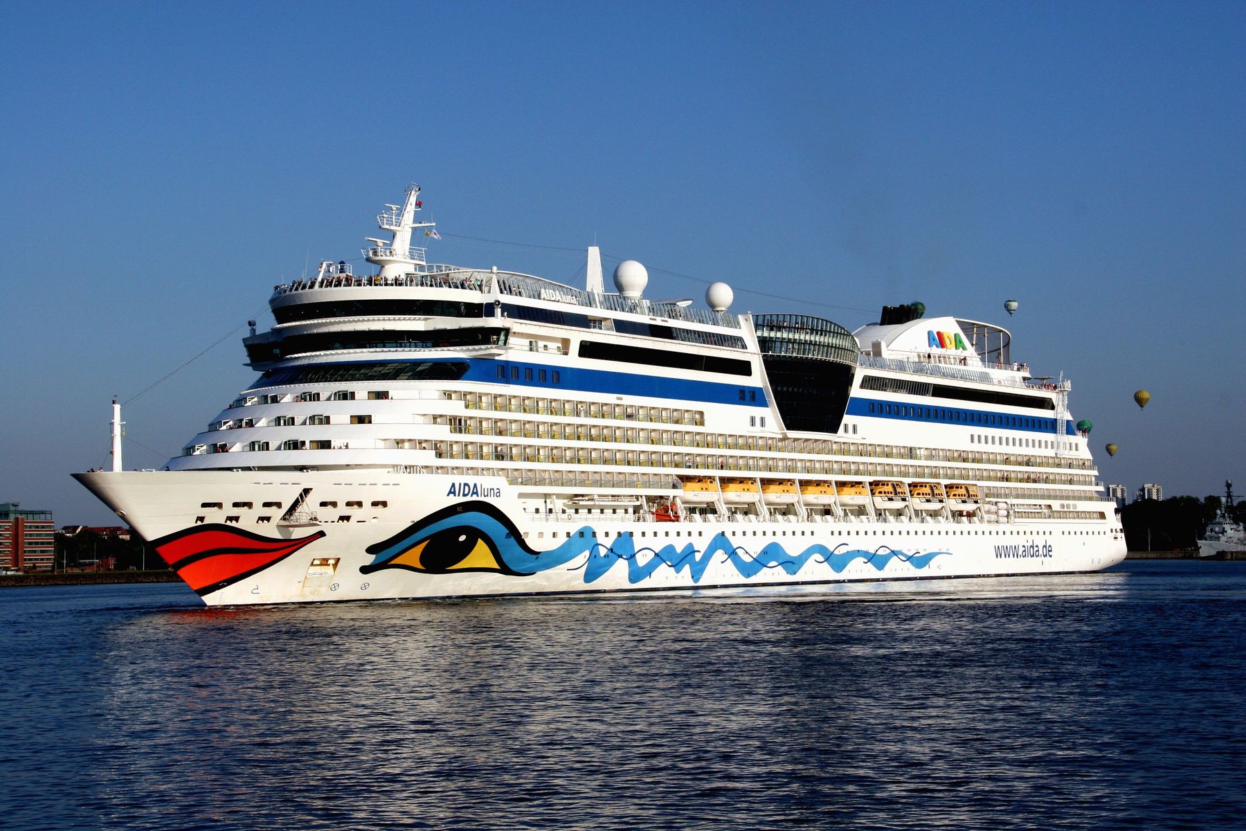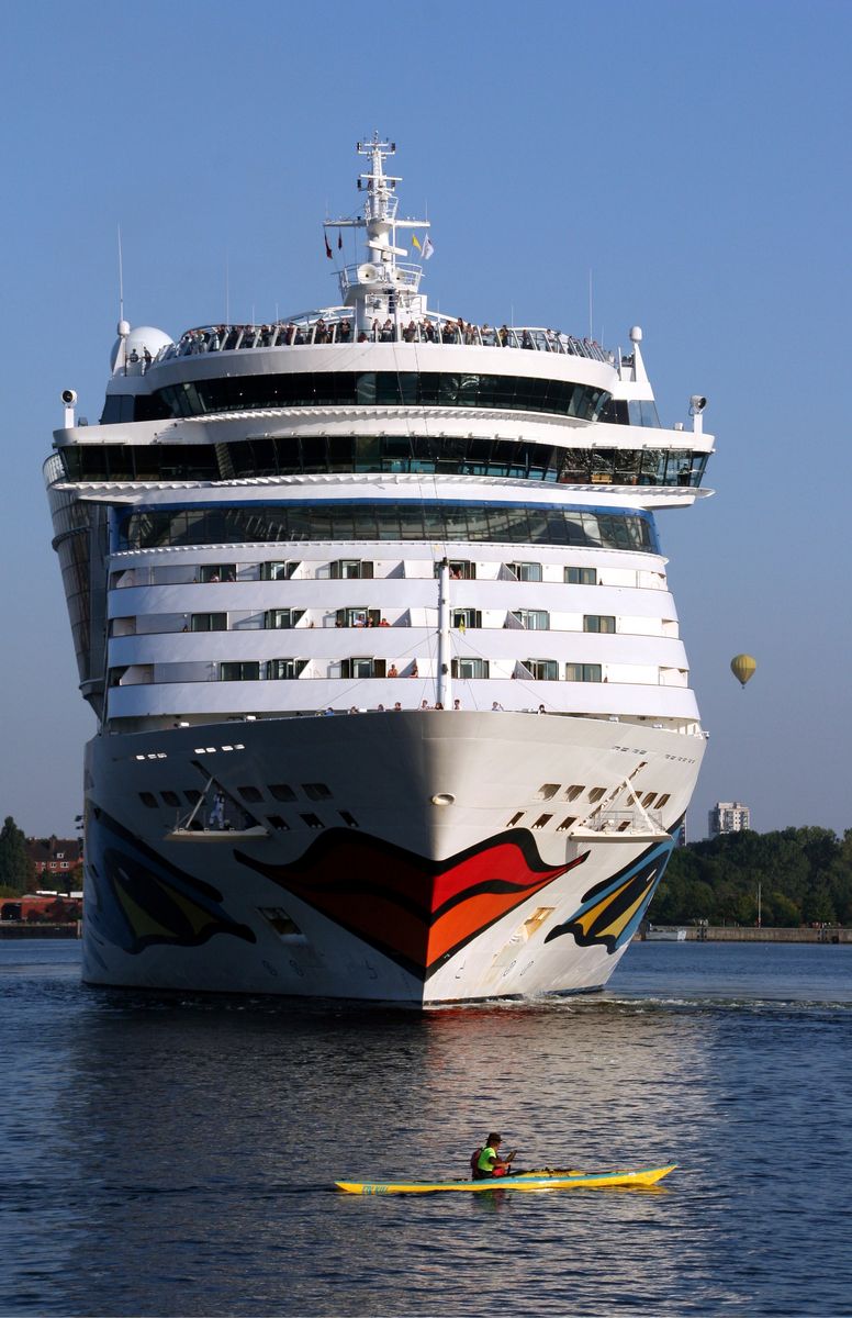 Die AIDAluna dreht unter einem azurblauen Himmel vor der Flaniermeile "Kiellinie" auf dem "Teller"