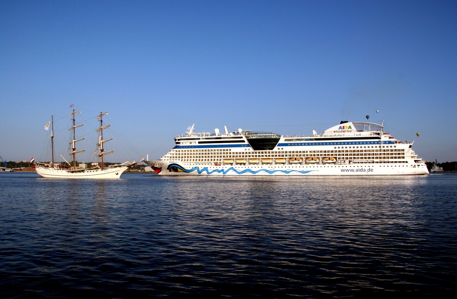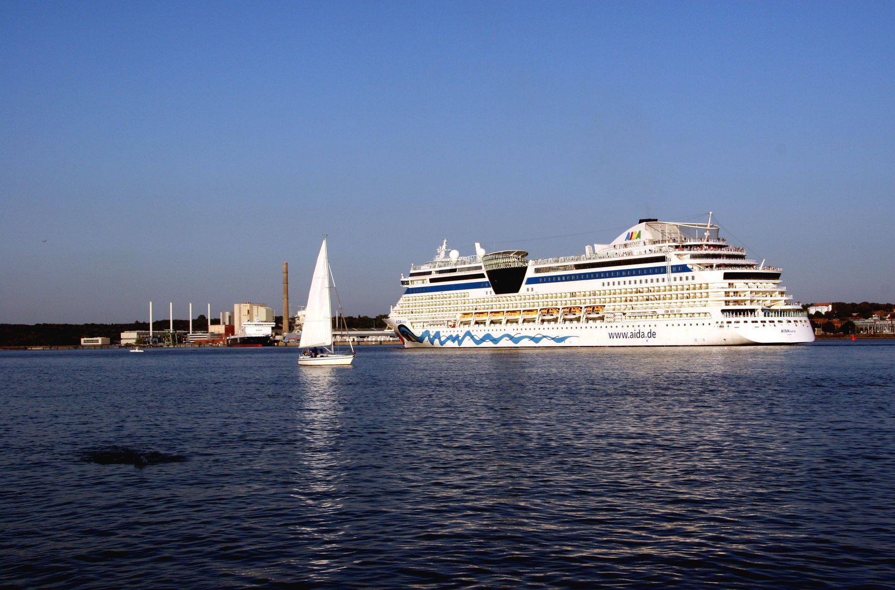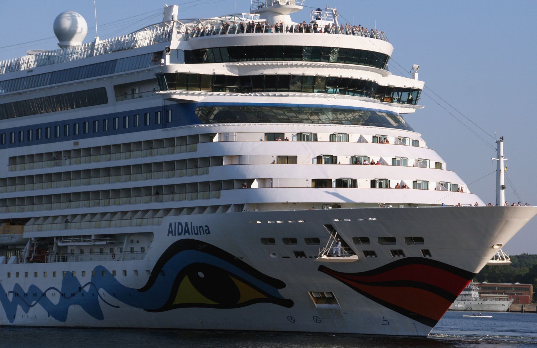 Die AIDAluna fährt unter einem azurblauen Himmel ihre Revierfahrt auf der "Kieler Förde"