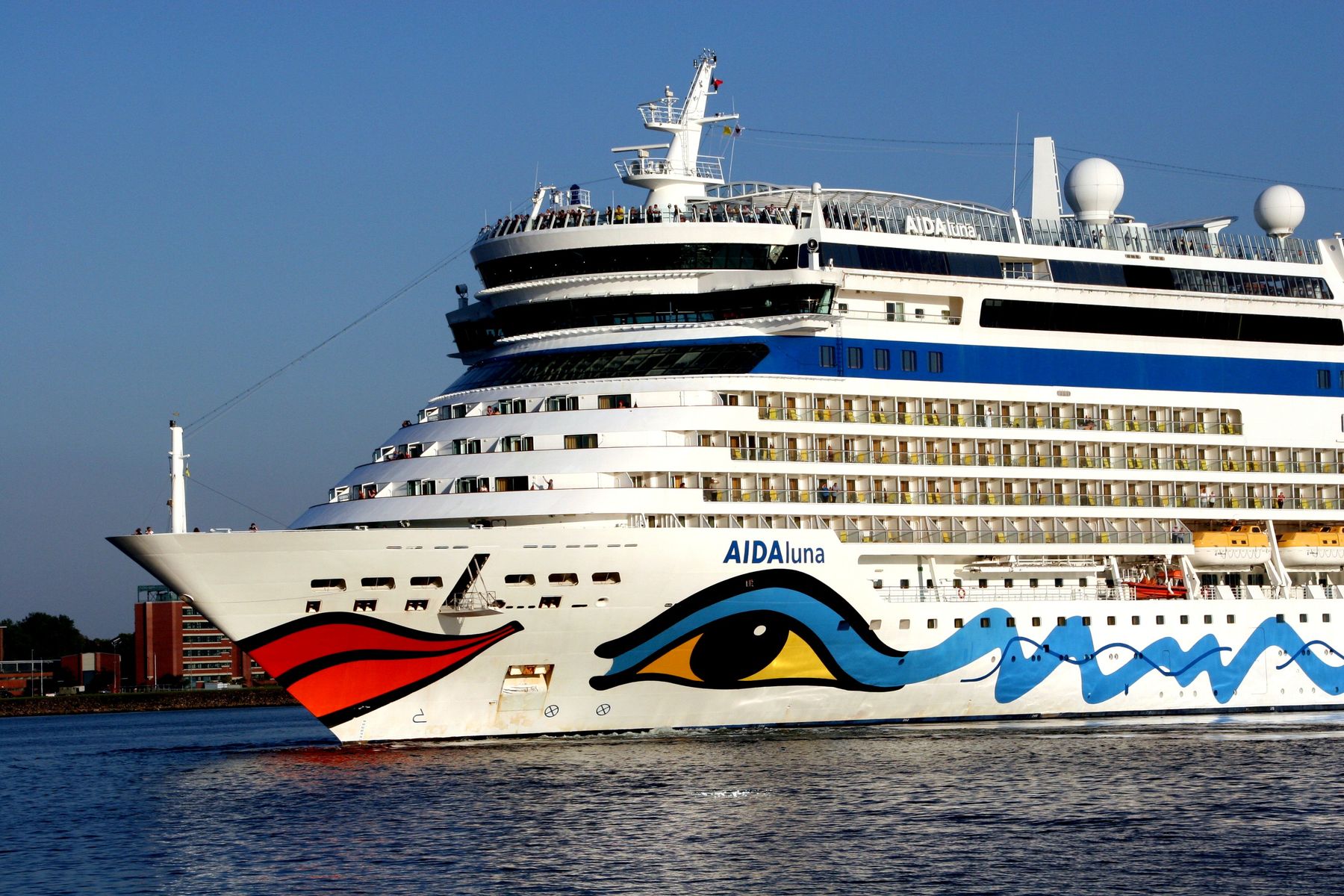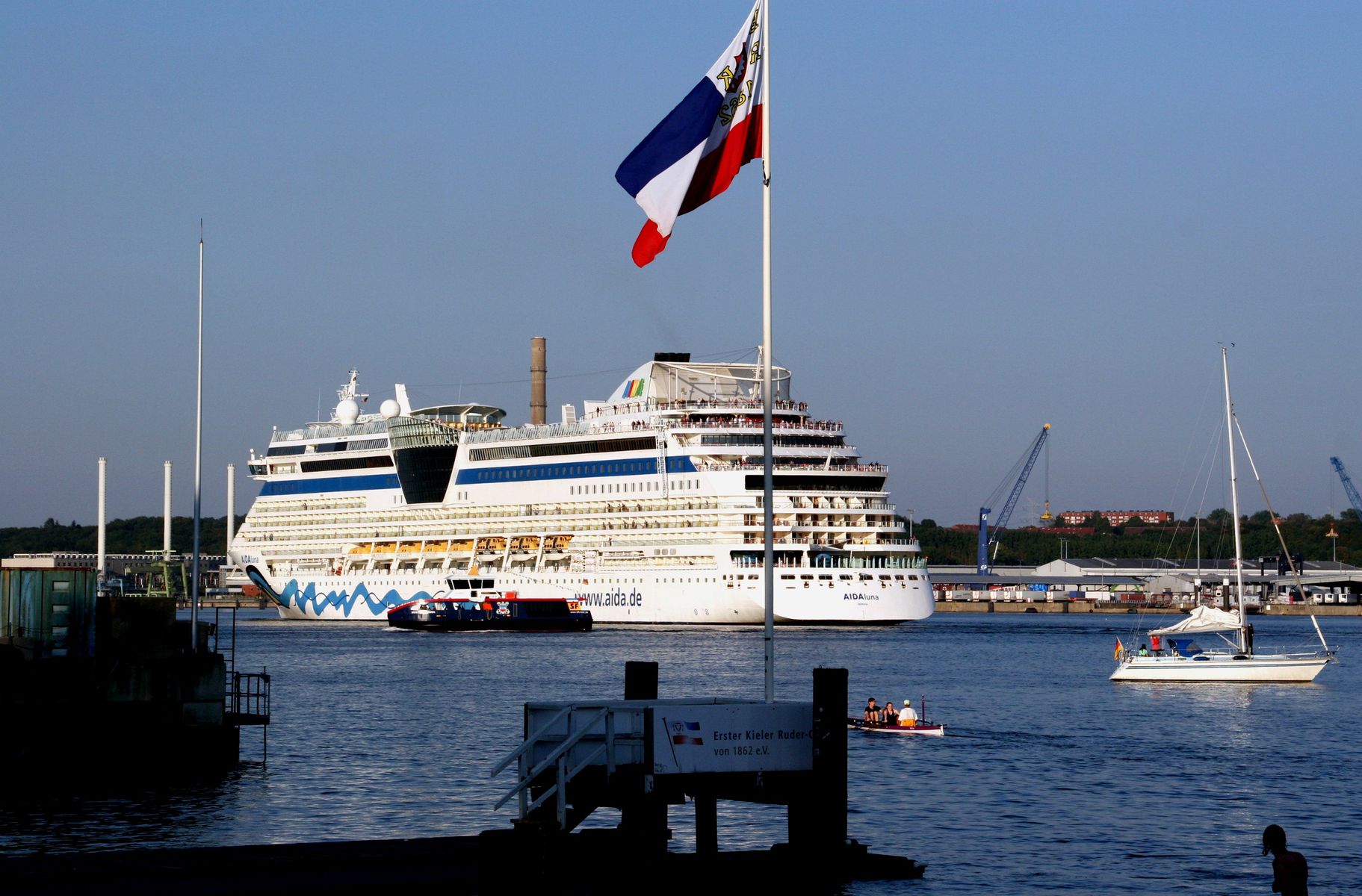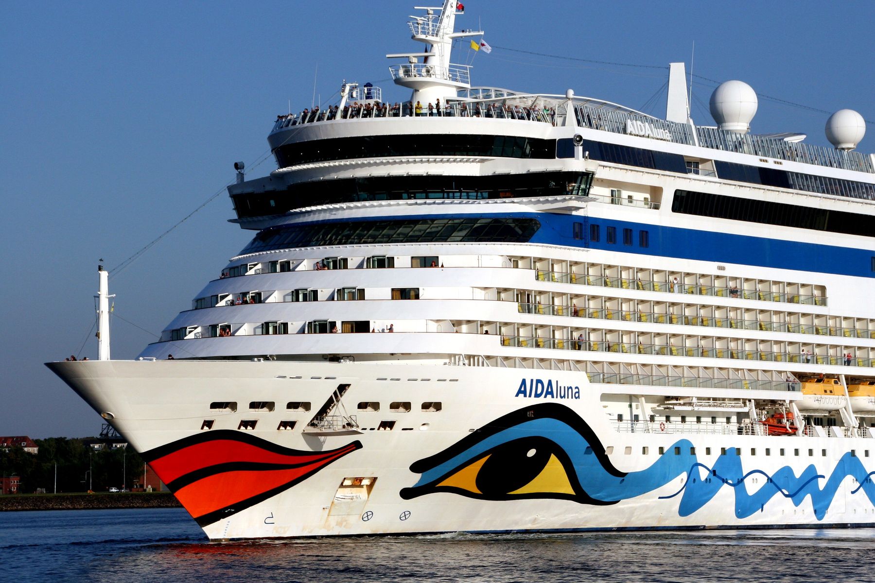 Die AIDAluna fährt unter einem azurblauen Himmel ihre Revierfahrt auf der "Kieler Förde"