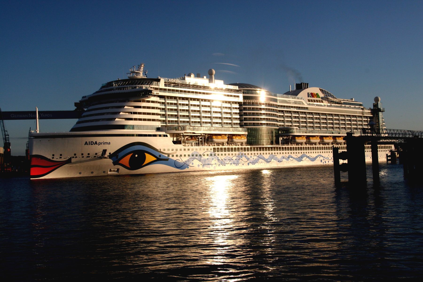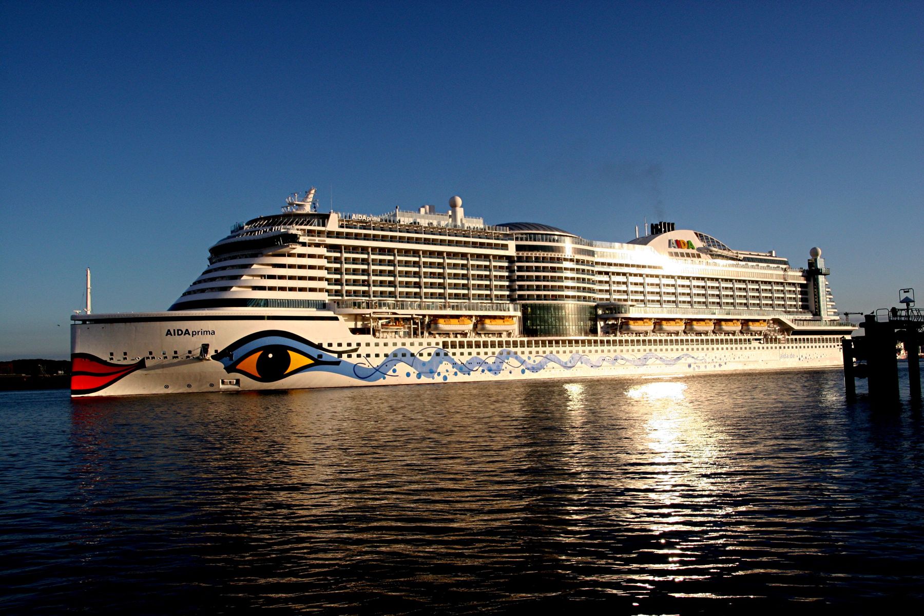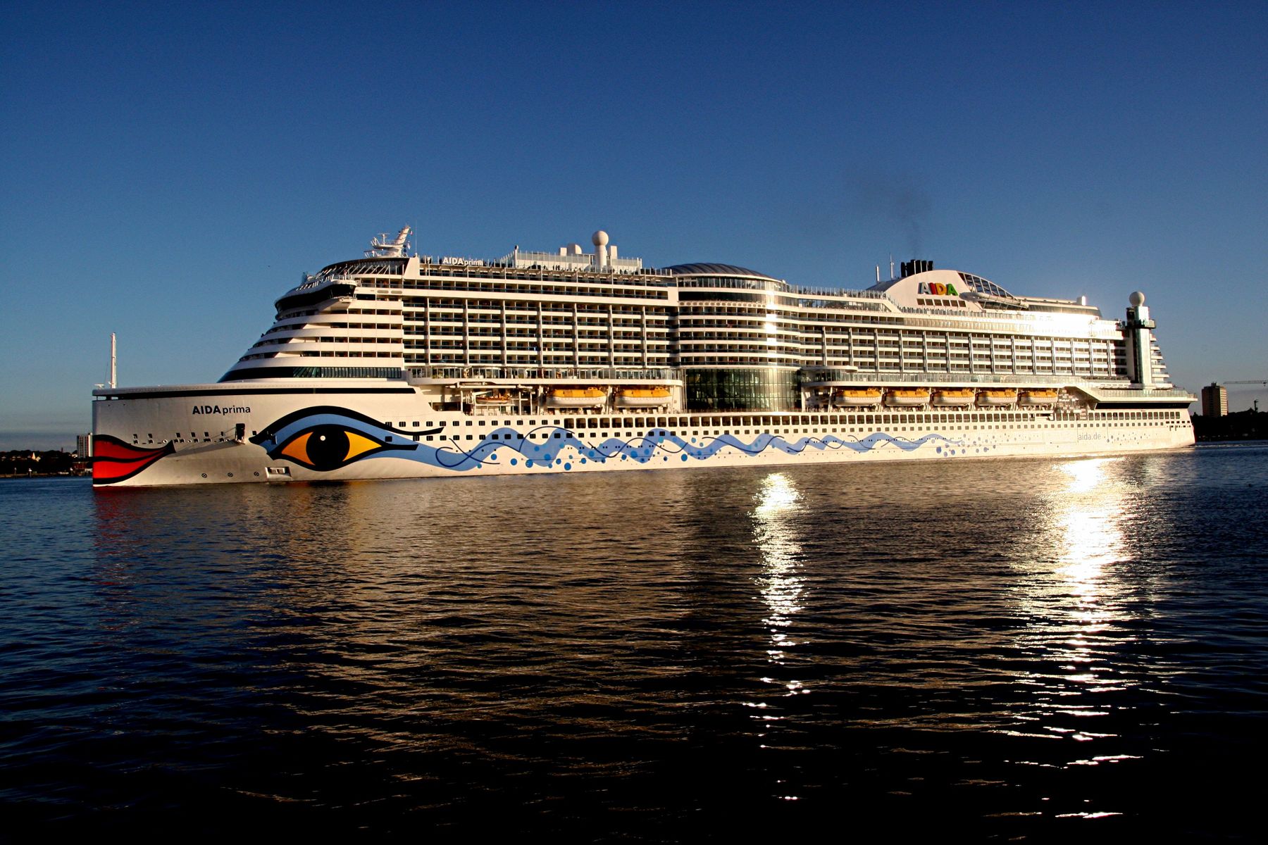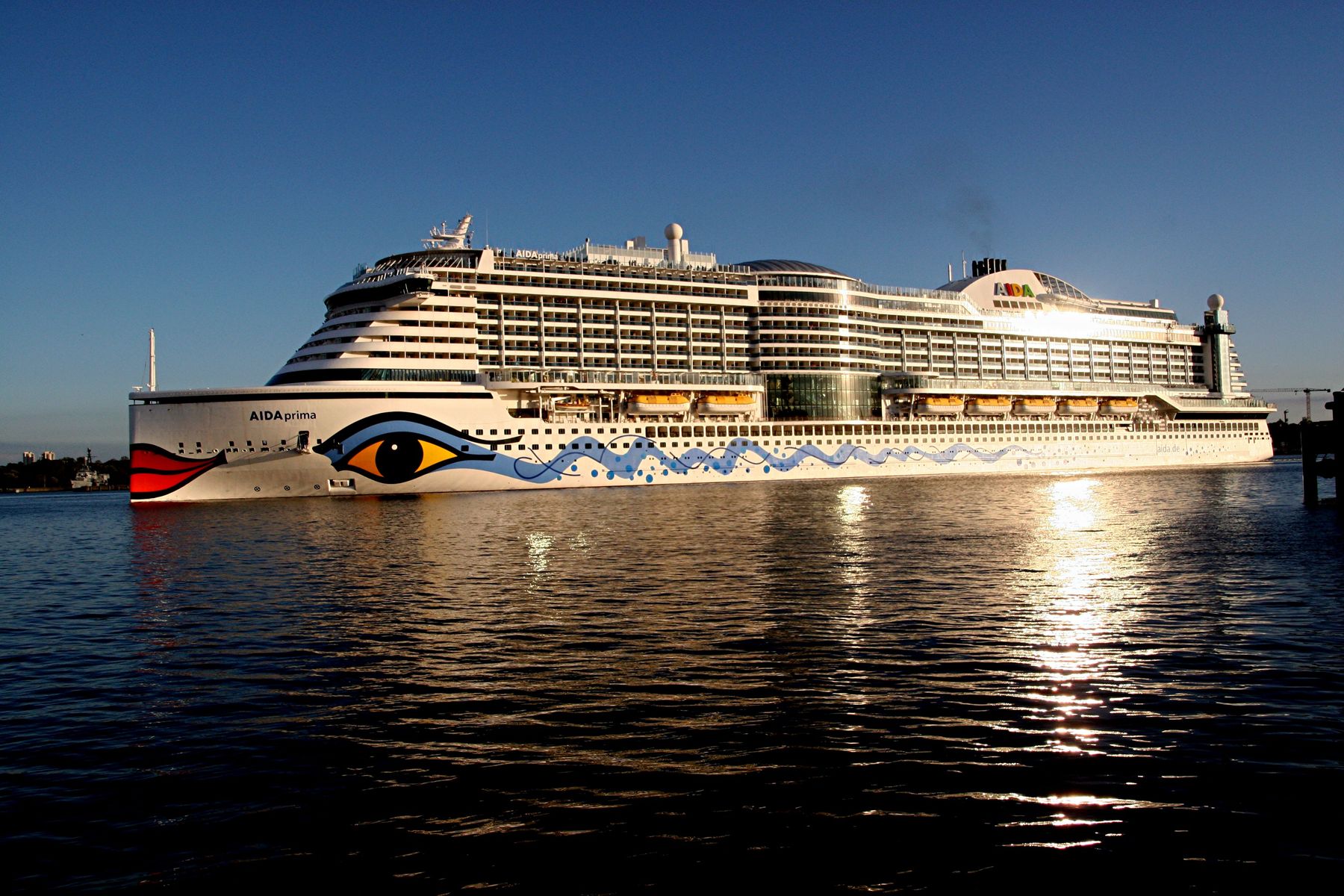 Die AIDAprima fährt unter einem azurblauen Himmel mit einem "Lichterglanz" der untergehenden Sonne ihr Auslaufmanöver auf der "Kieler Förde"