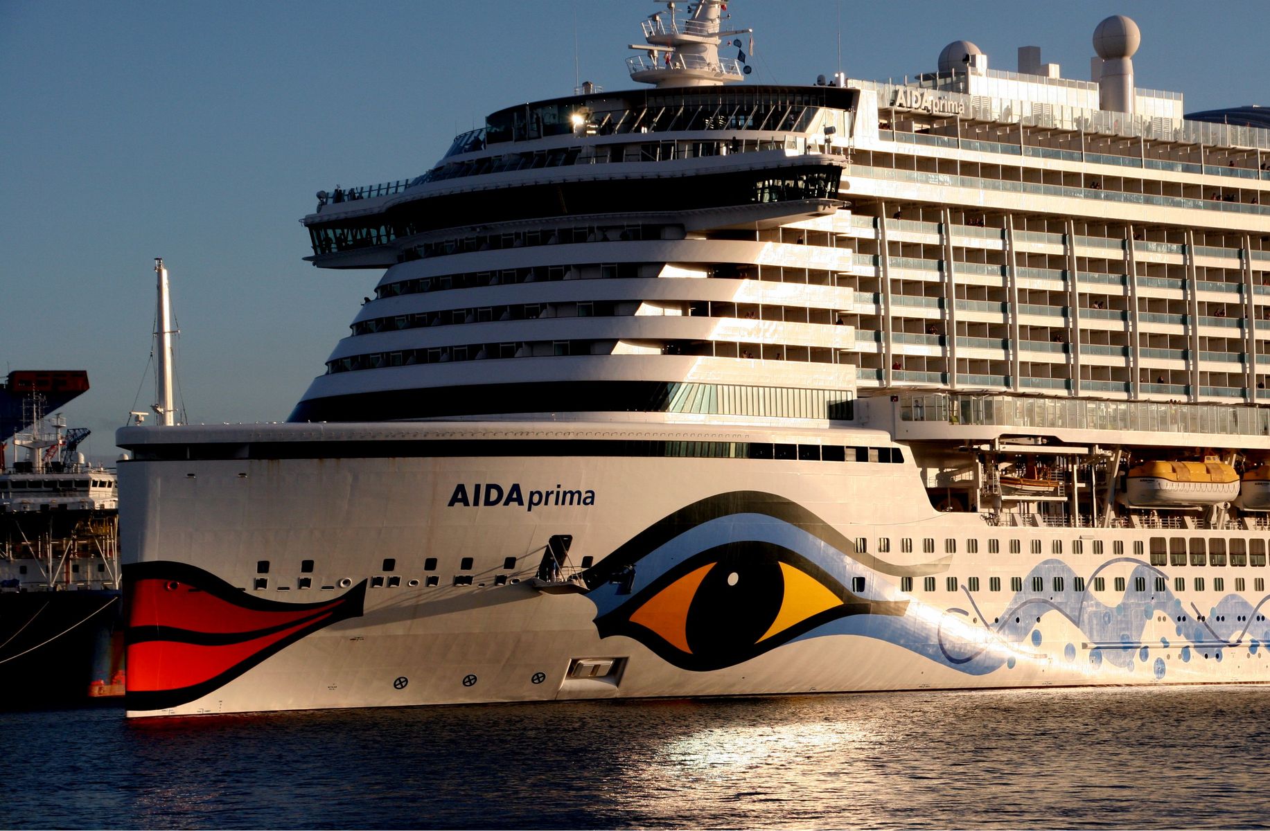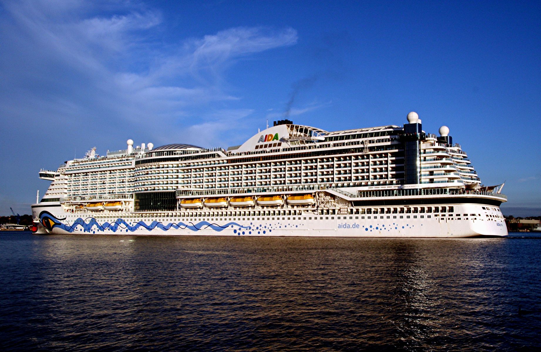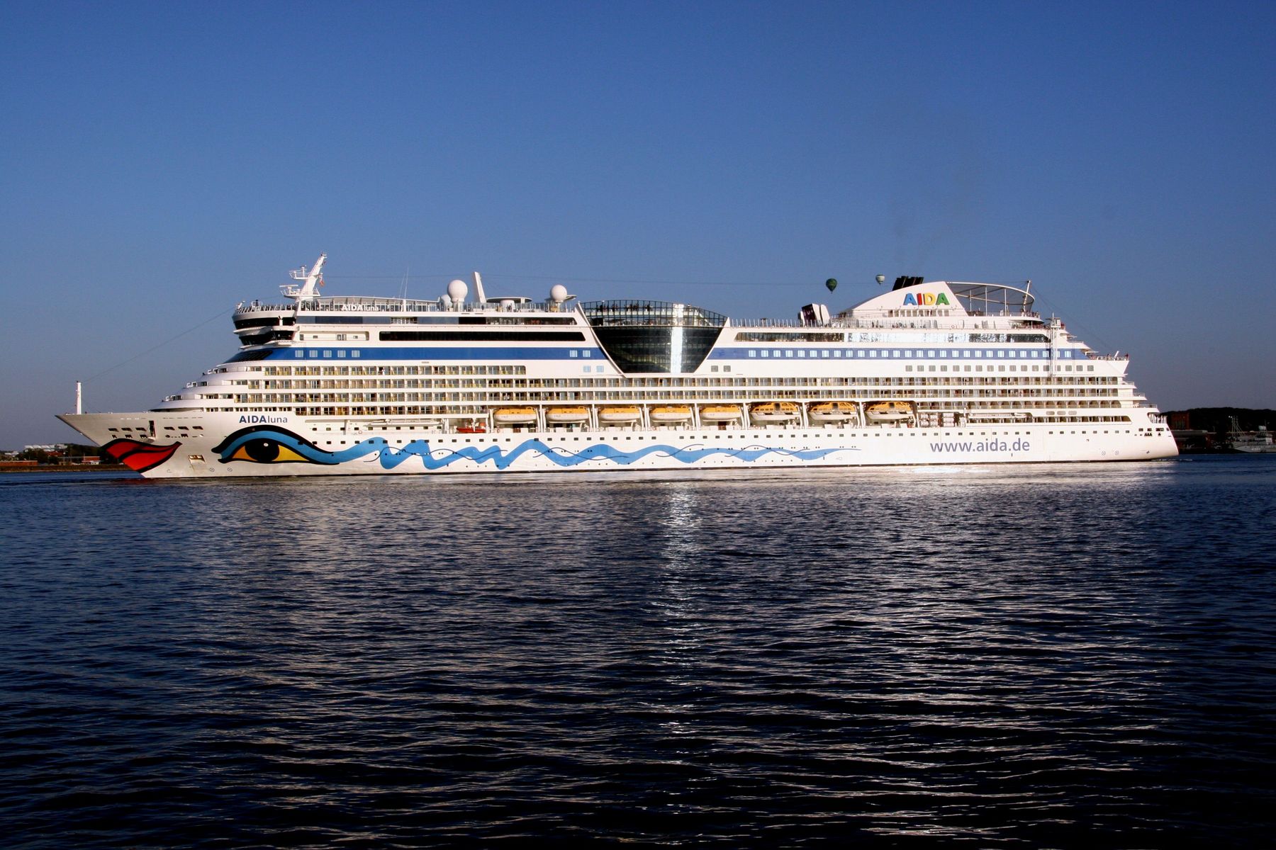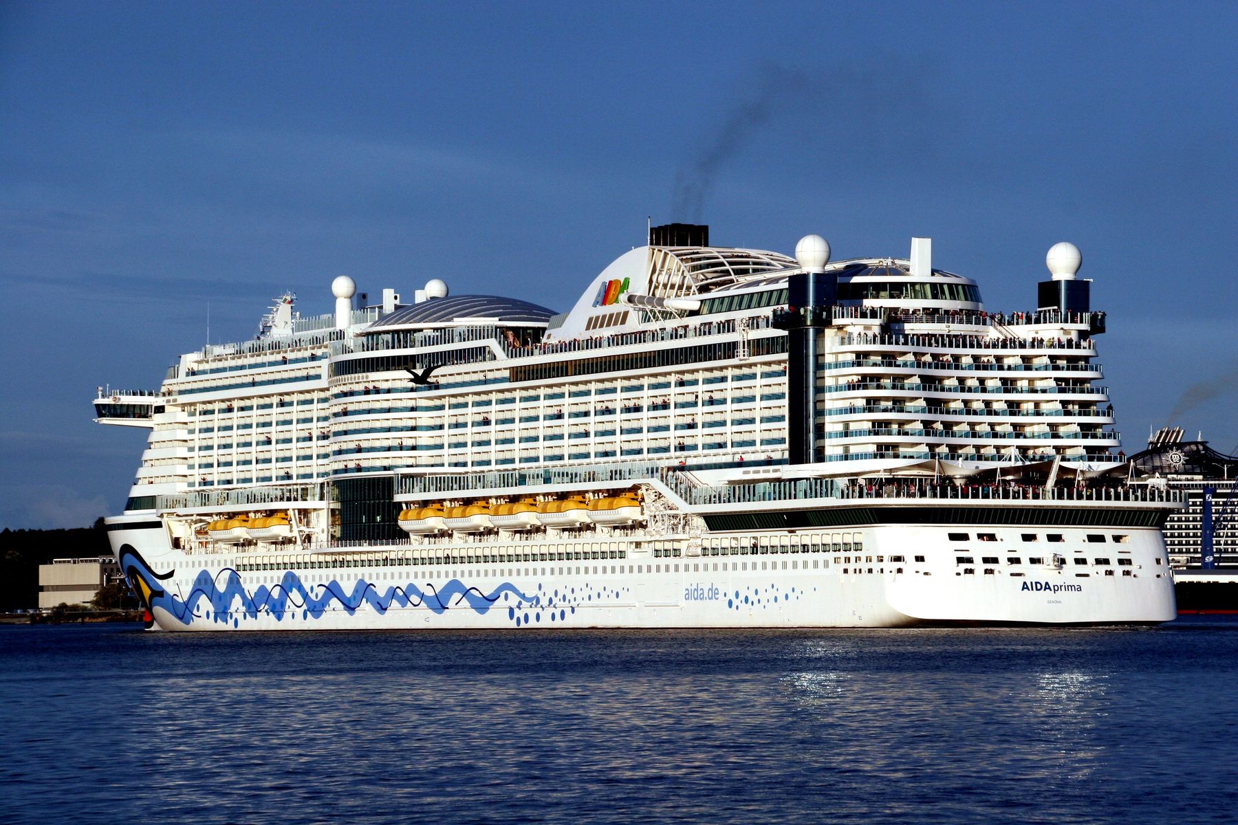 Die AIDAprima fährt unter einem azurblauen Himmel mit einem "Lichterglanz" der untergehenden Sonne ihr Auslaufmanöver auf der "Kieler Förde"