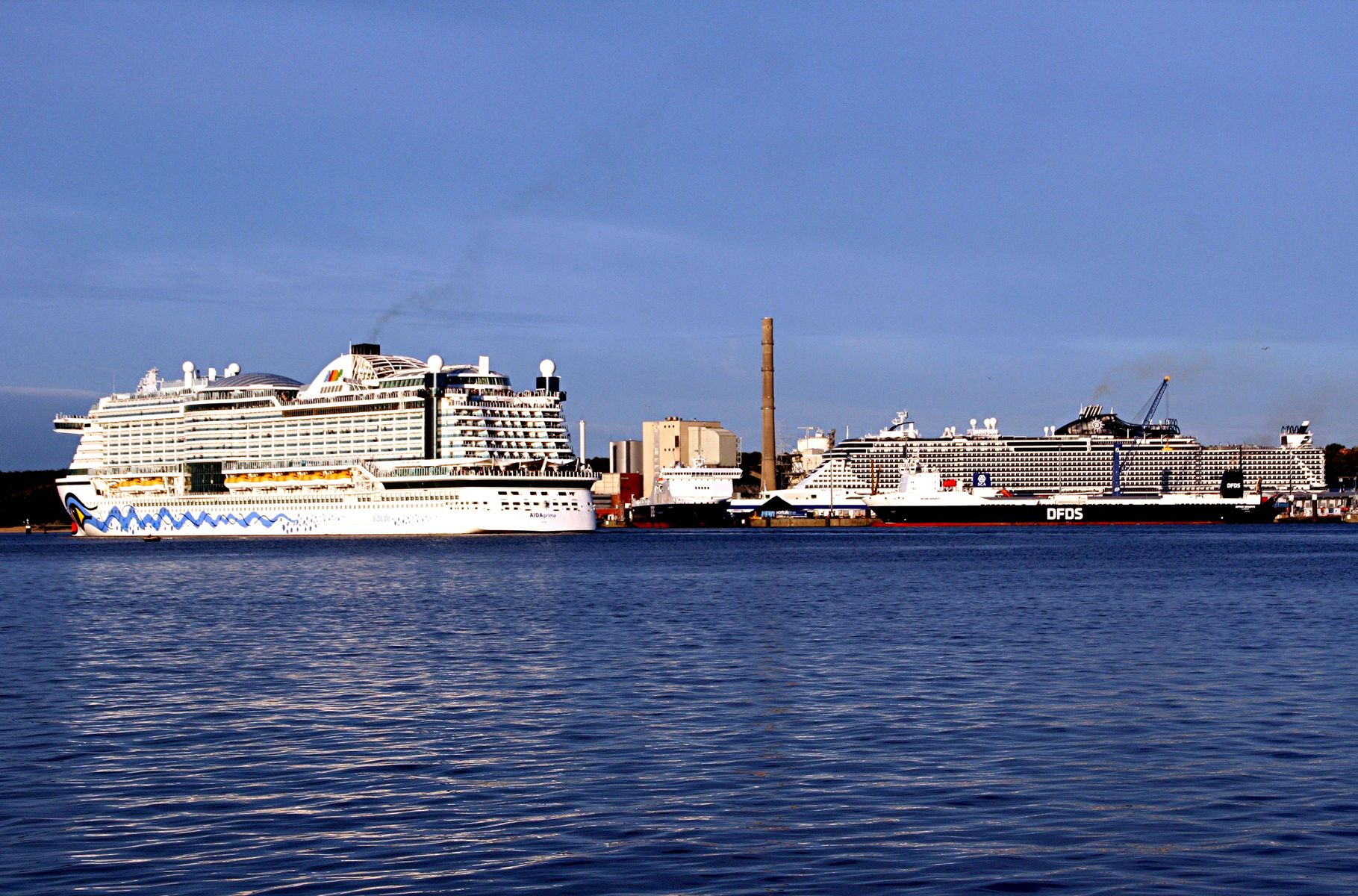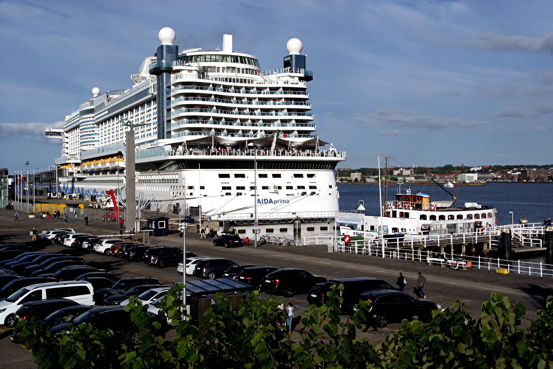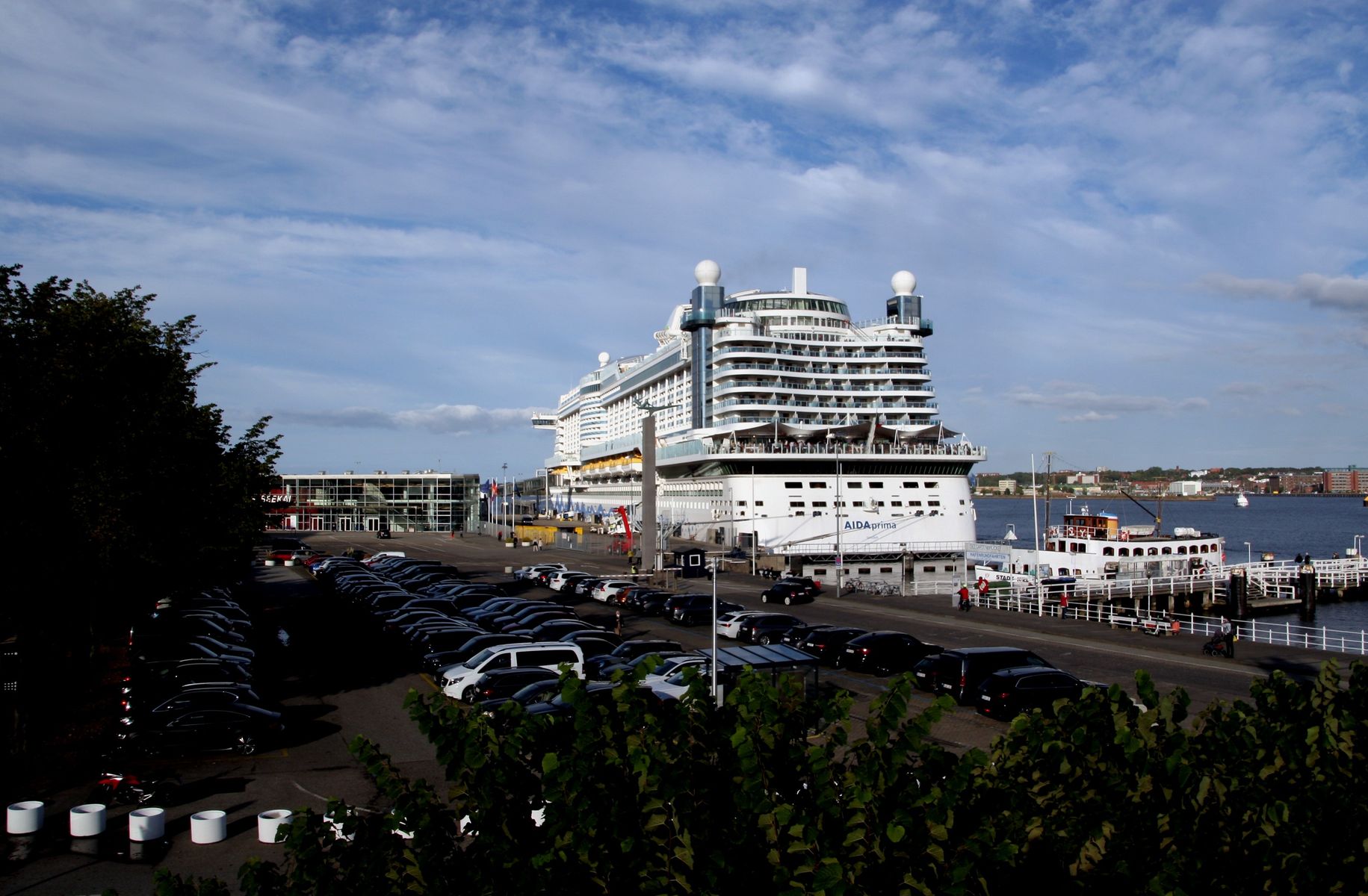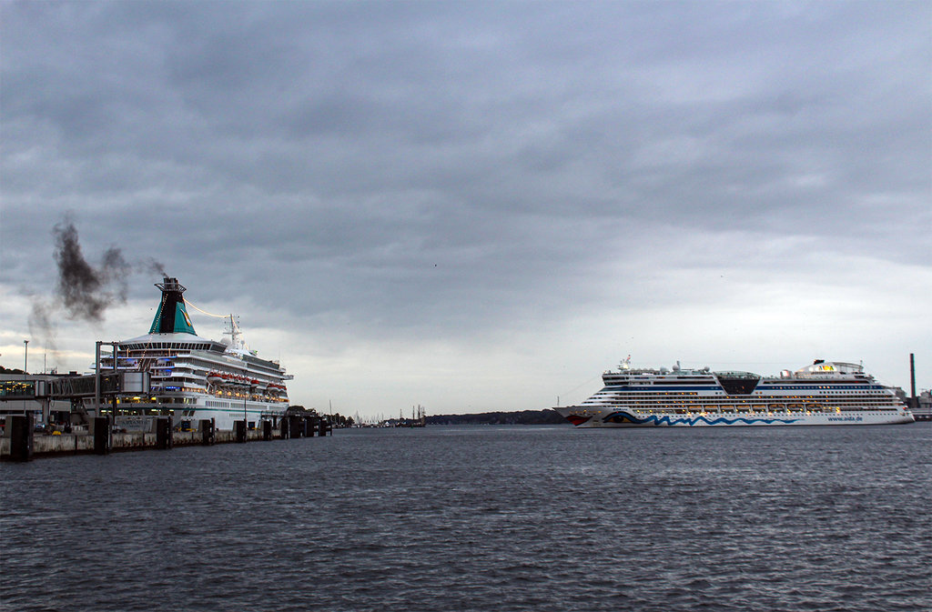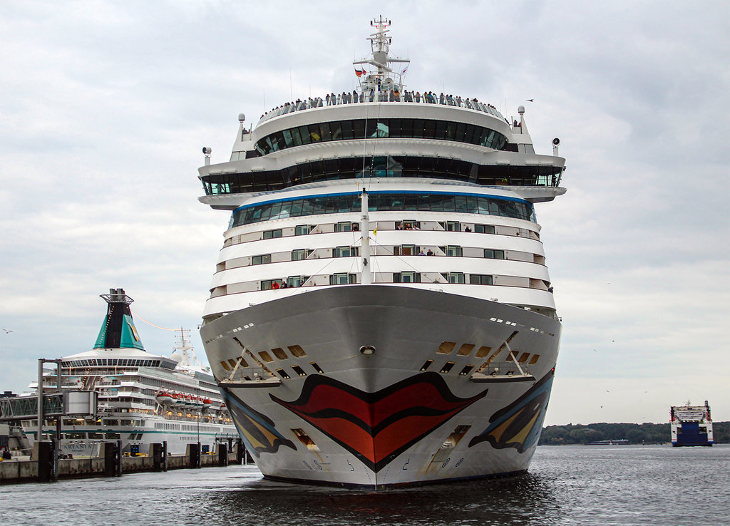 Die AIDAprima wartet am Ostseekai ganz geduldig auf das Auslaufmanöver der "Stena Germanica"