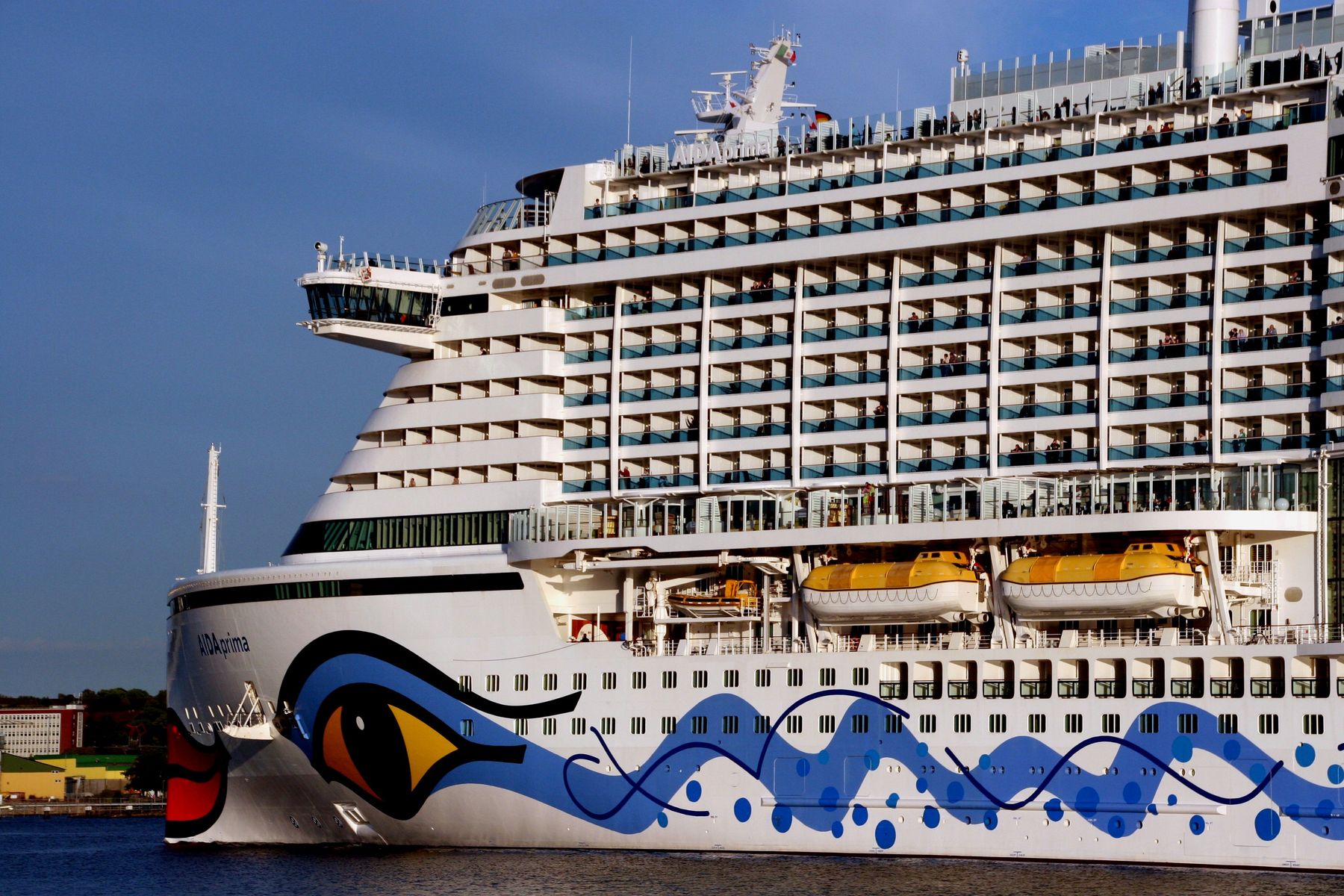 Die AIDAprima unter einem azurblauen Himmel an ihrem "Liegeplatz 27" am Ostseekai