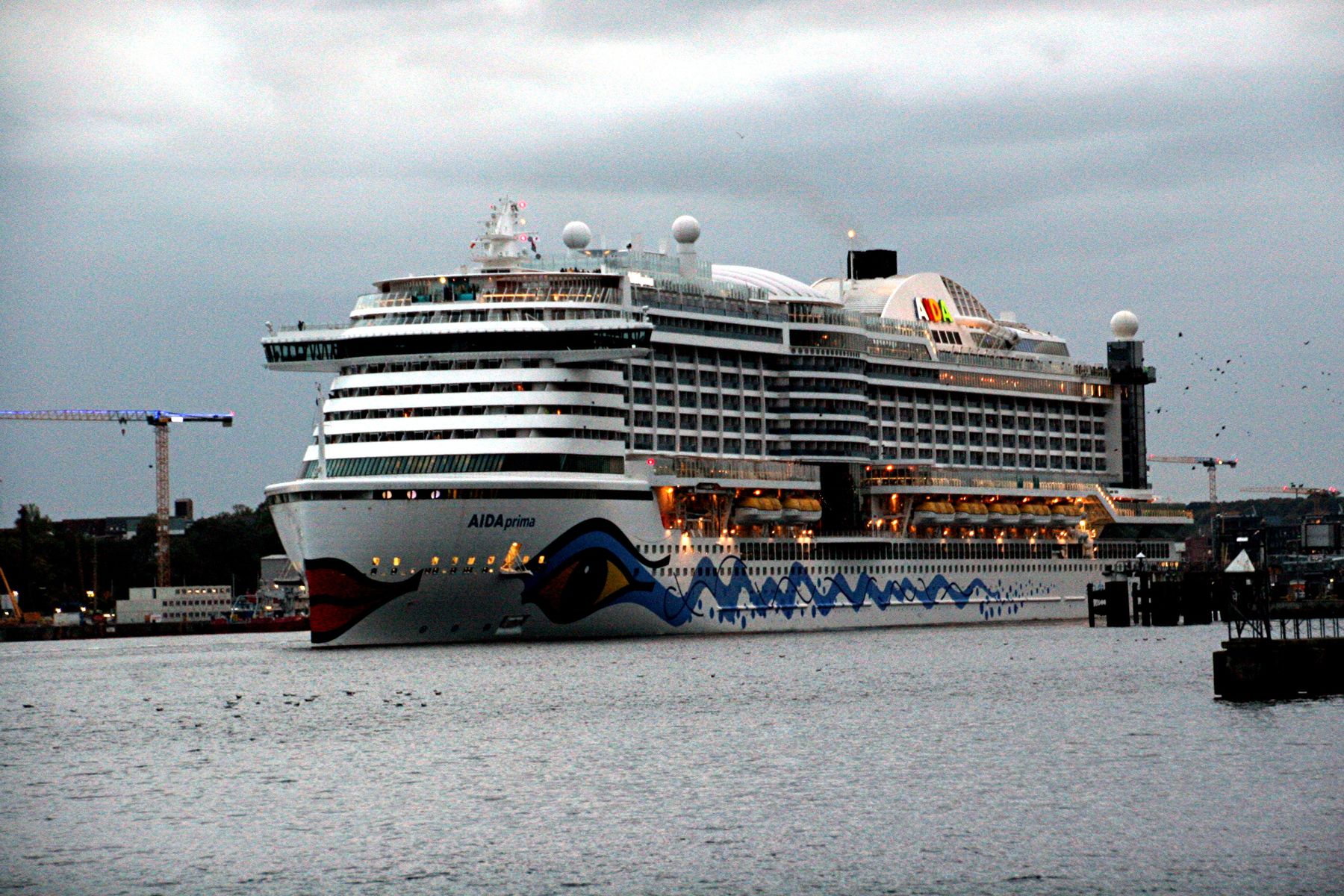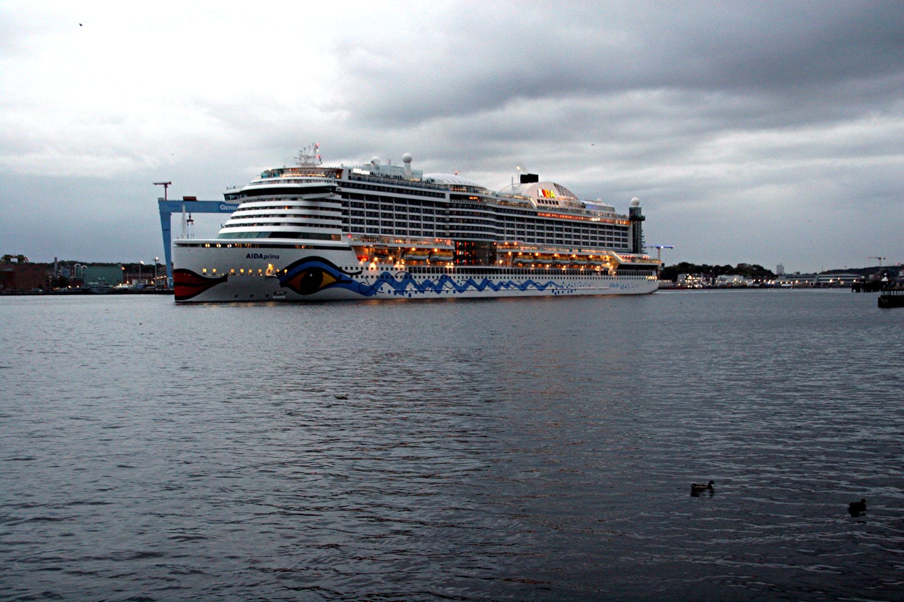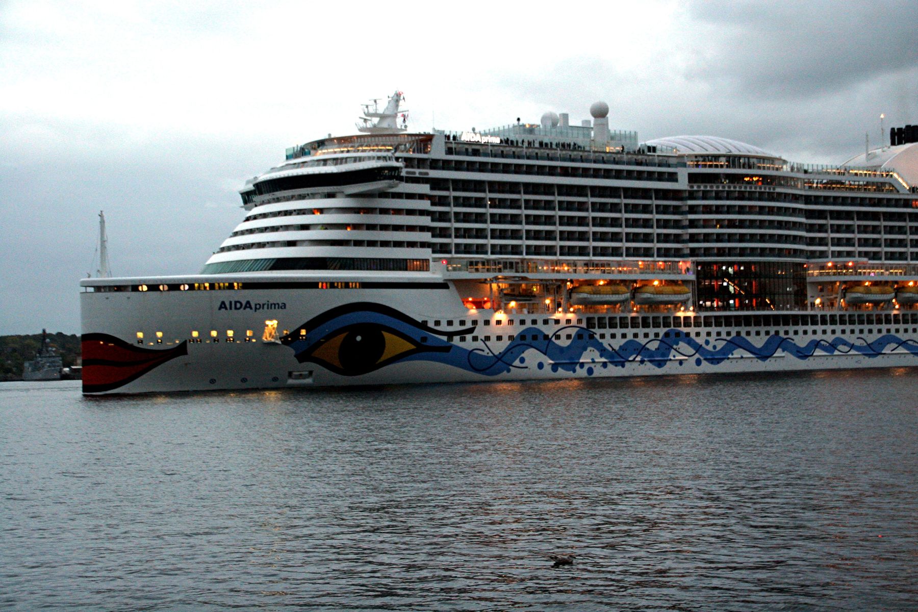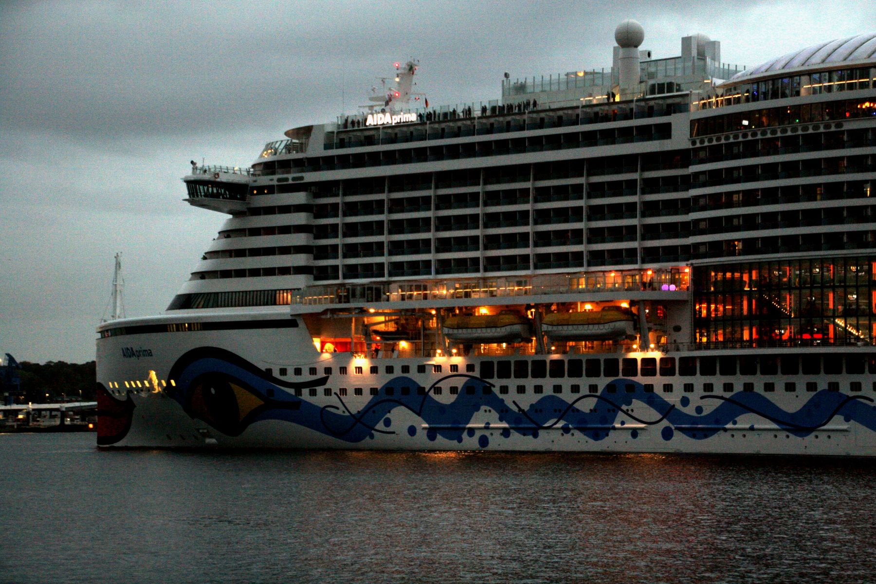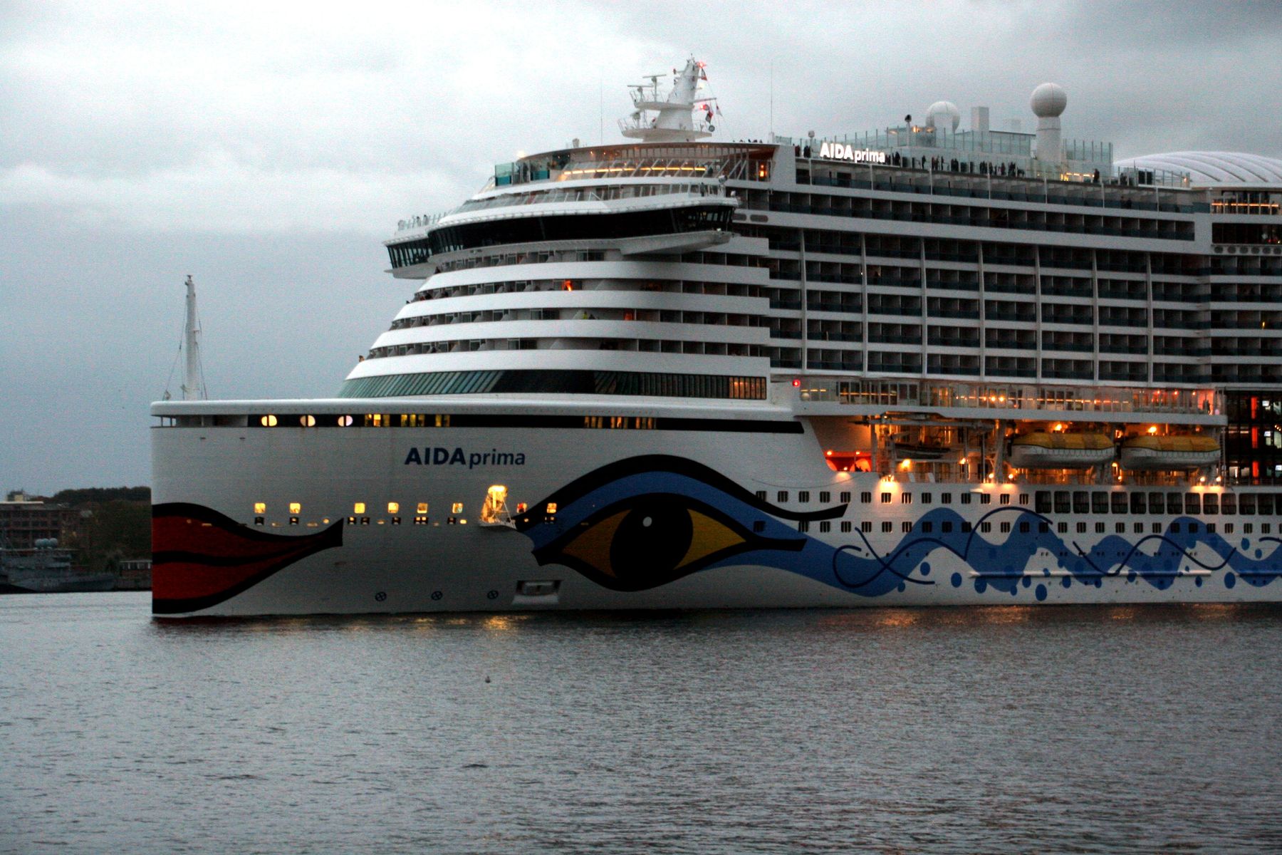 Die AIDAprima fährt um 18:23 h ihr Auslaufmanöver auf der "Kieler Förde"