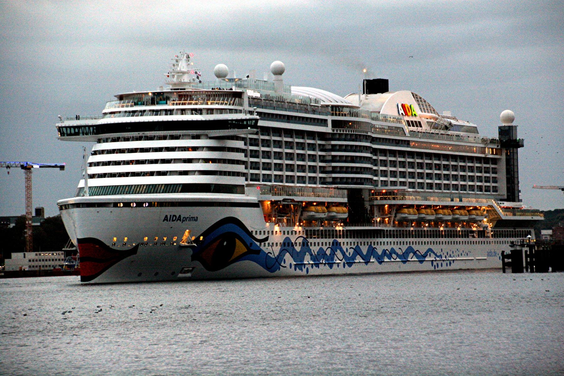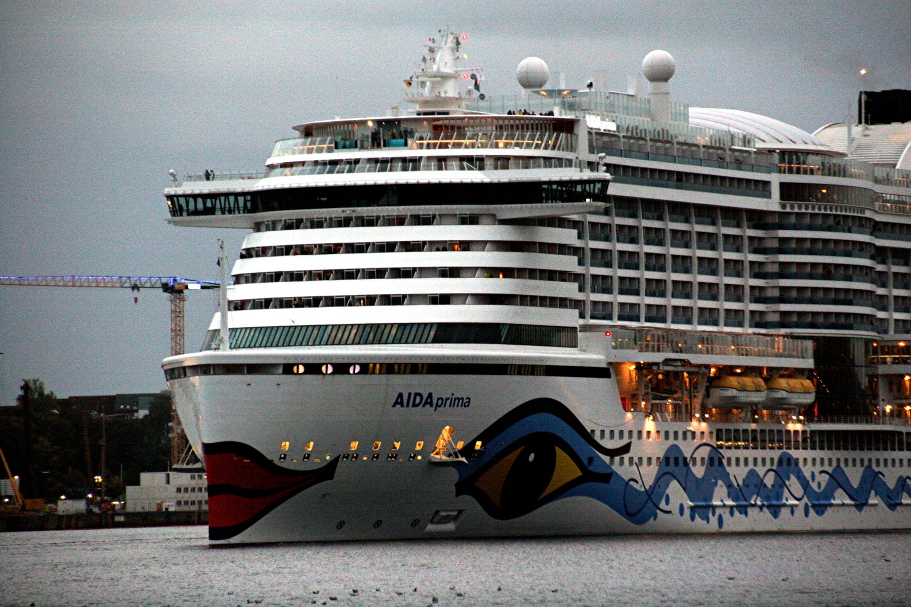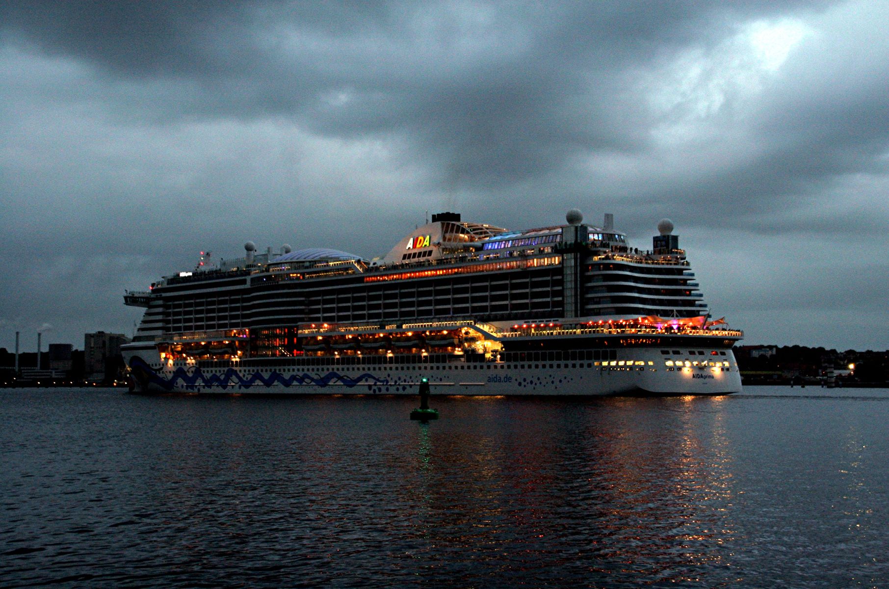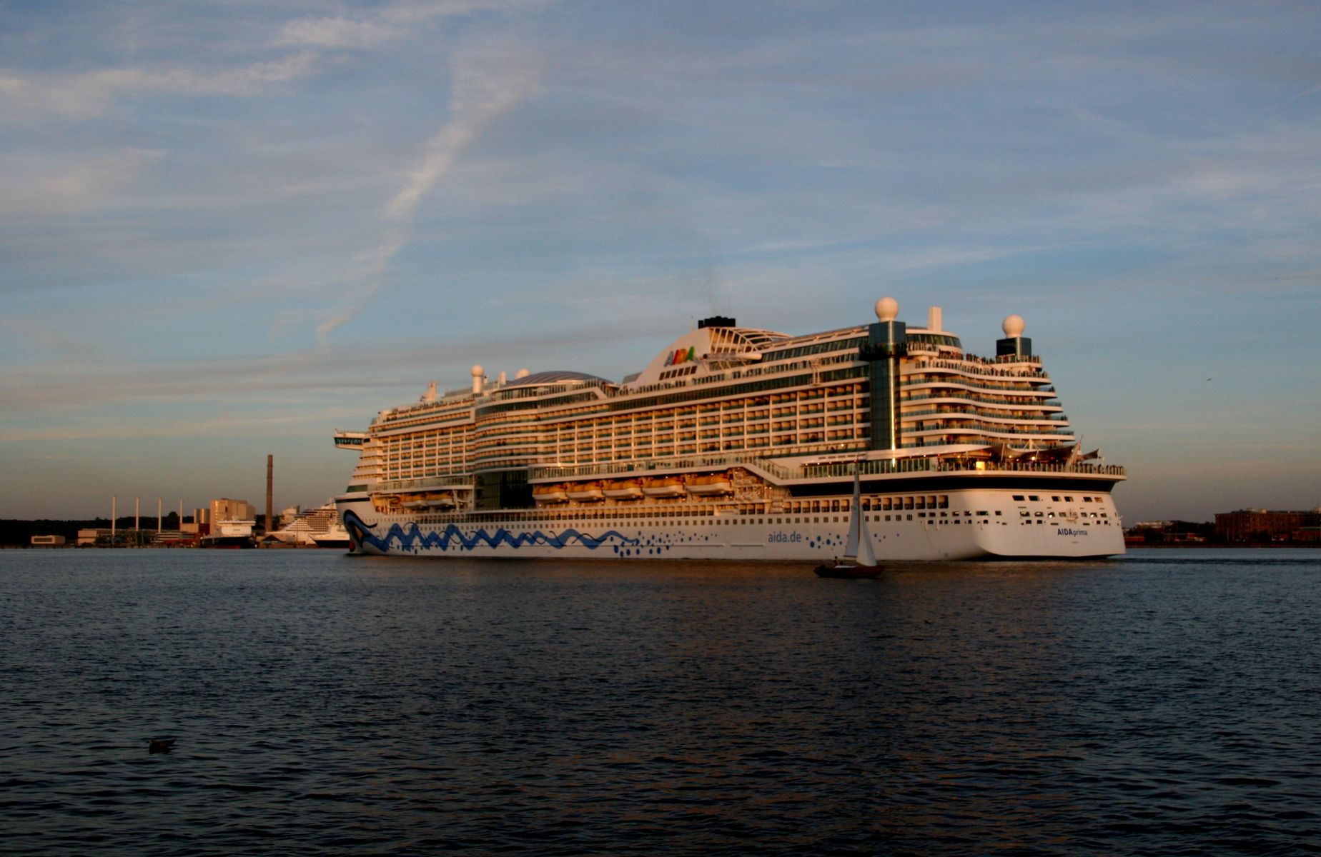 Die AIDAprima fährt um 18:23 h ihr Auslaufmanöver auf der "Kieler Förde"