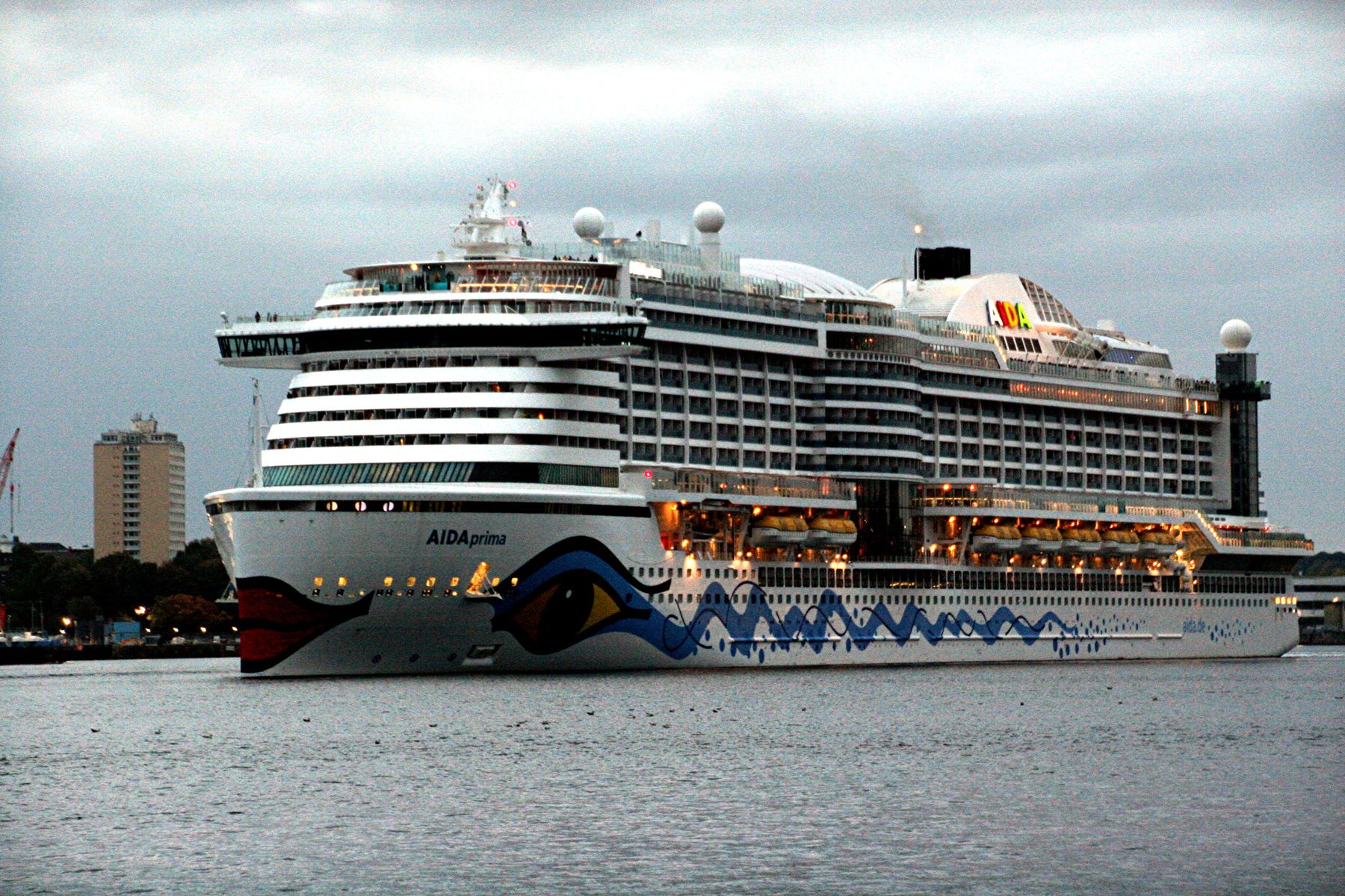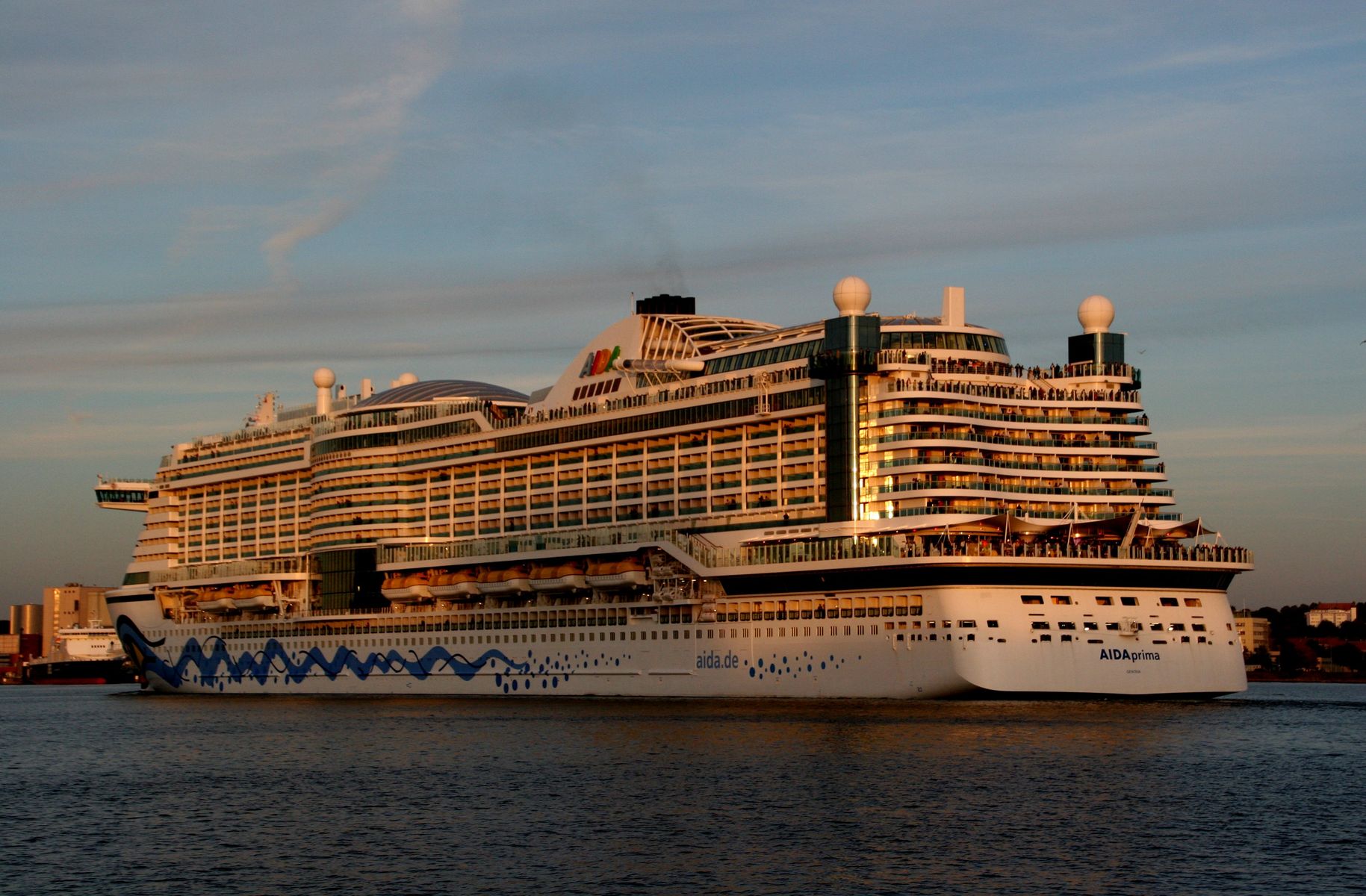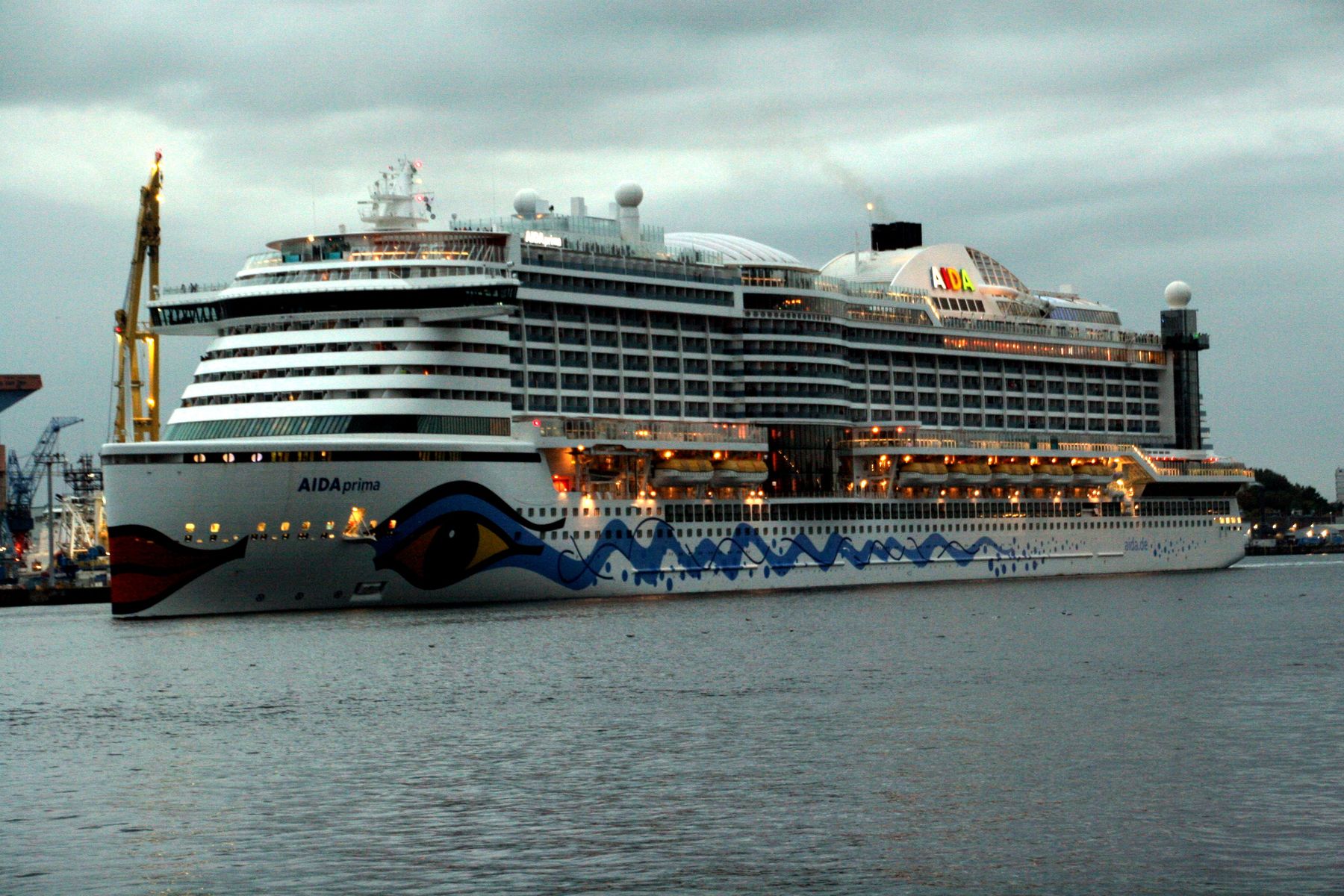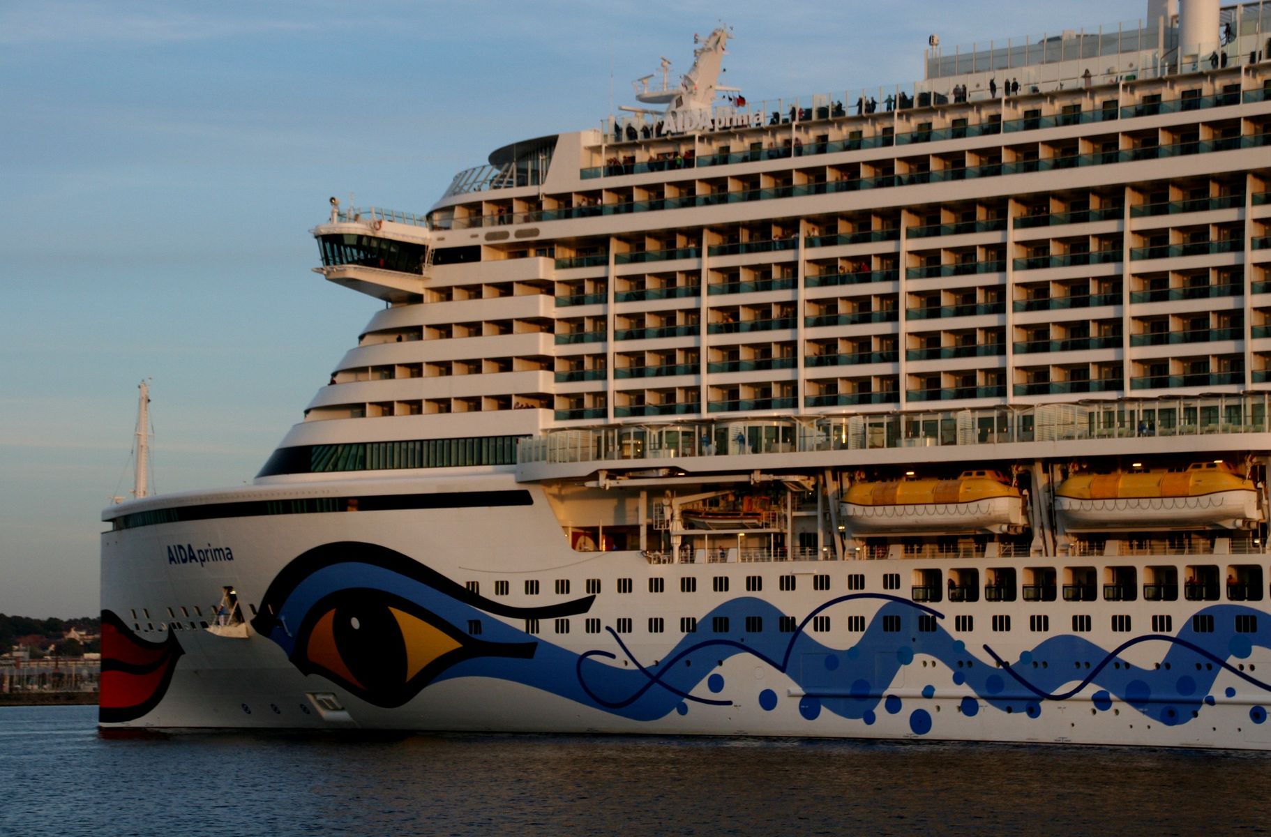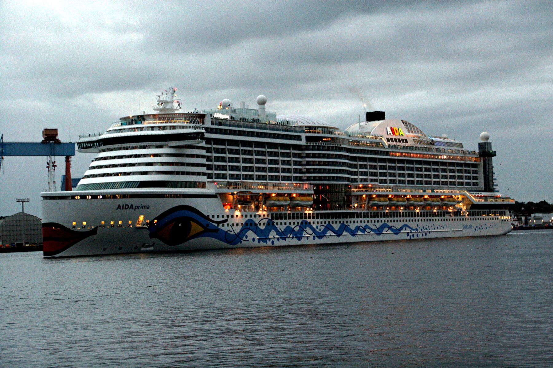 Die AIDAprima fährt um 18:23 h ihr Auslaufmanöver auf der "Kieler Förde"