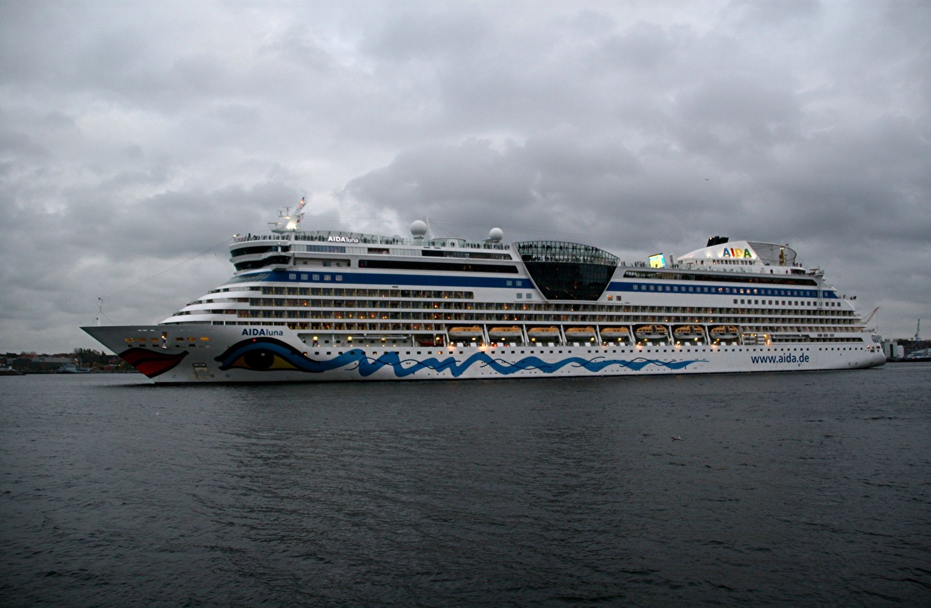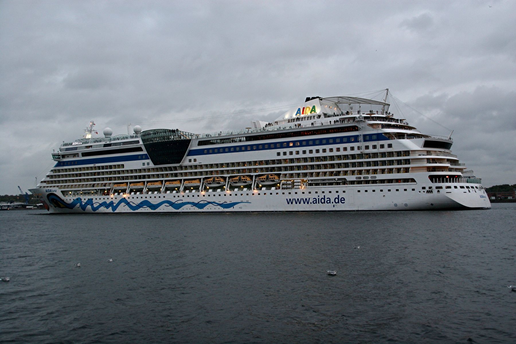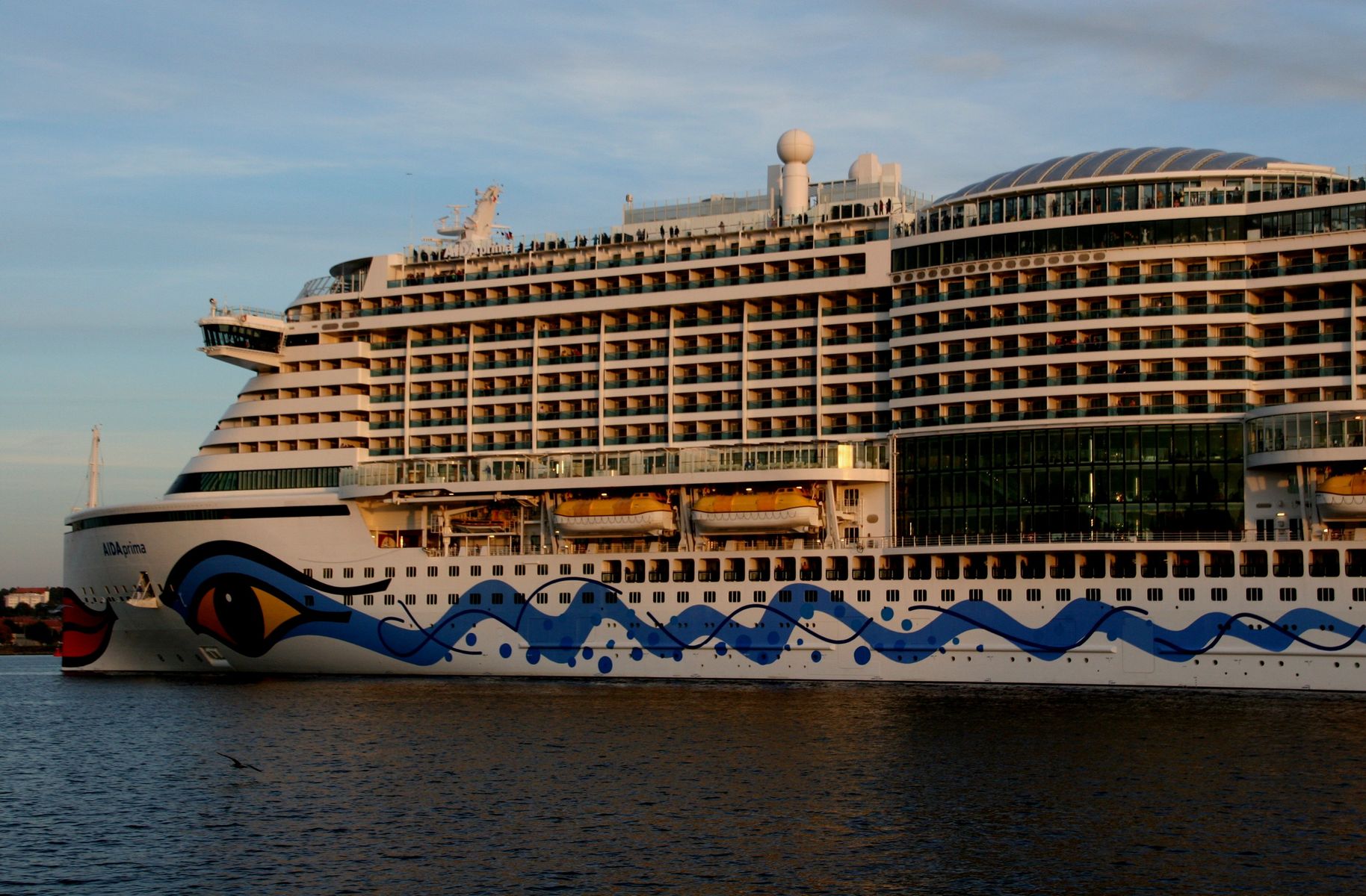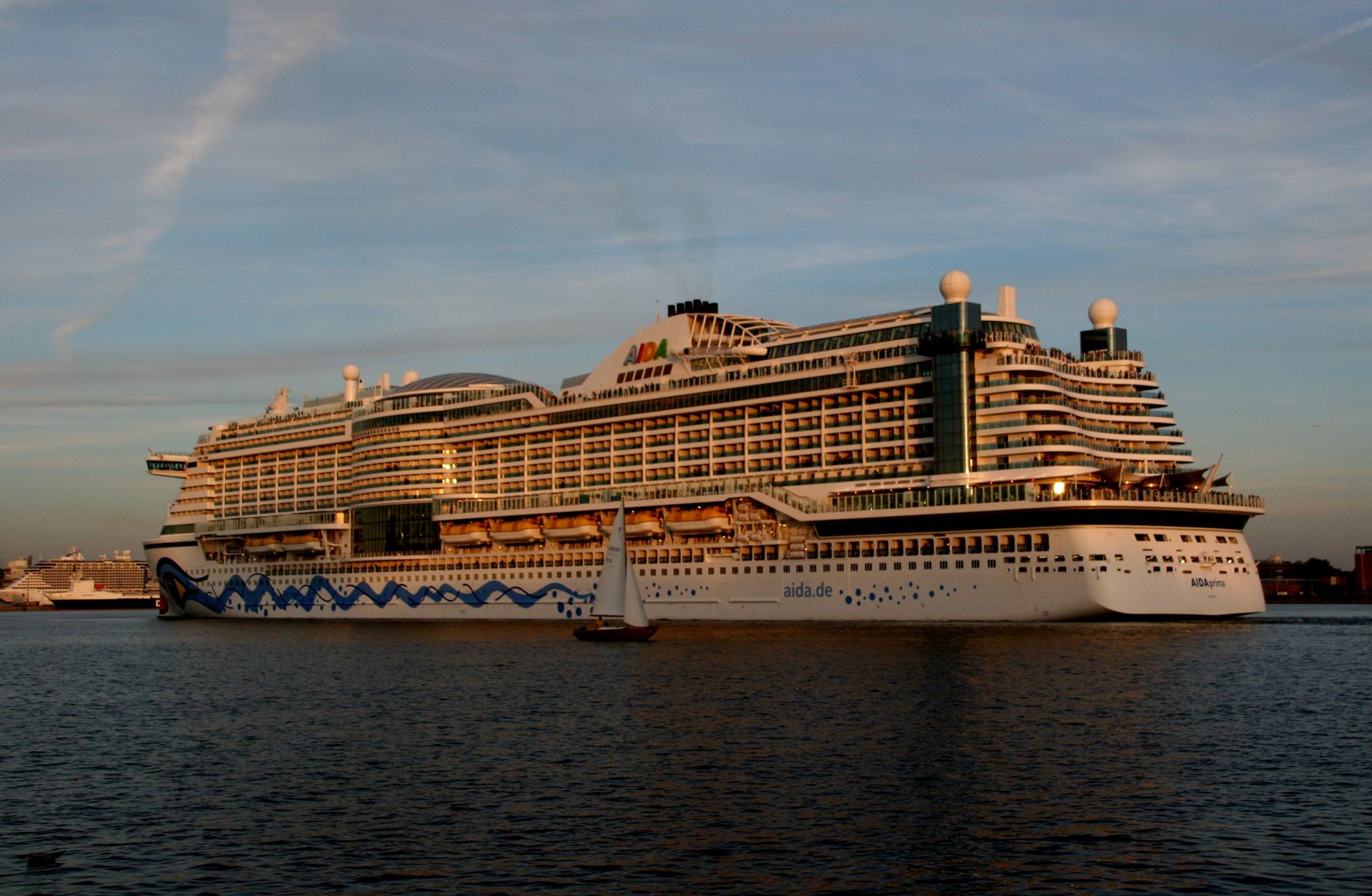 Die AIDAprima fährt um 18:23 h ihr Auslaufmanöver auf der "Kieler Förde"