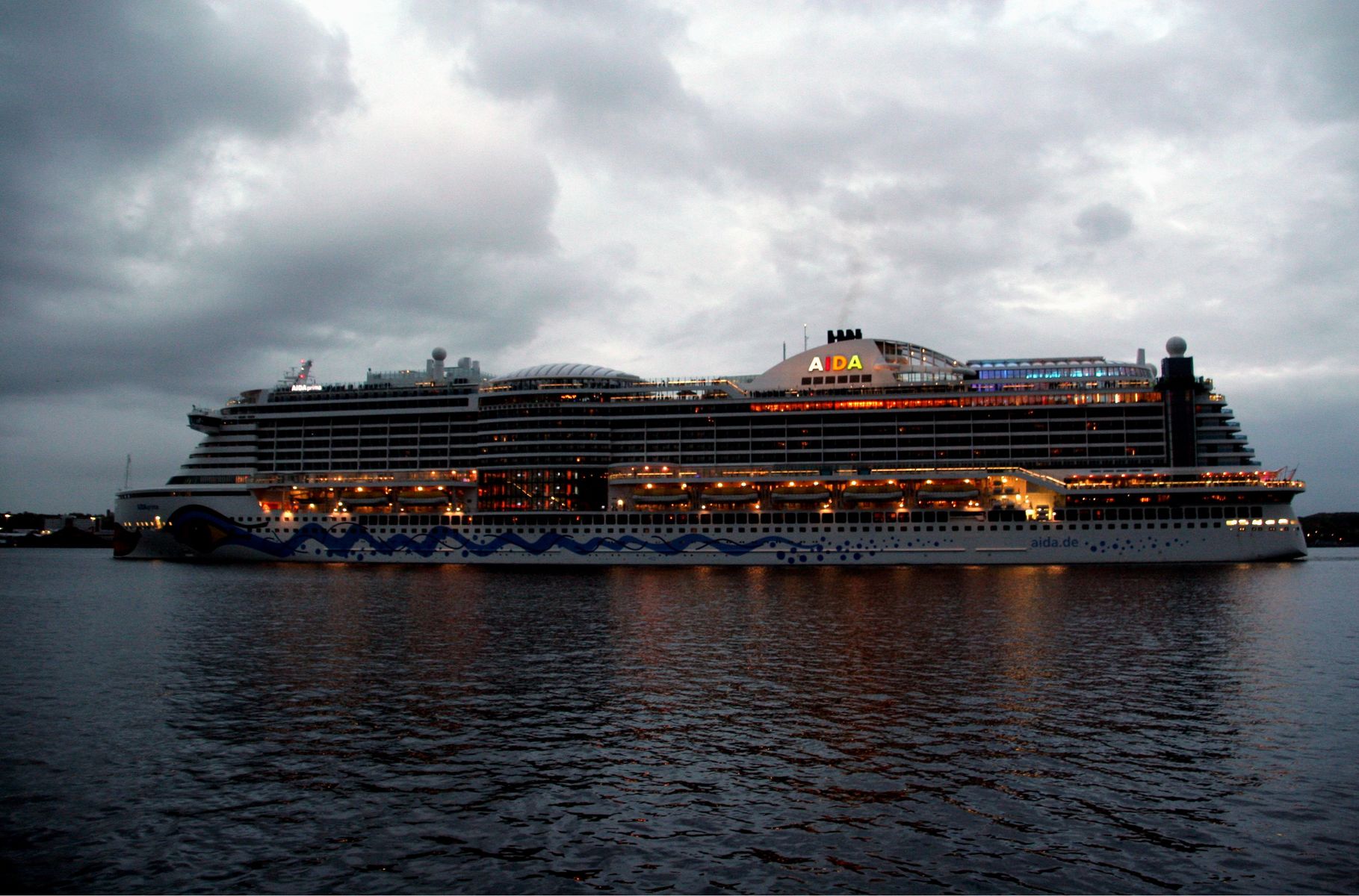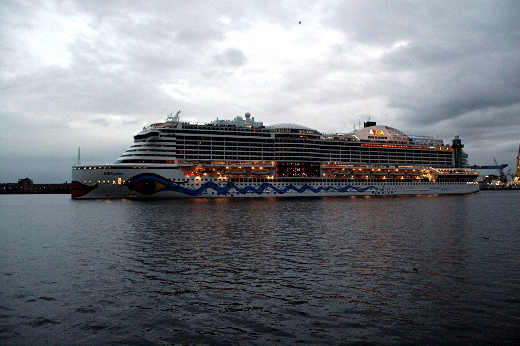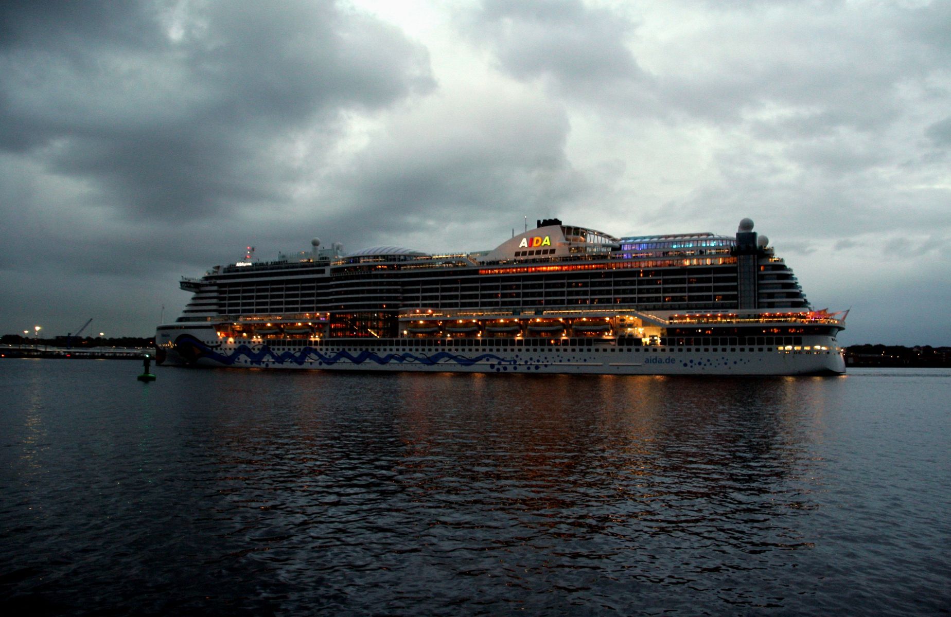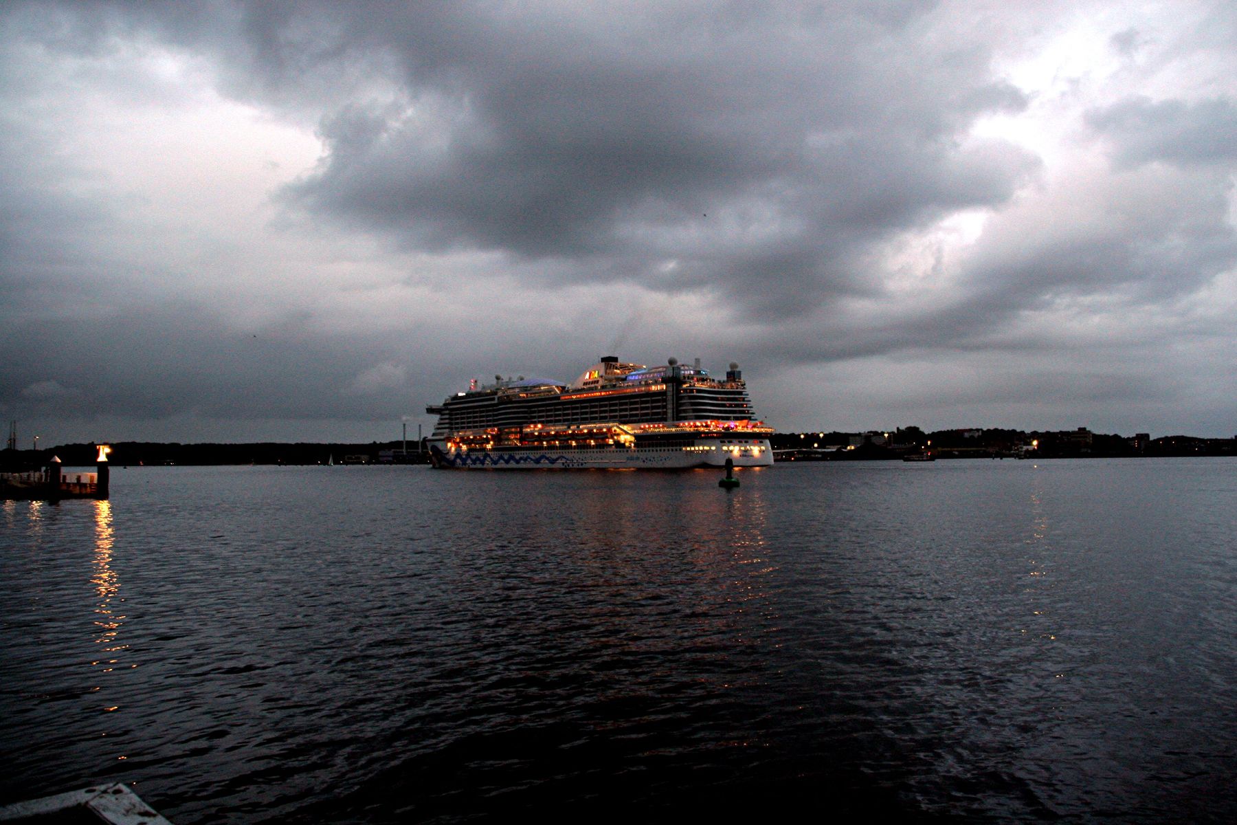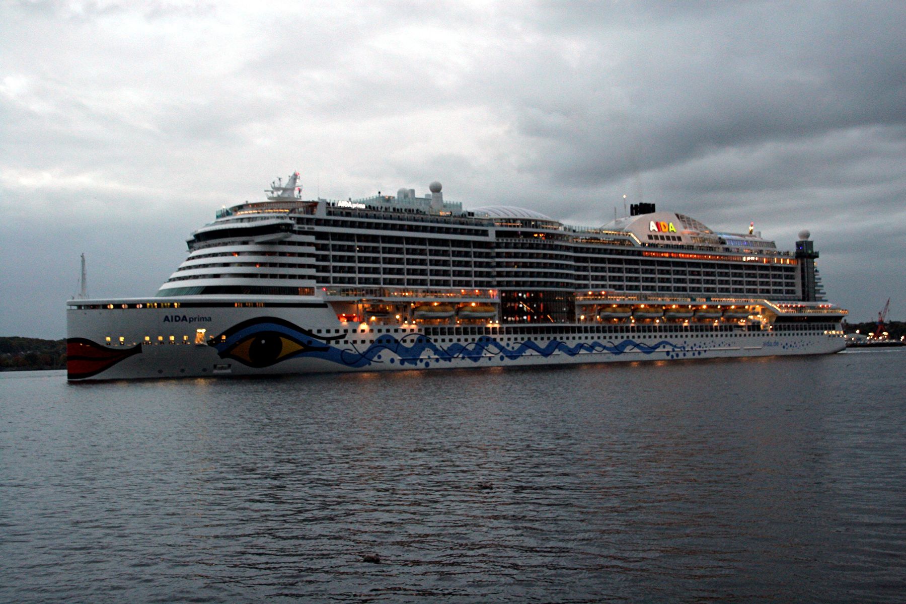 Die AIDAprima fährt in einer sehr abendlichen/stimmungsvollen Atmosphäre ihre "Revierfahrt" auf der "Kieler Förde"