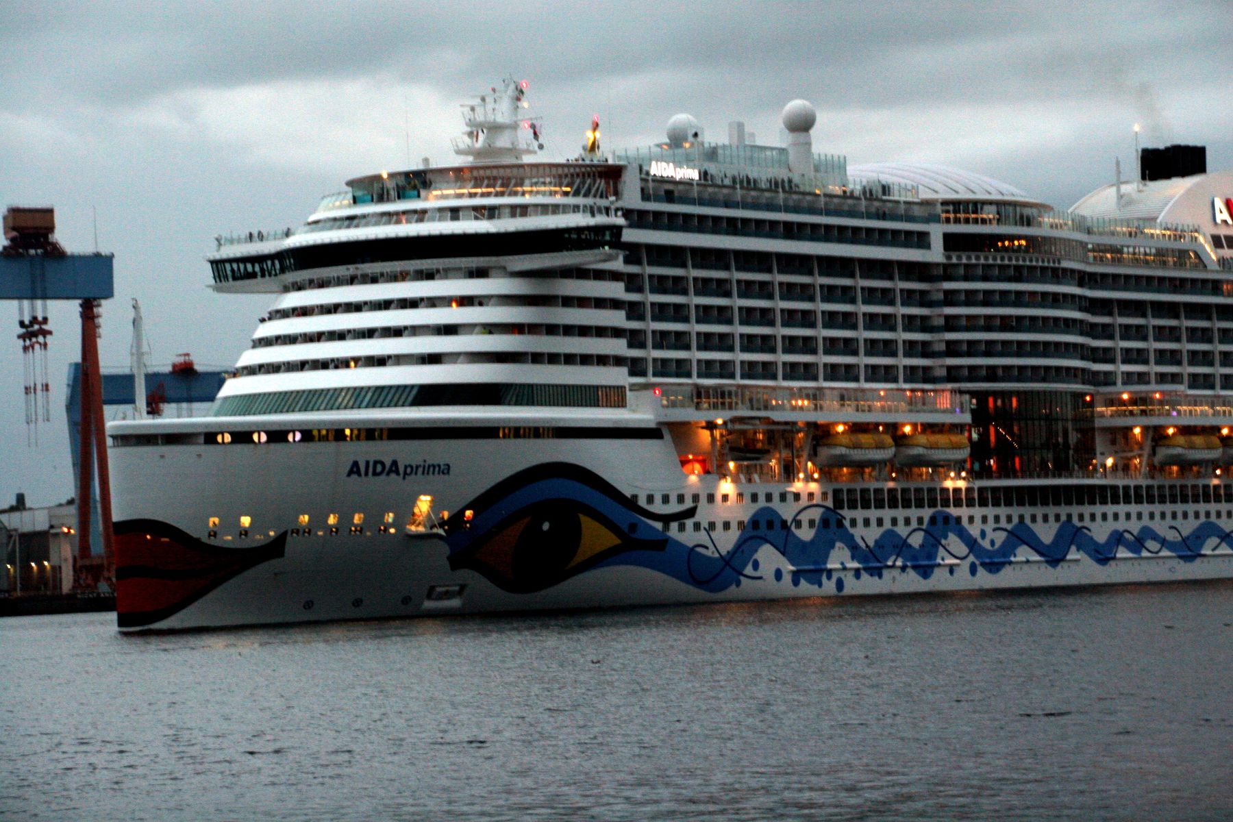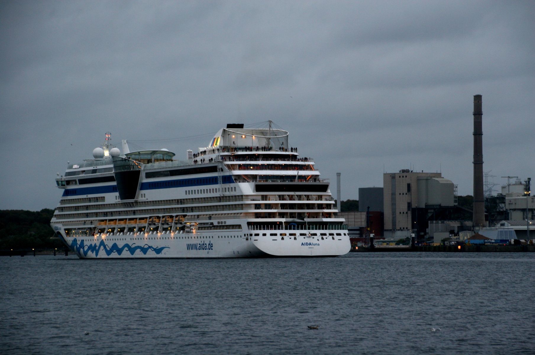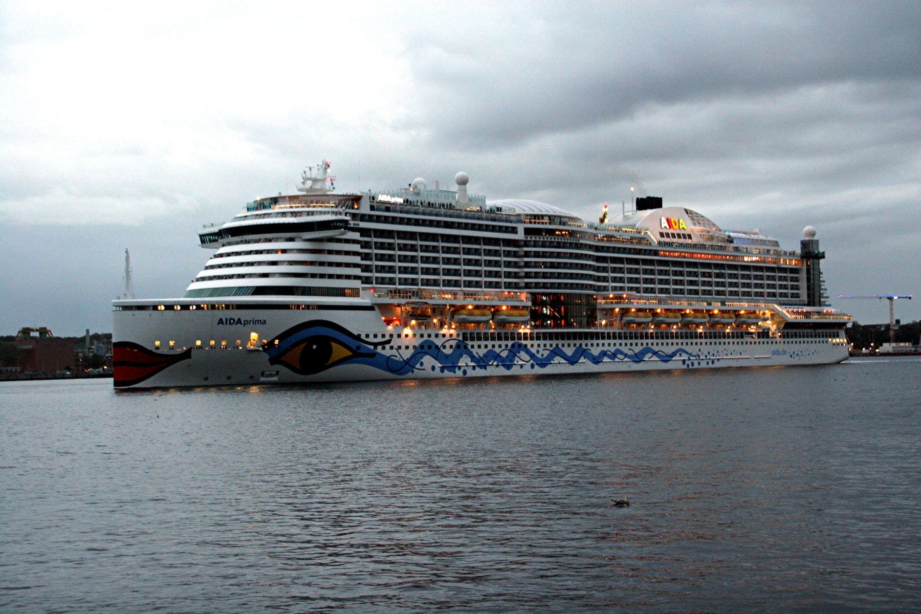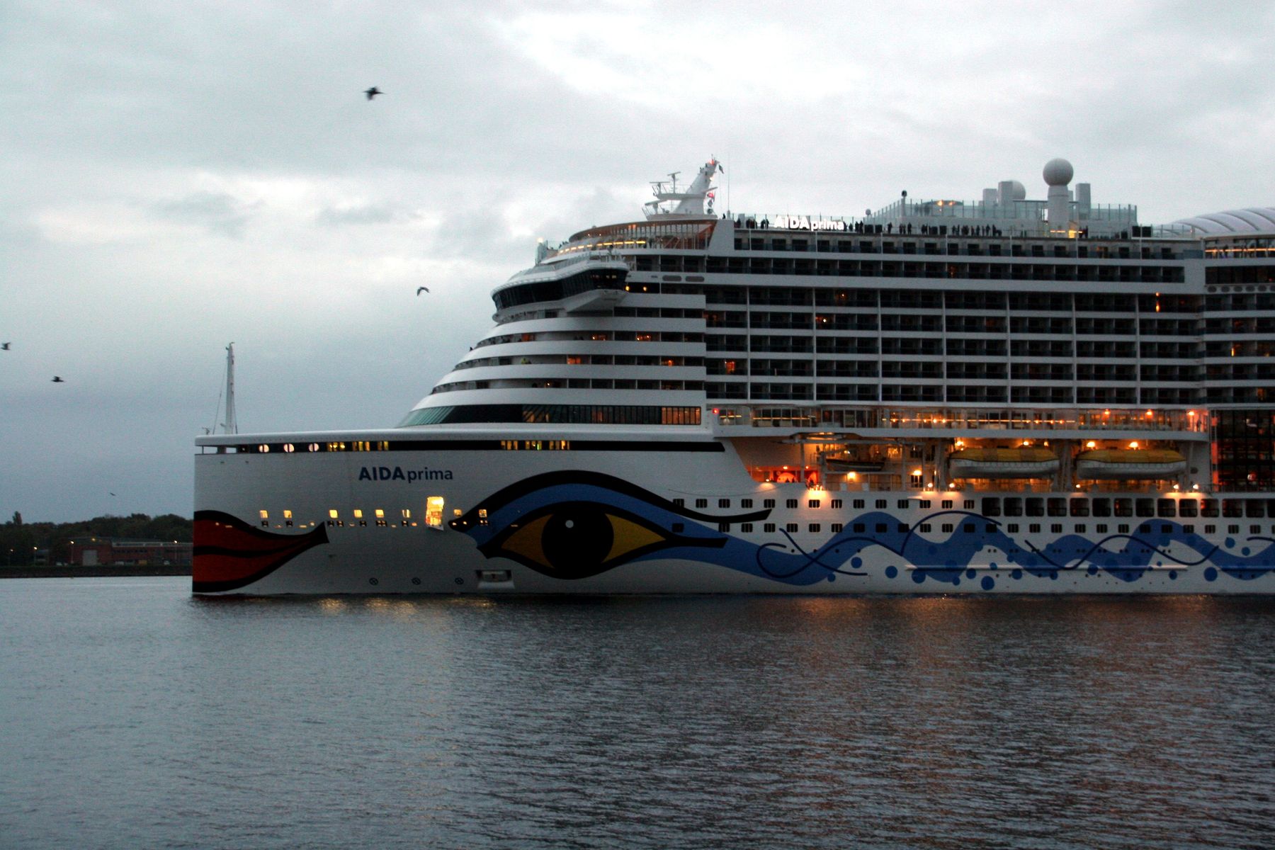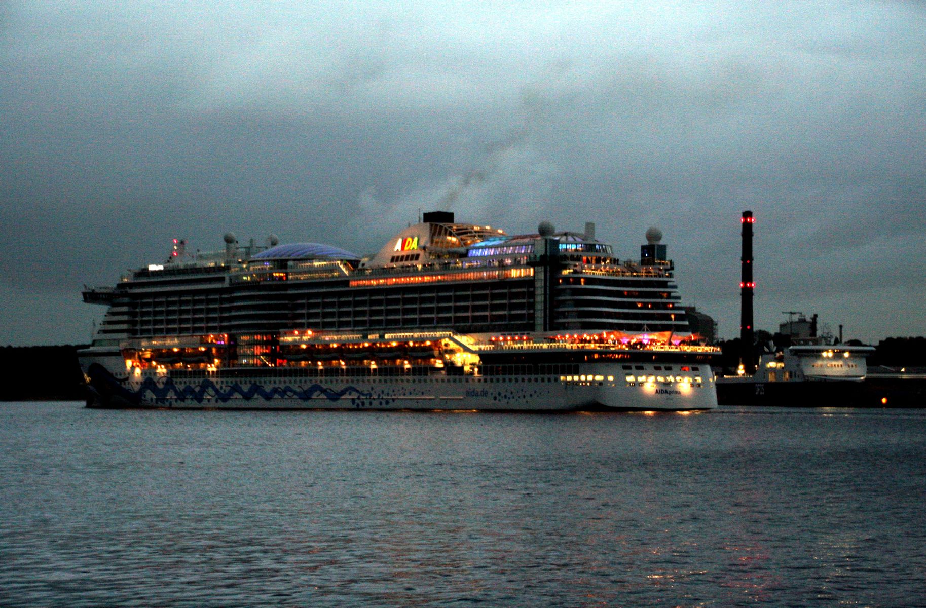 Die AIDAprima fährt in einer sehr abendlichen/stimmungsvollen Atmosphäre ihre "Revierfahrt" auf der "Kieler Förde"