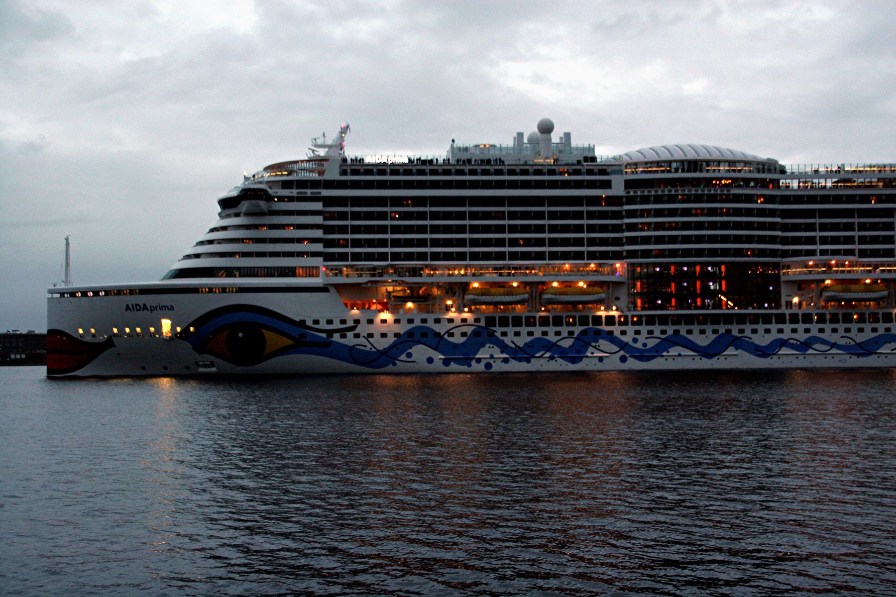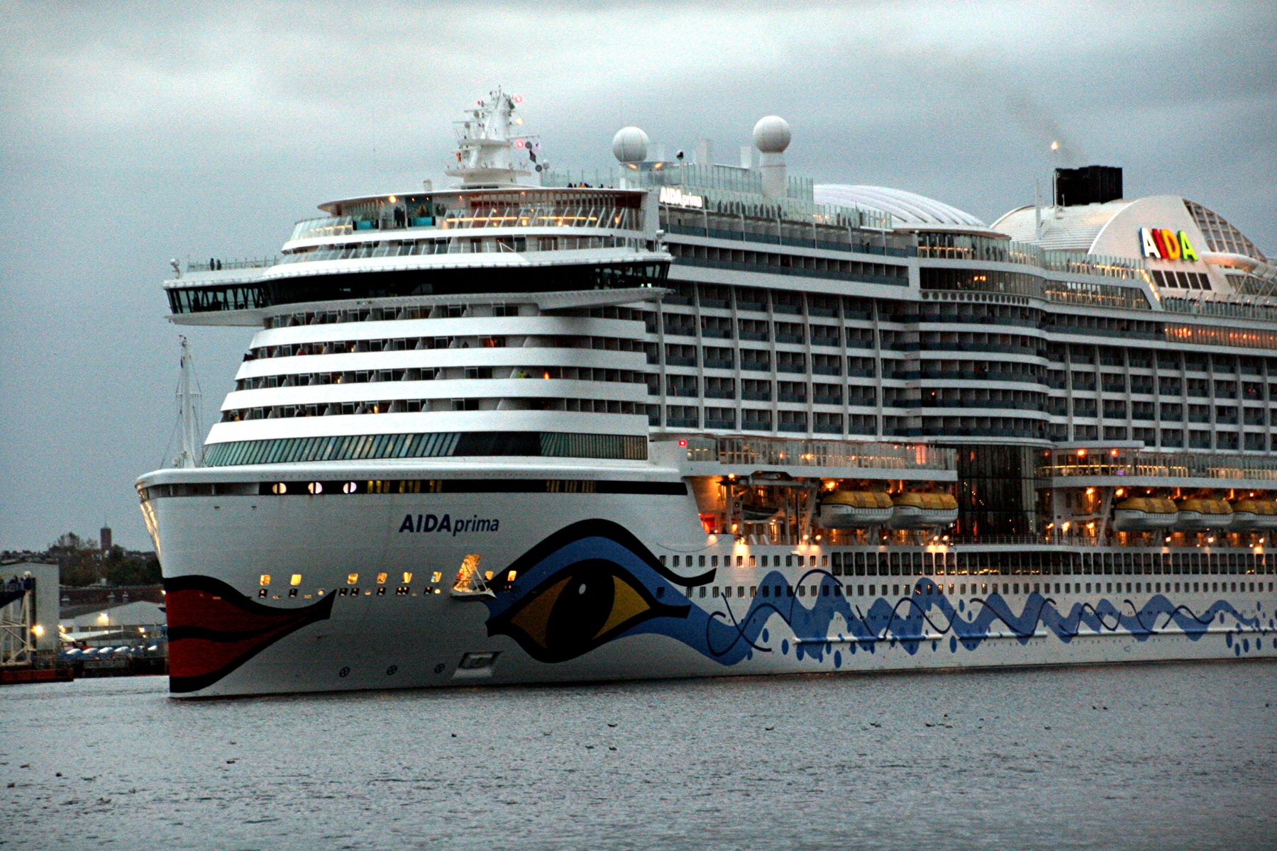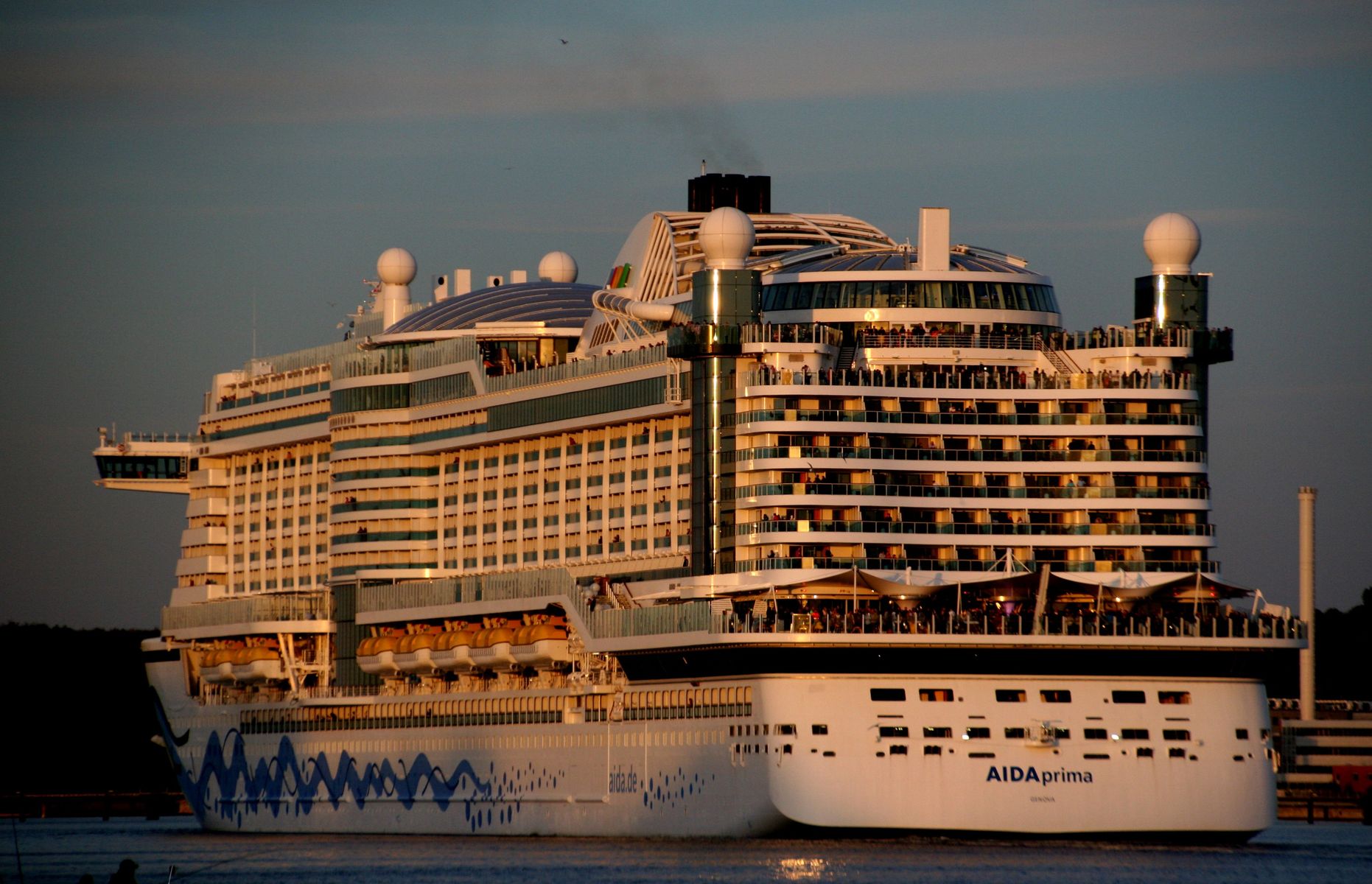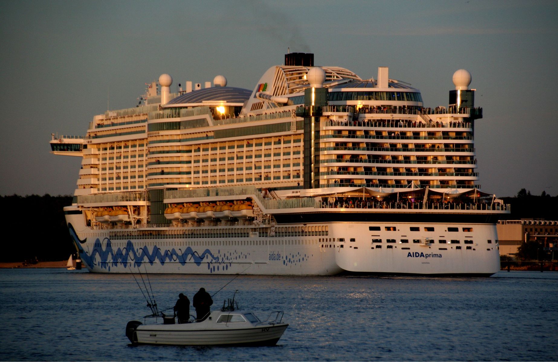 Die AIDAprima fährt in einer sehr abendlichen/stimmungsvollen Atmosphäre ihre "Revierfahrt" auf der "Kieler Förde"