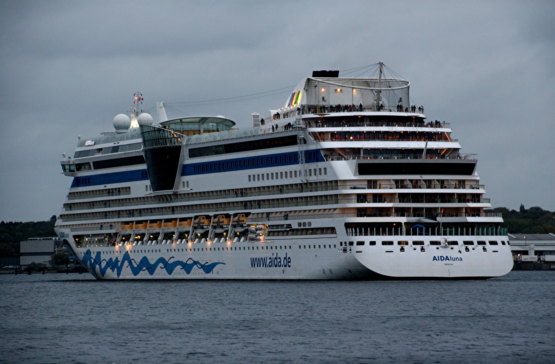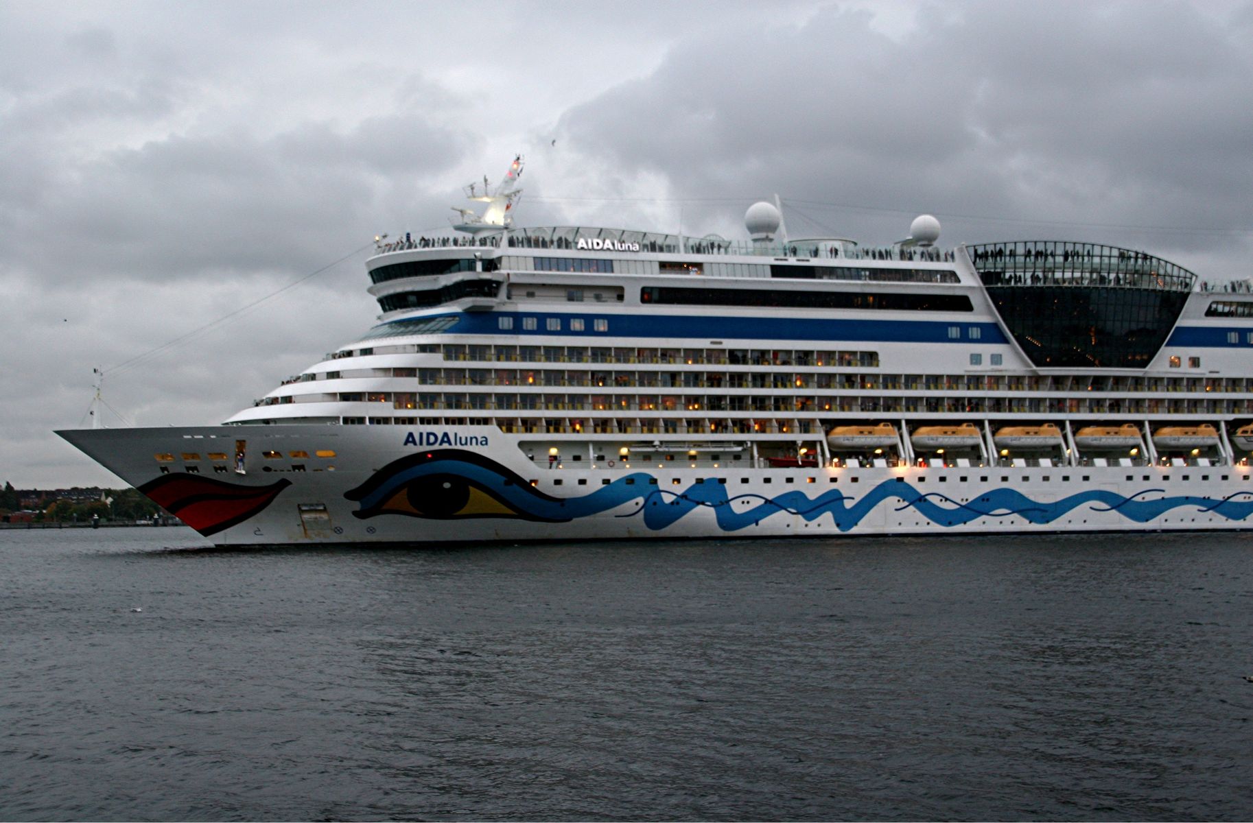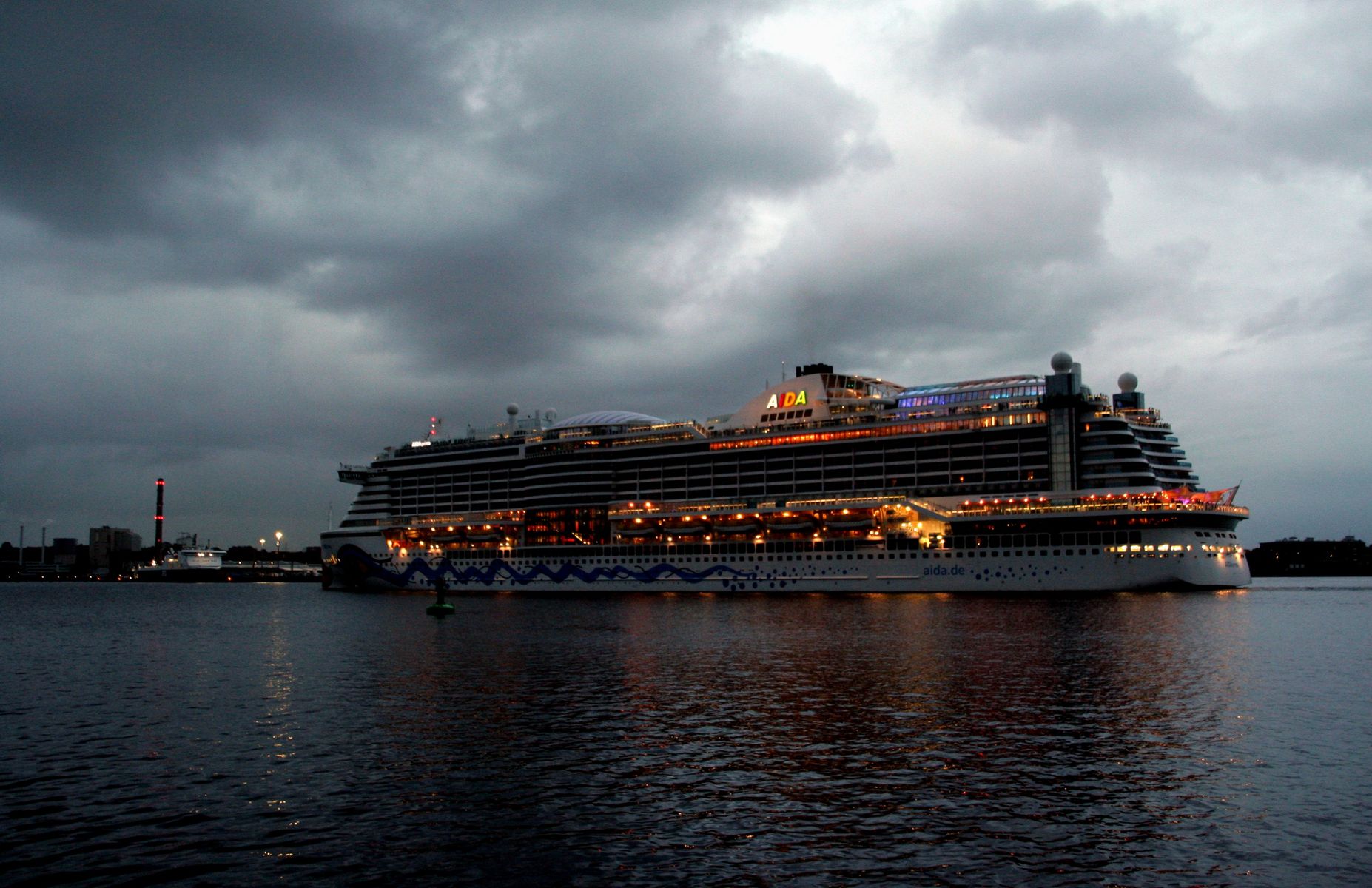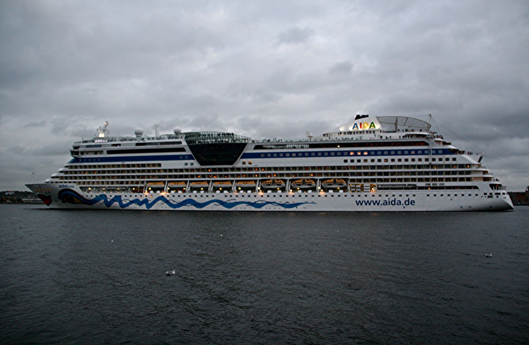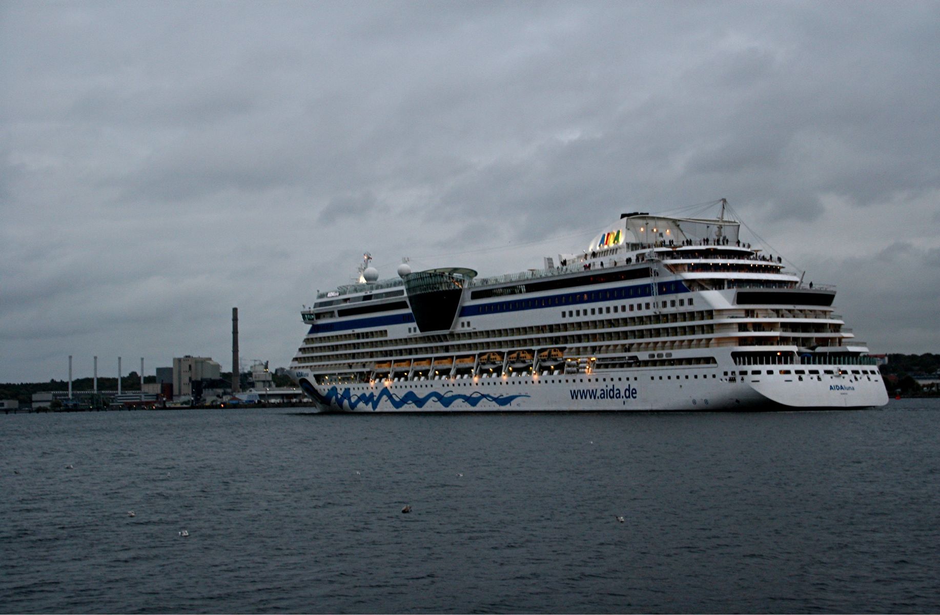 Die AIDAprima fährt in einer sehr abendlichen/stimmungsvollen Atmosphäre ihre "Revierfahrt" auf der "Kieler Förde"