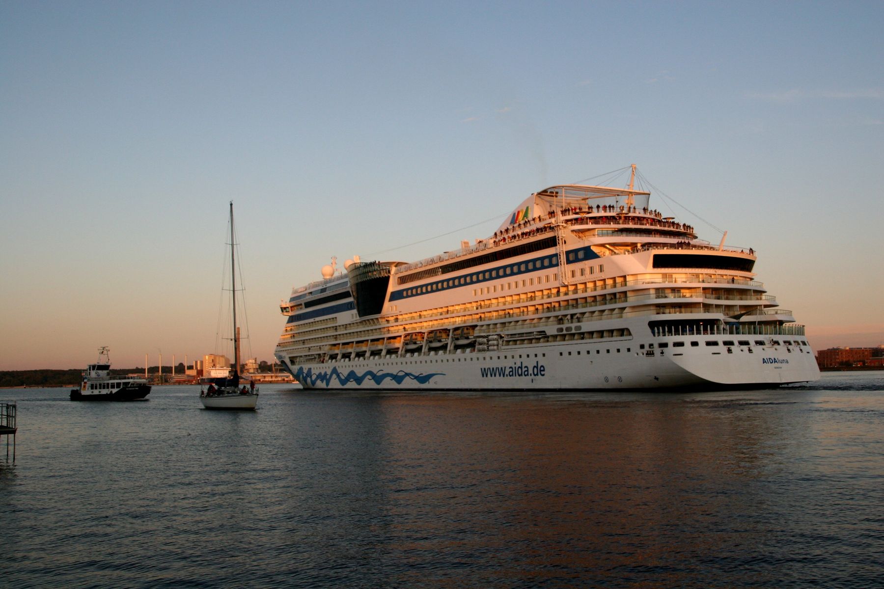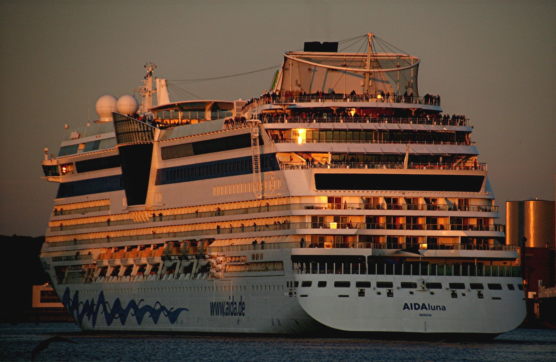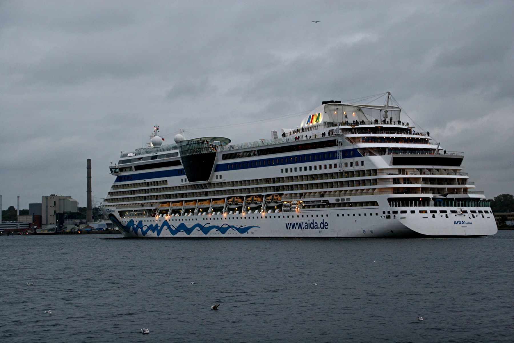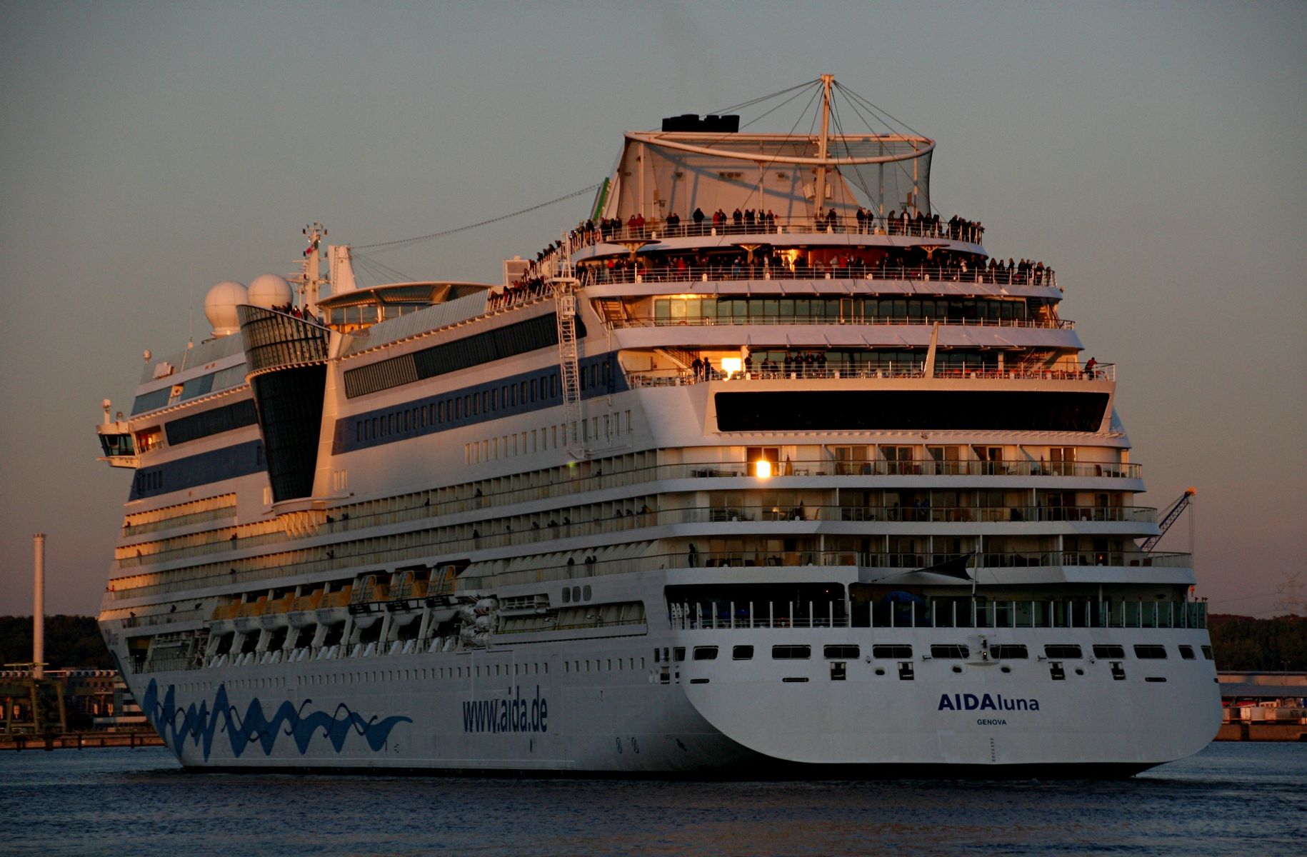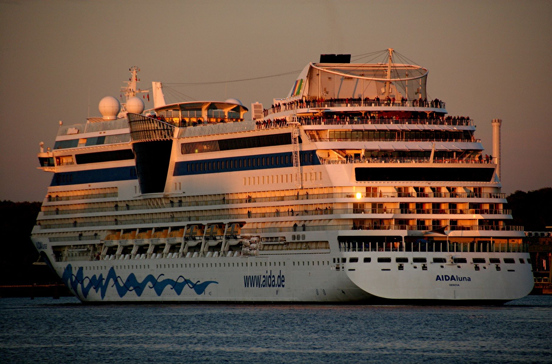Die AIDAprima fährt in einer sehr abendlichen/stimmungsvollen Atmosphäre ihre "Revierfahrt" auf der "Kieler Förde"