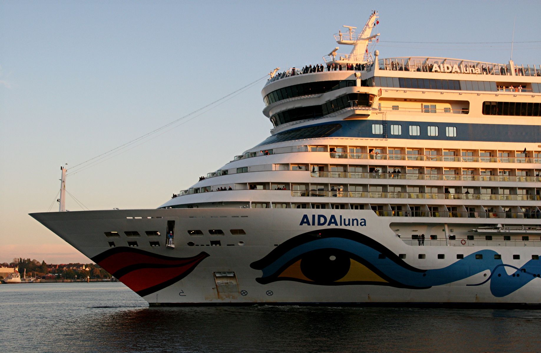 Die AIDAluna fährt um 18:09 h auf der "Kieler Förde" ihr Auslaufmanöver in Höhe der MS Hamburg an ihrem "Liegeplatz 28" am Ostseekai