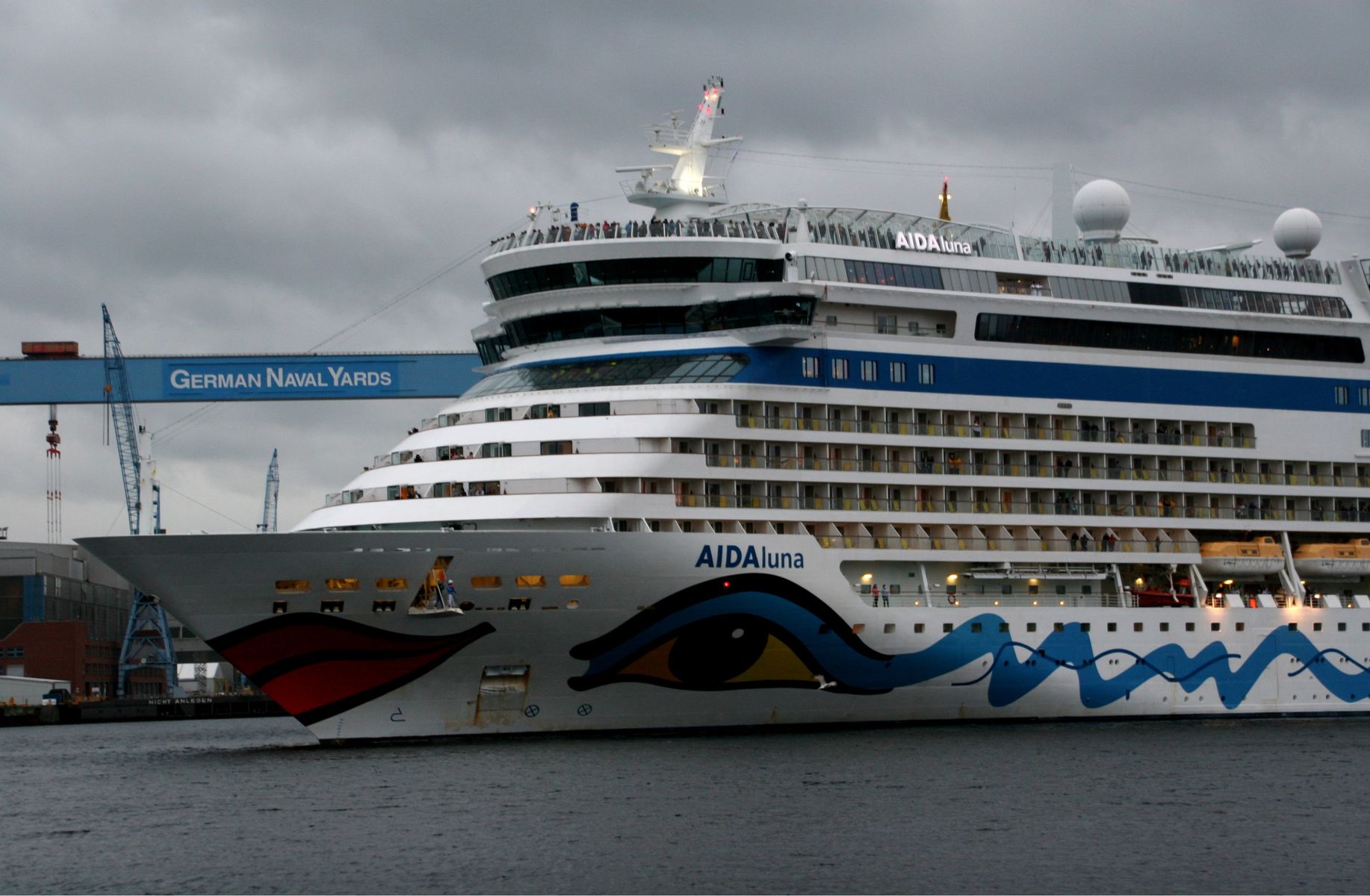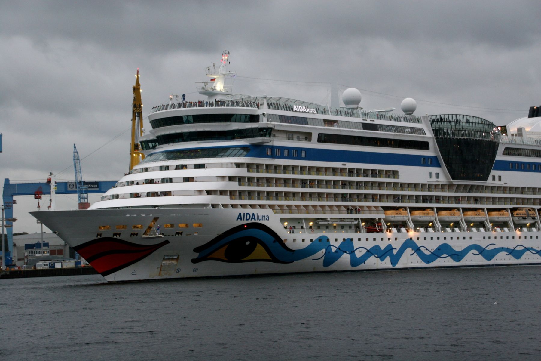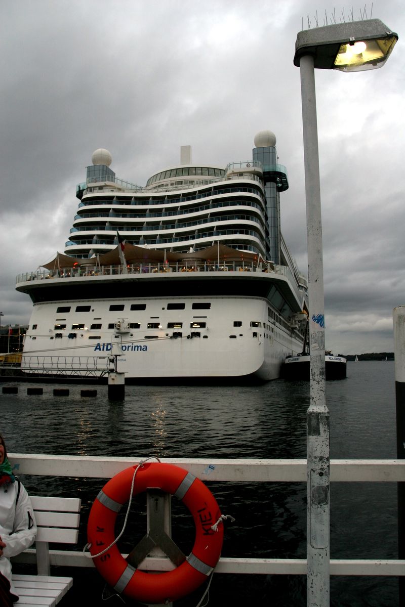 Die AIDAprima fährt unter einem grandiosen Regenwolkenpanorama (ich hatte beim "Knipsen" einen Regenschirm aufgespannt) ihr Auslaufmanöver auf der "Kieler Förde"