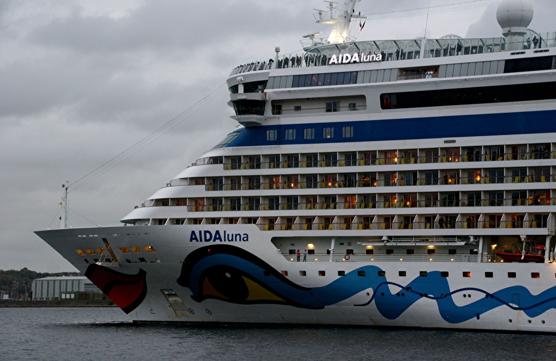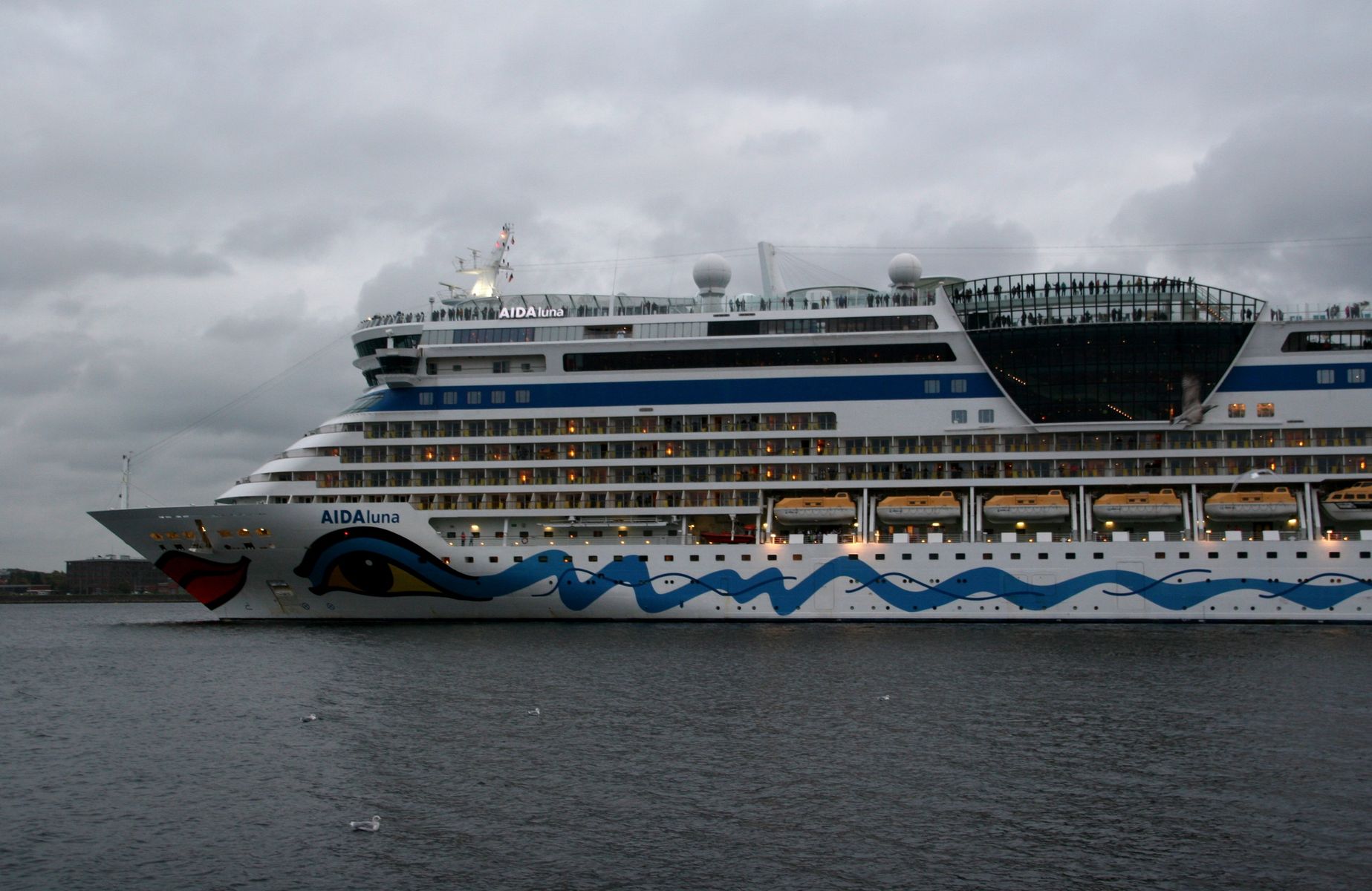 Einige "Sehleute" genießen auch bei dem wolkigen/kalten Wetter ihre "Revierfahrt" mit der AIDAluna auf der "Kieler Förde"