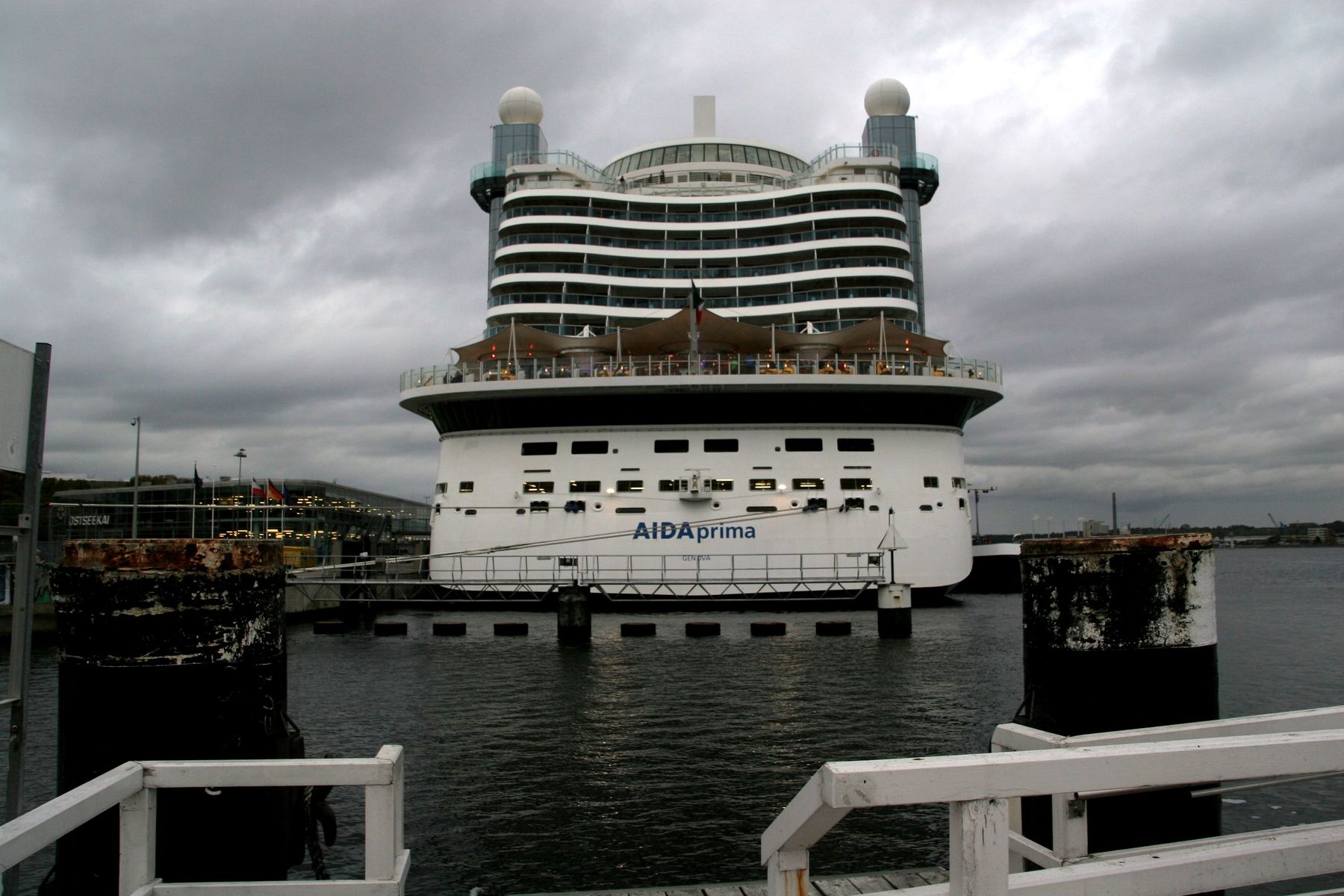 Die AIDAprima unter einem grandiosen Wolkenpanorama an ihrem Liegeplatz 27 am Ostseekai in Kiel