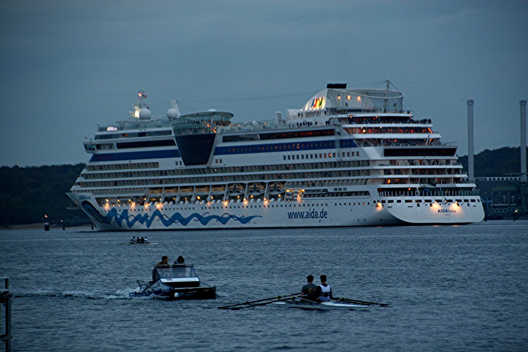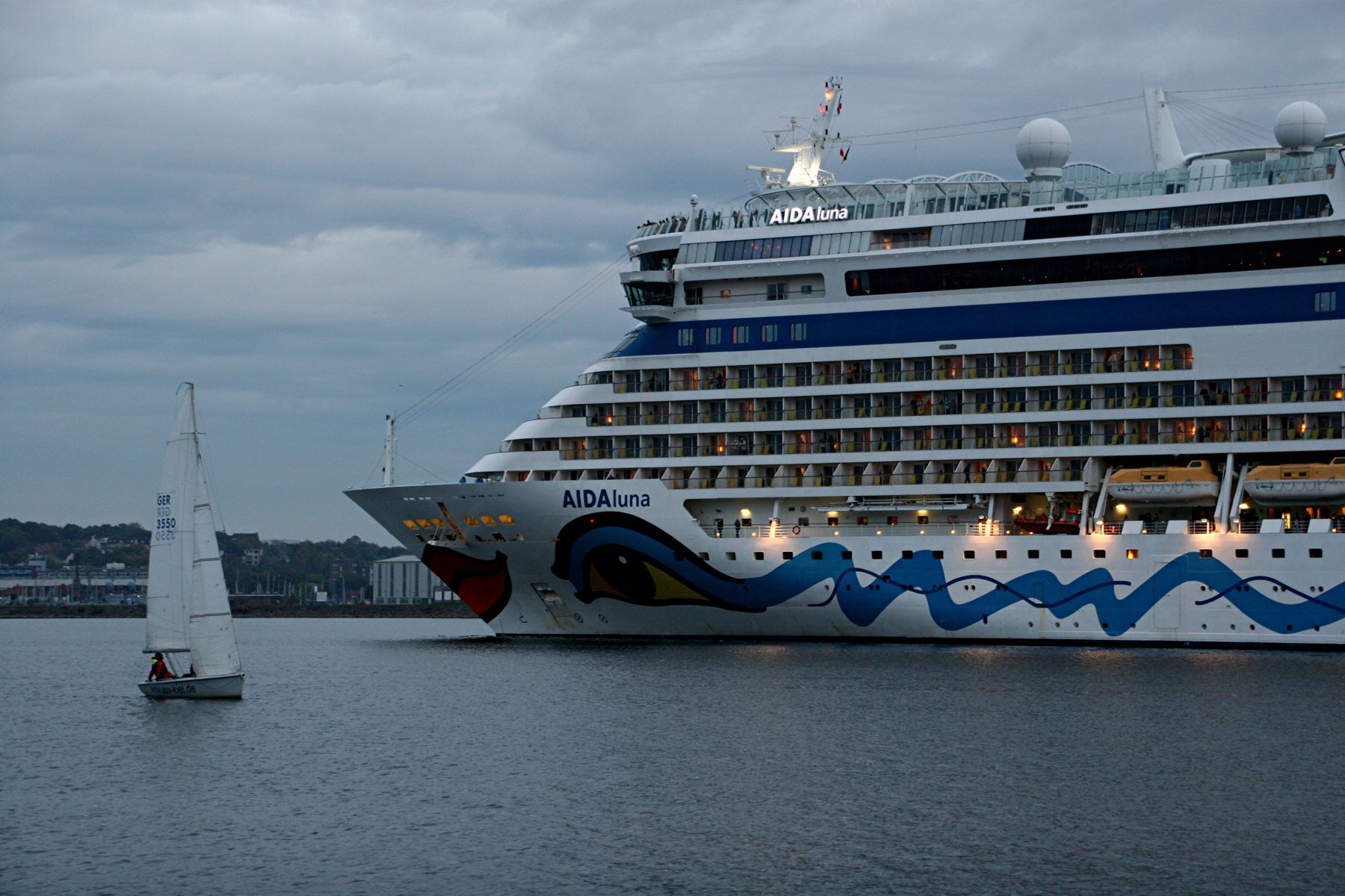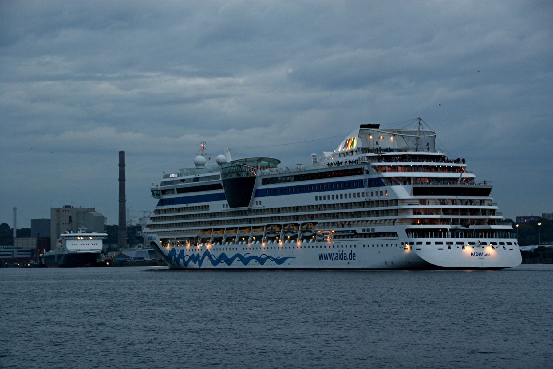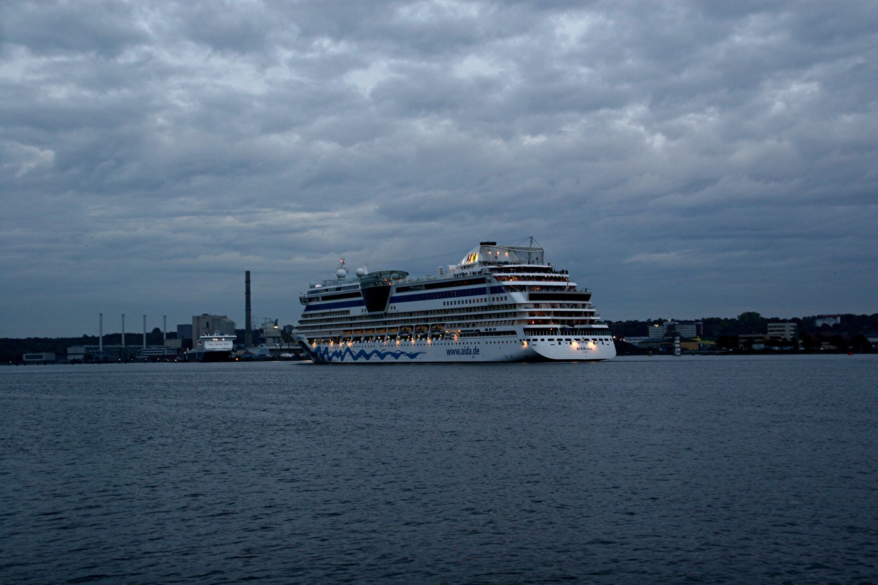 Die AIDAluna fährt am 18.10.2021 um 18:09h ihr Auslaufmanöver auf der "Kieler Förde"