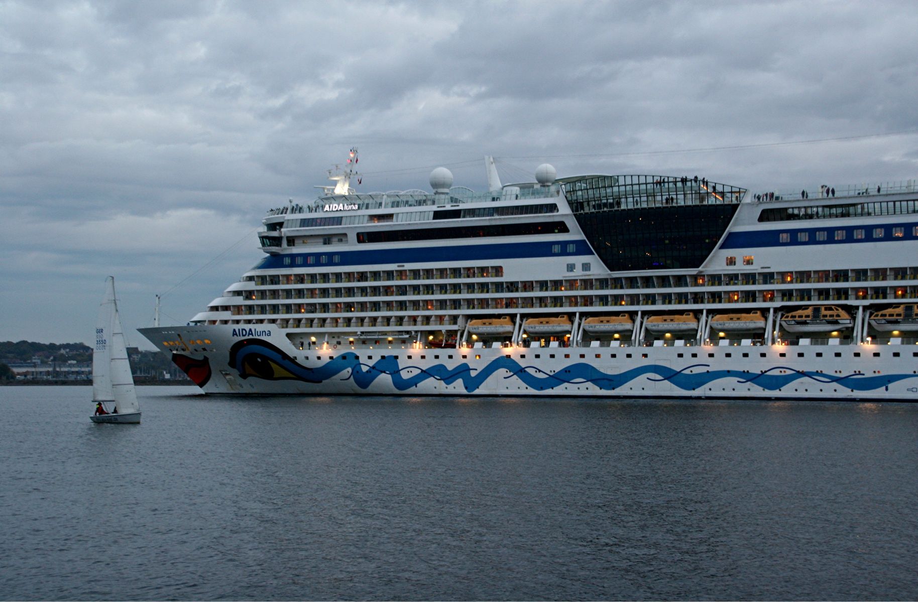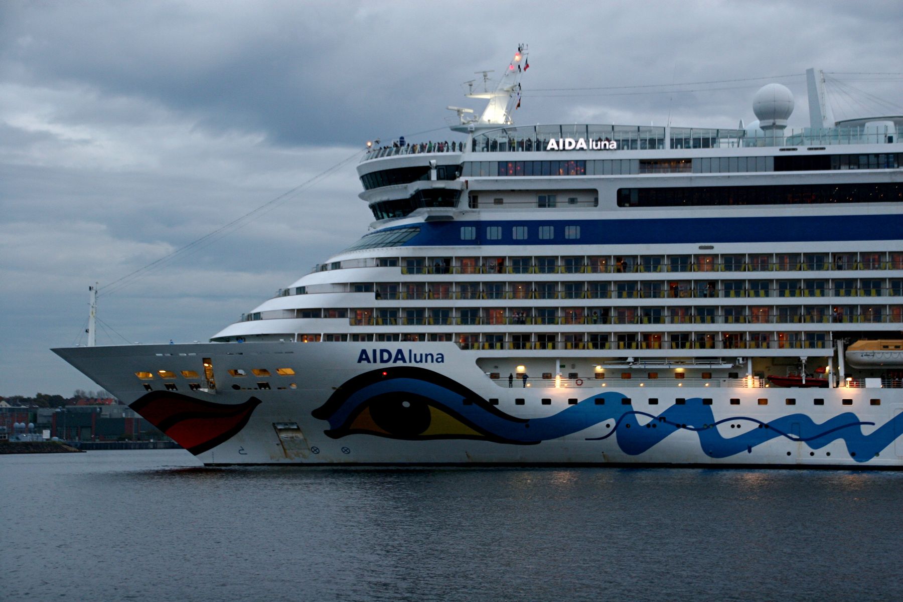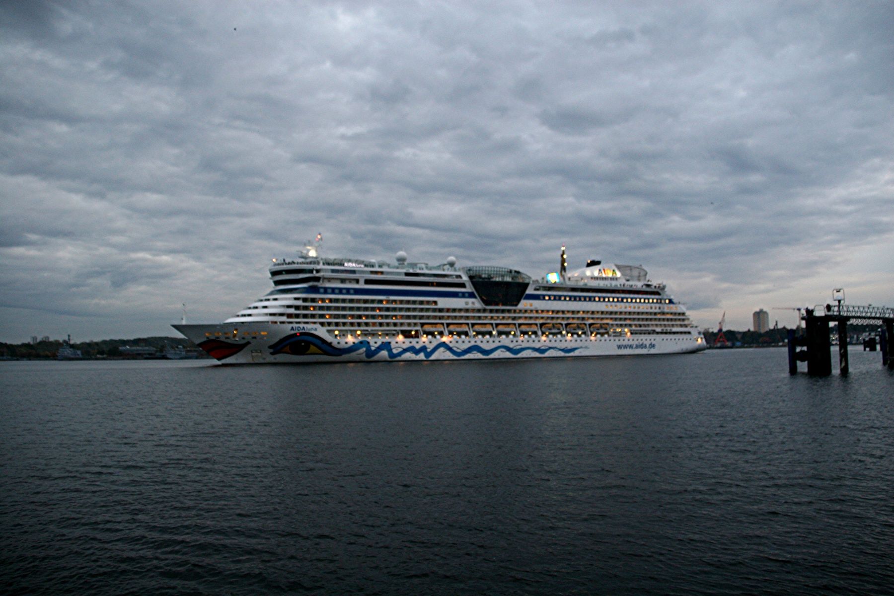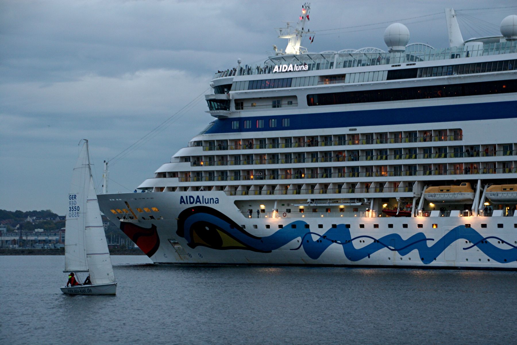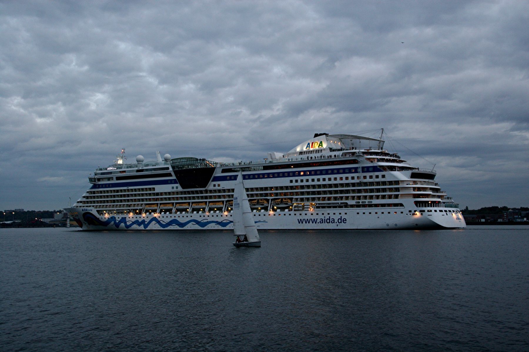 Die AIDAluna fährt am 18.10.2021 um 18:09h ihr Auslaufmanöver auf der "Kieler Förde"
