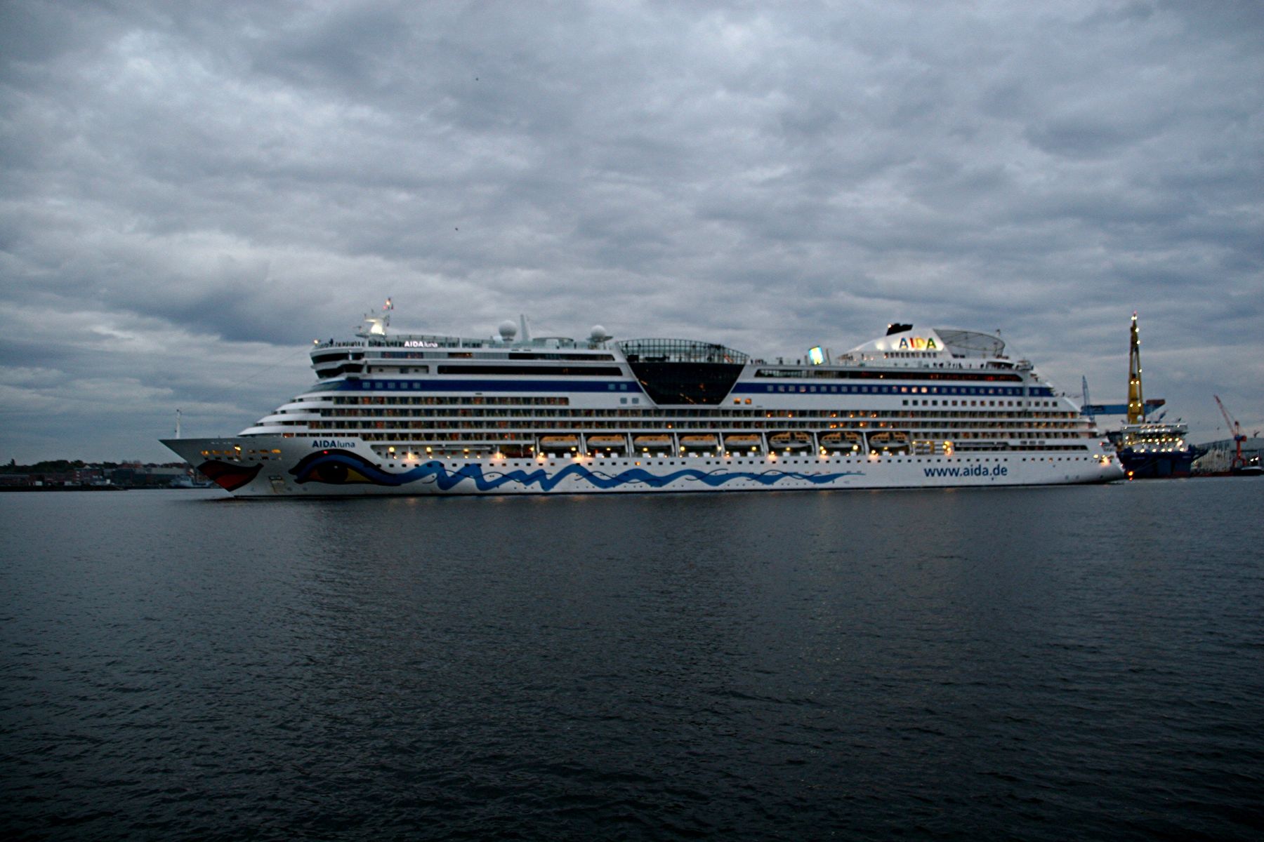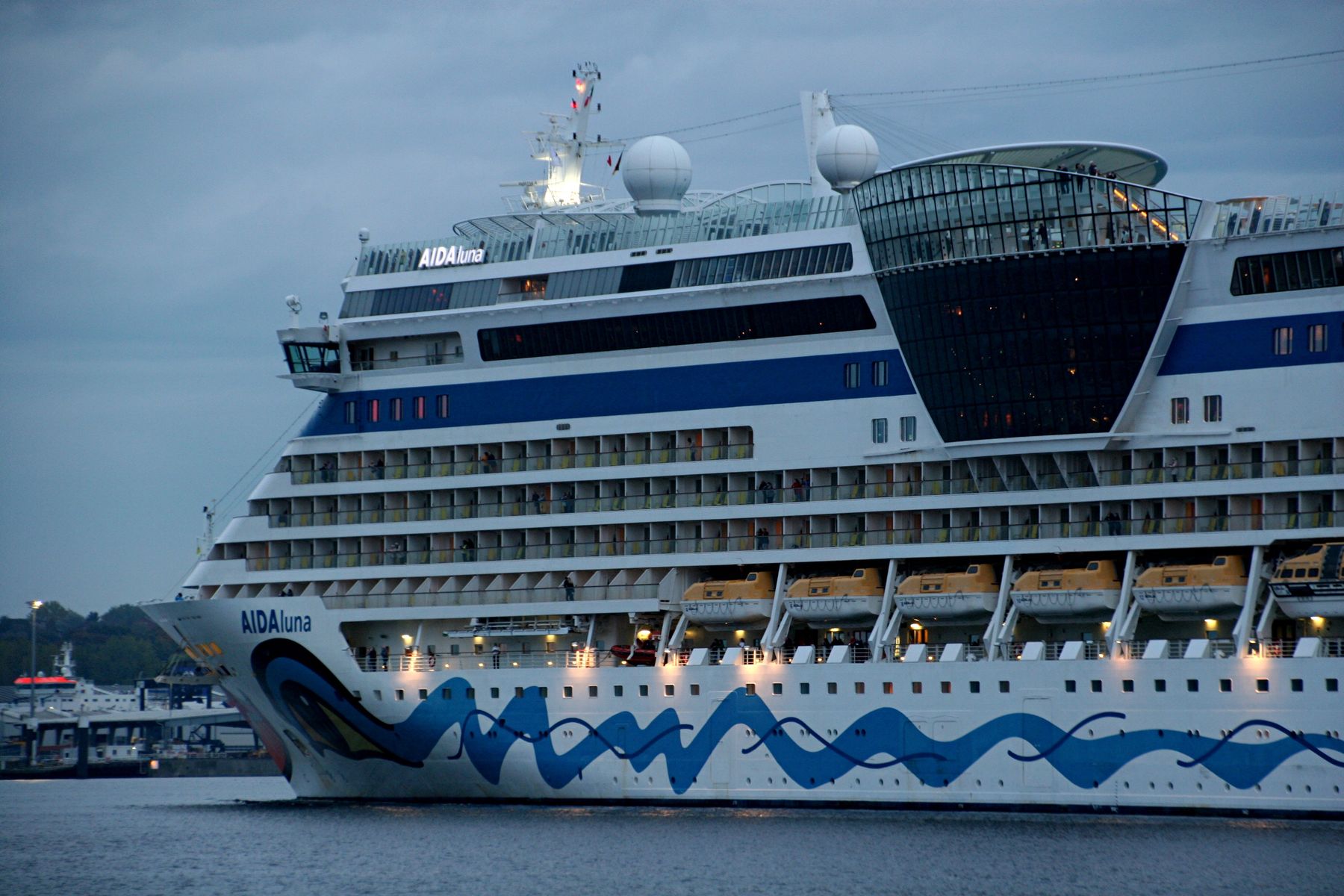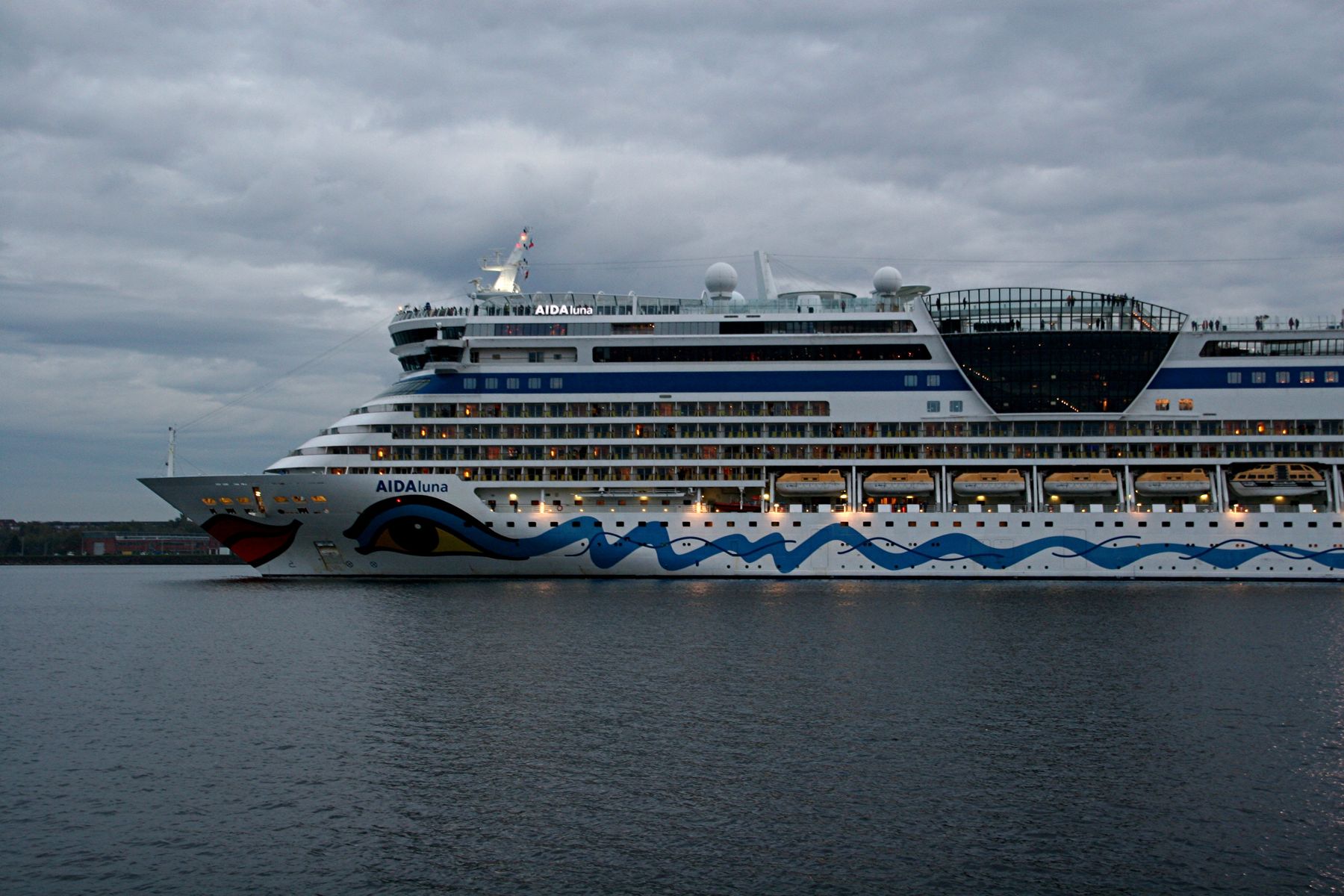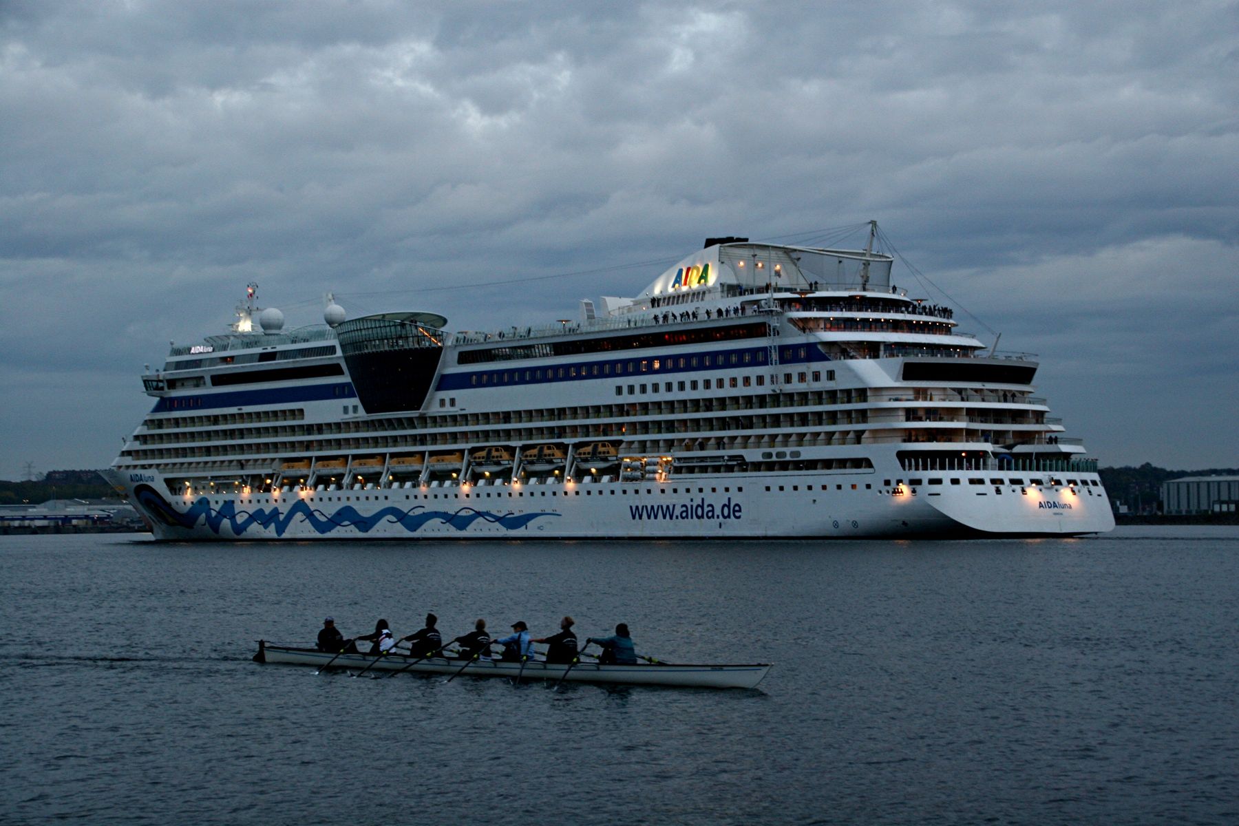 Die AIDAluna fährt am 18.10.2021 um 18:09h ihr Auslaufmanöver auf der "Kieler Förde"