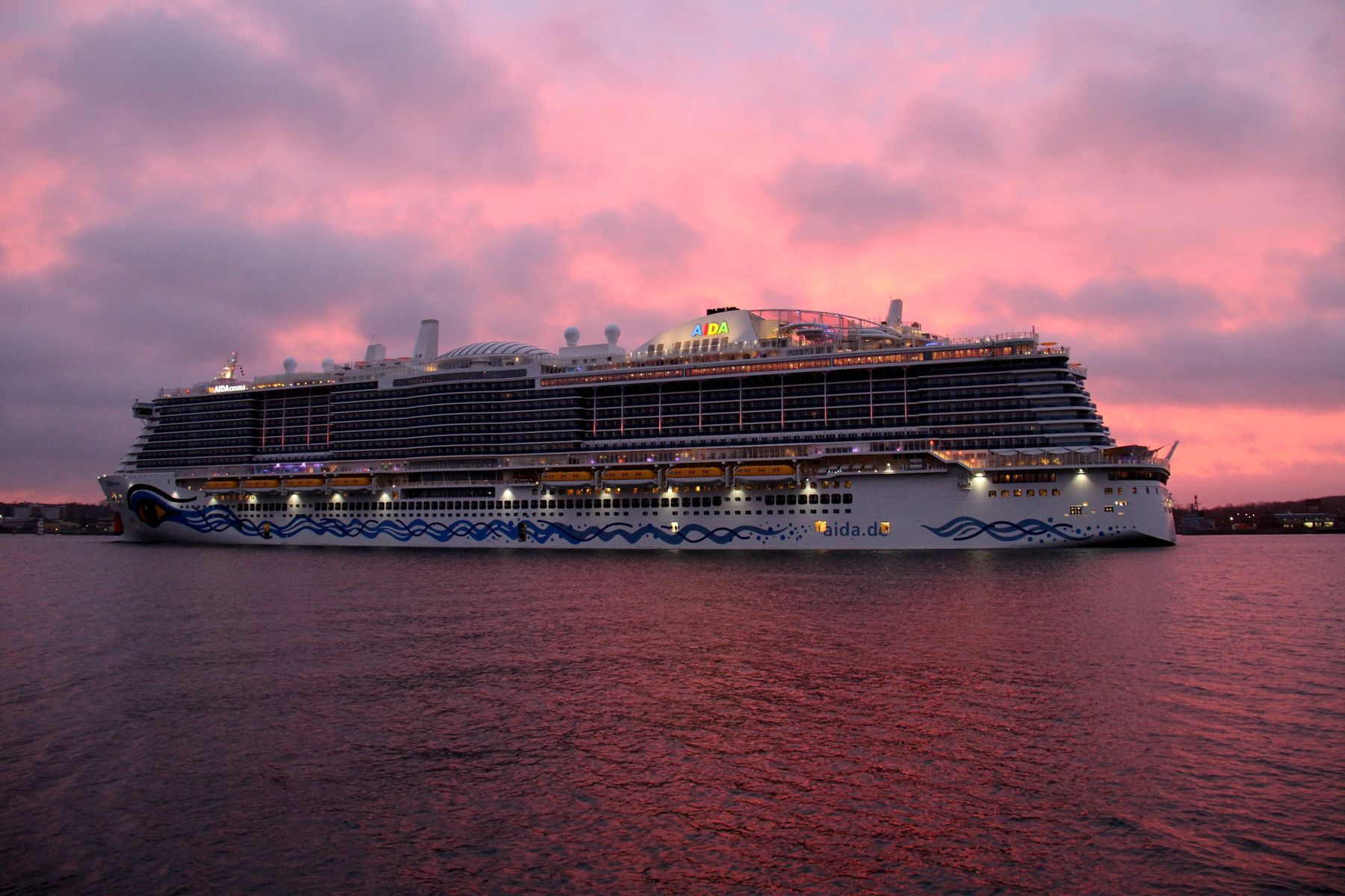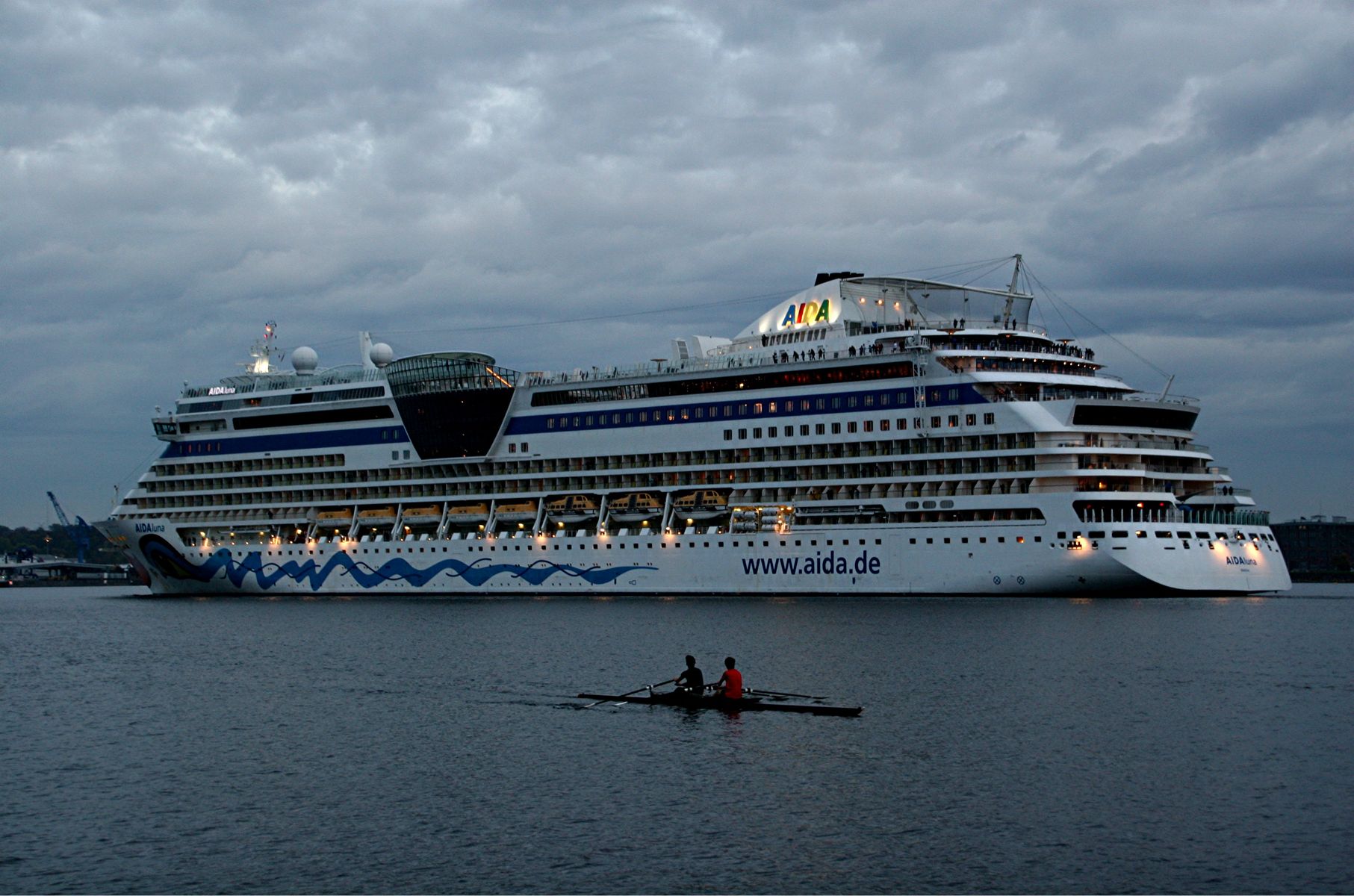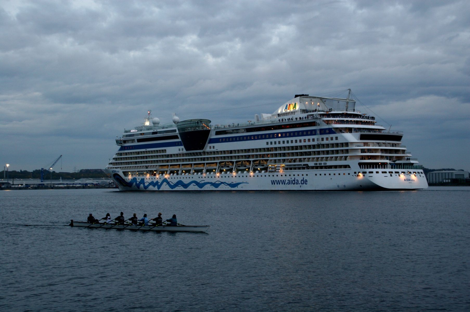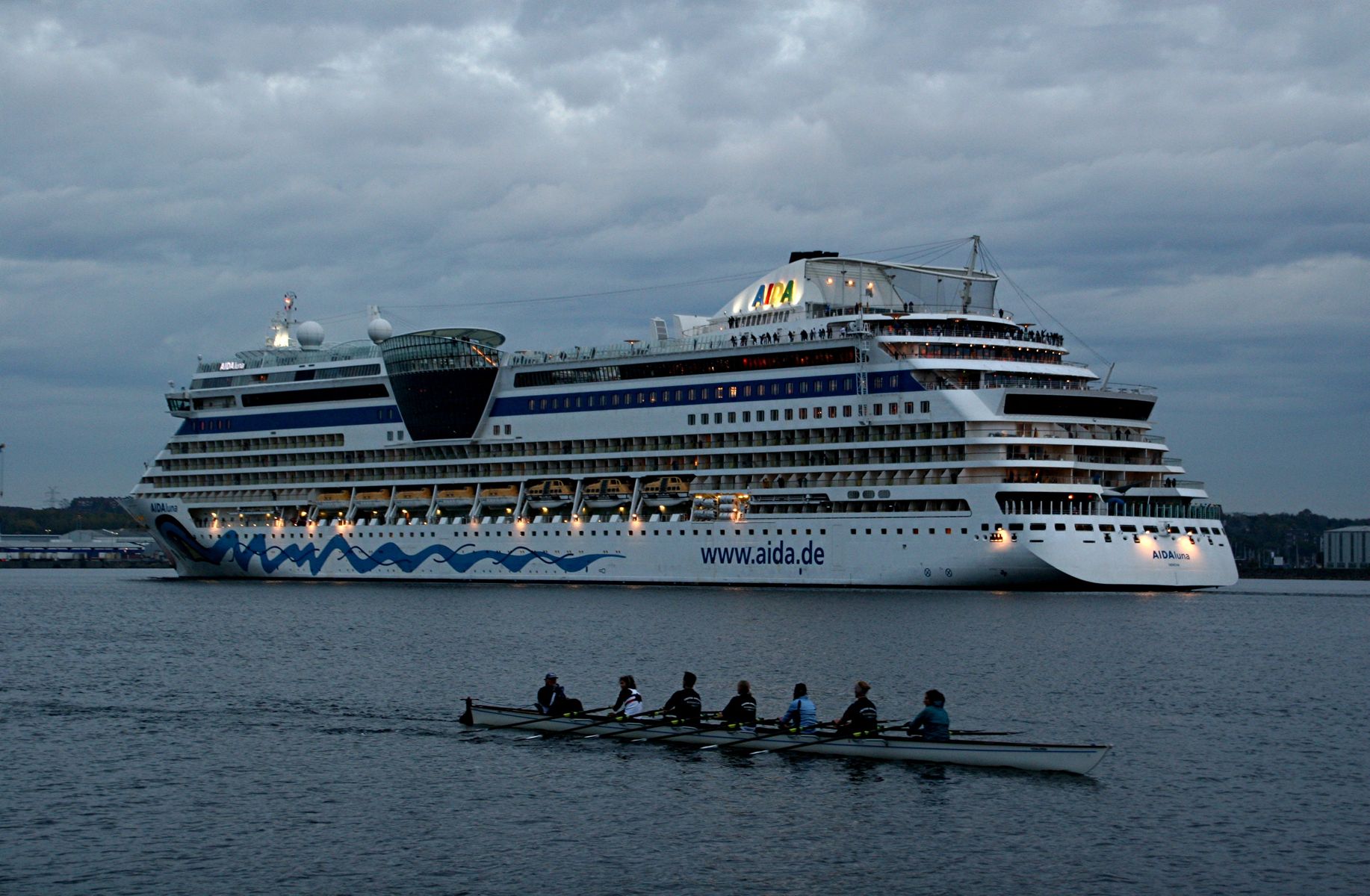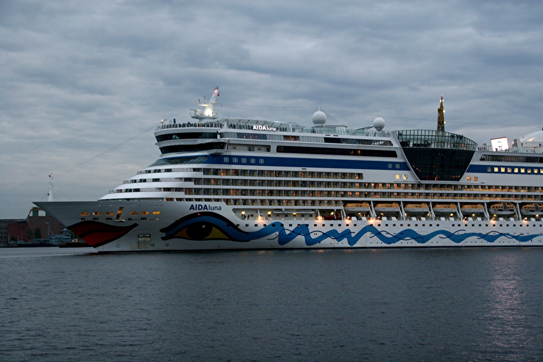 Die AIDAluna fährt am 18.10.2021 um 18:09h ihr Auslaufmanöver auf der "Kieler Förde"