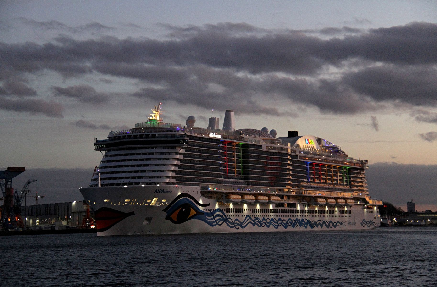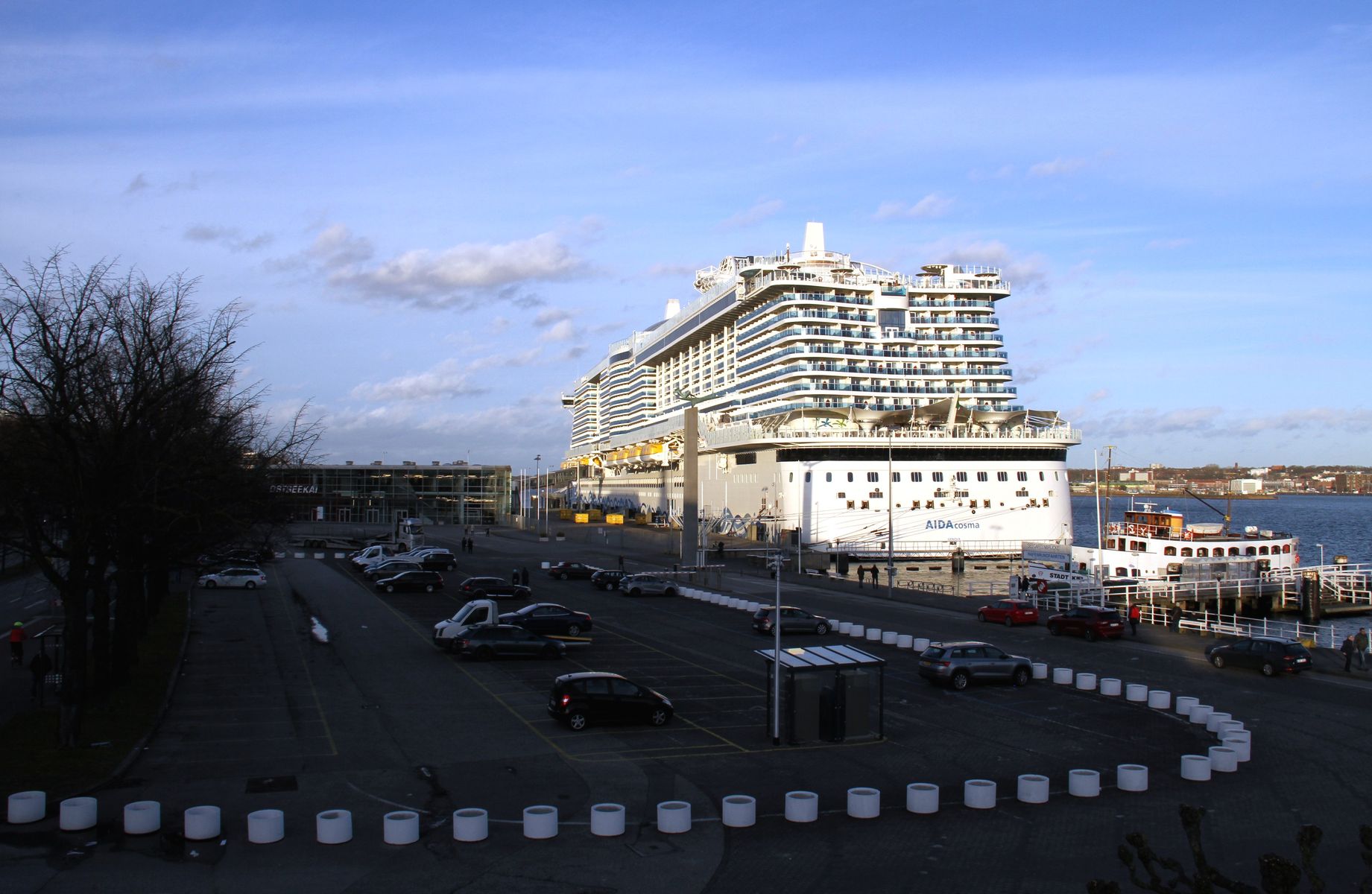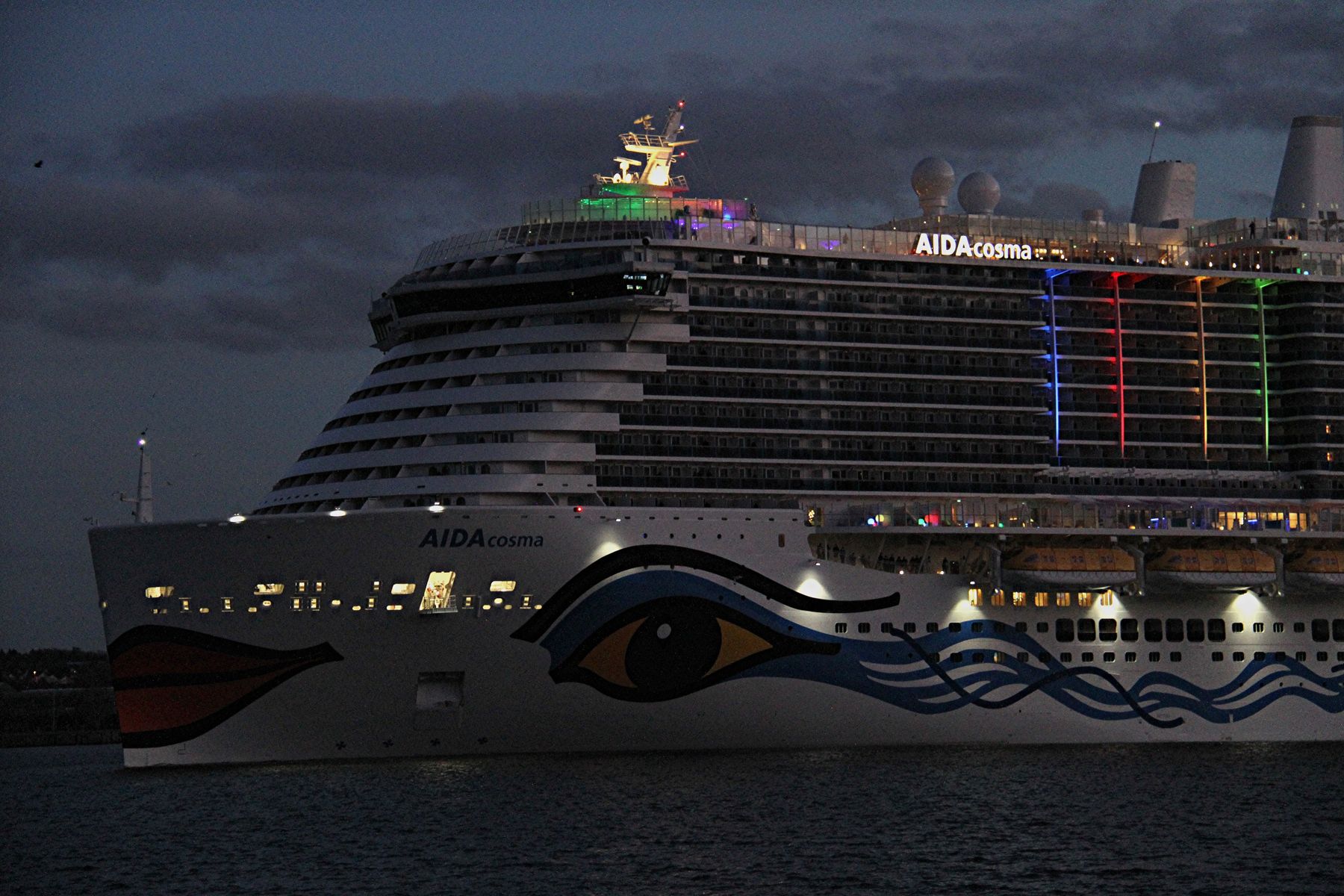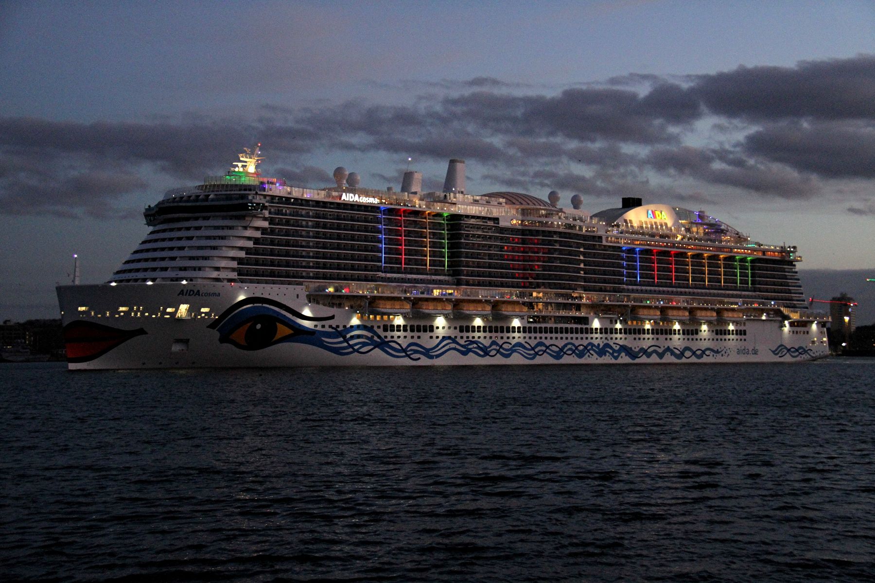 Die AIDAcosma fährt um 18:09h ihr Auslaufmanöver auf der "Kieler Förde"