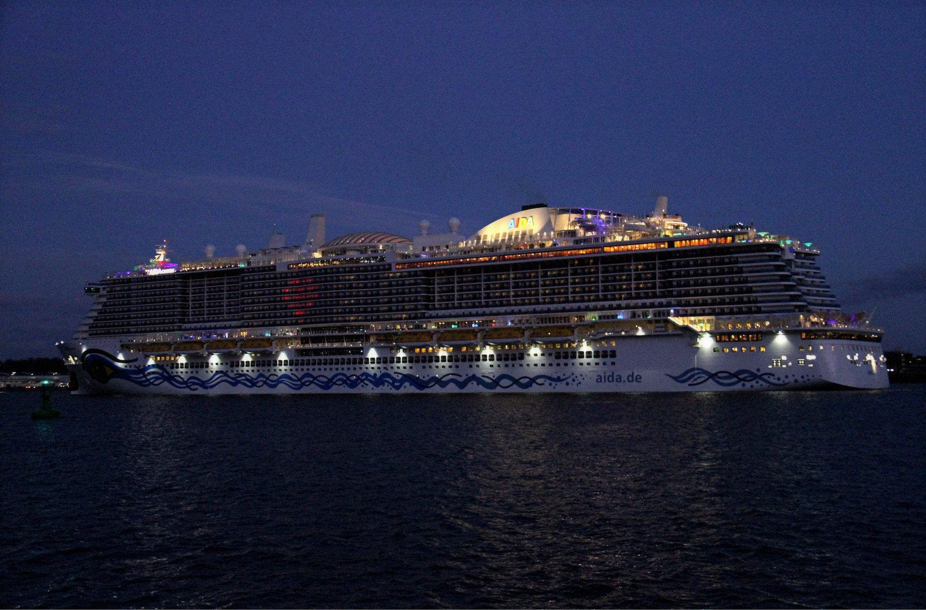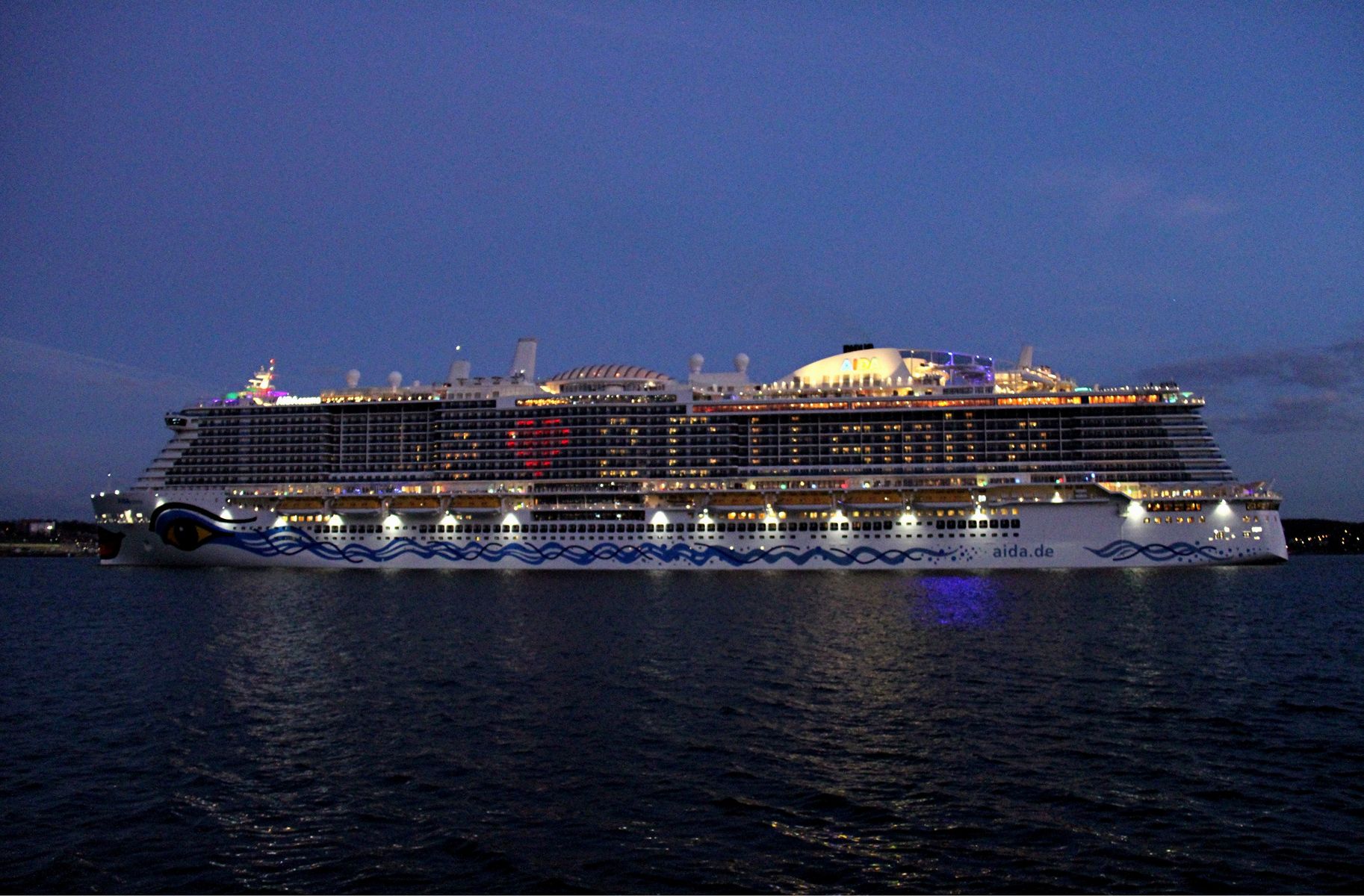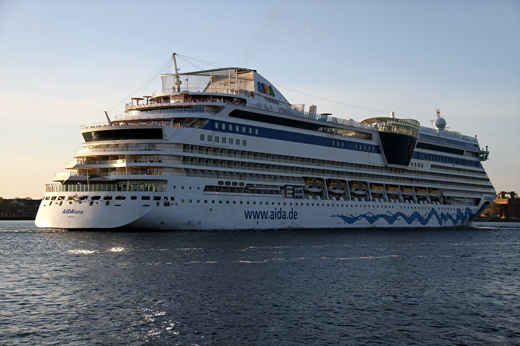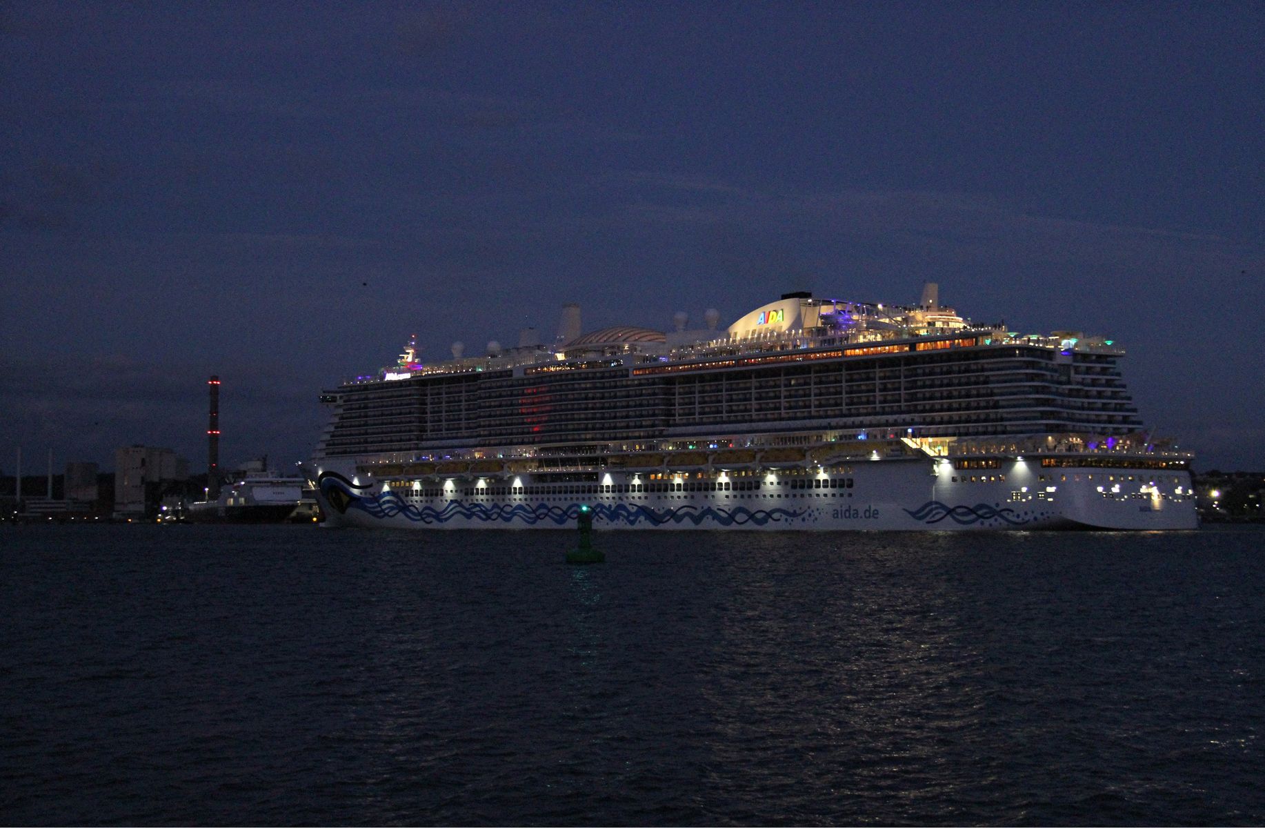 Die AIDAluna fährt um 18:03 h auf der "Kieler Förde" ihr Auslaufmanöver