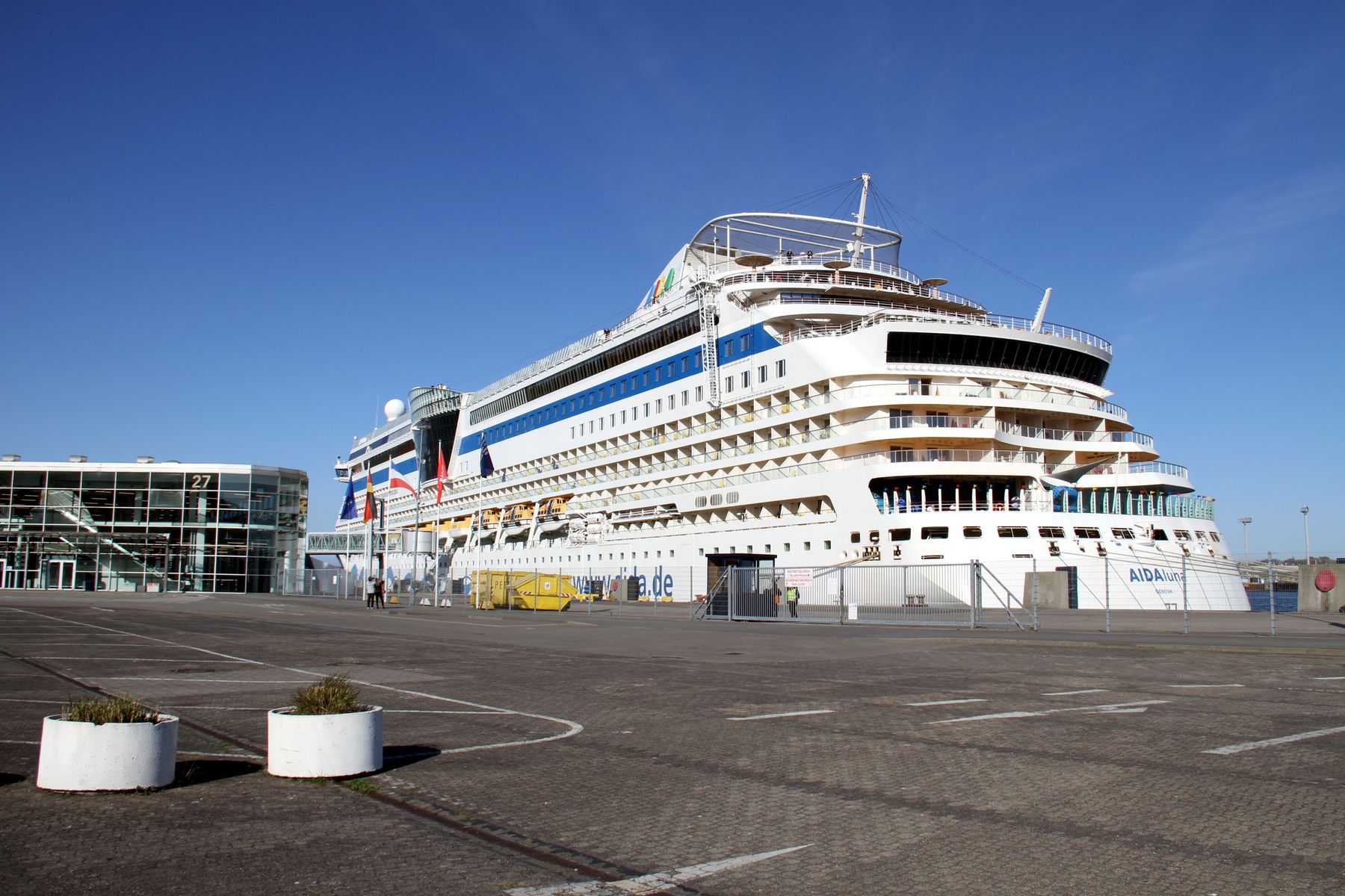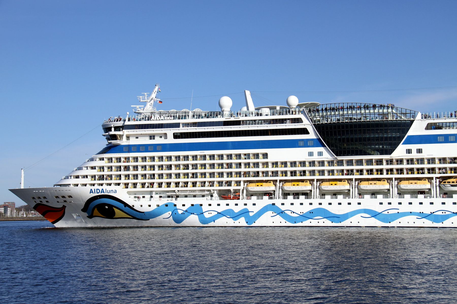 Die AIDAluna fährt unter einem azurblauen Himmel rückwärts zum "Liegeplatzt 27" am Ostseekai
