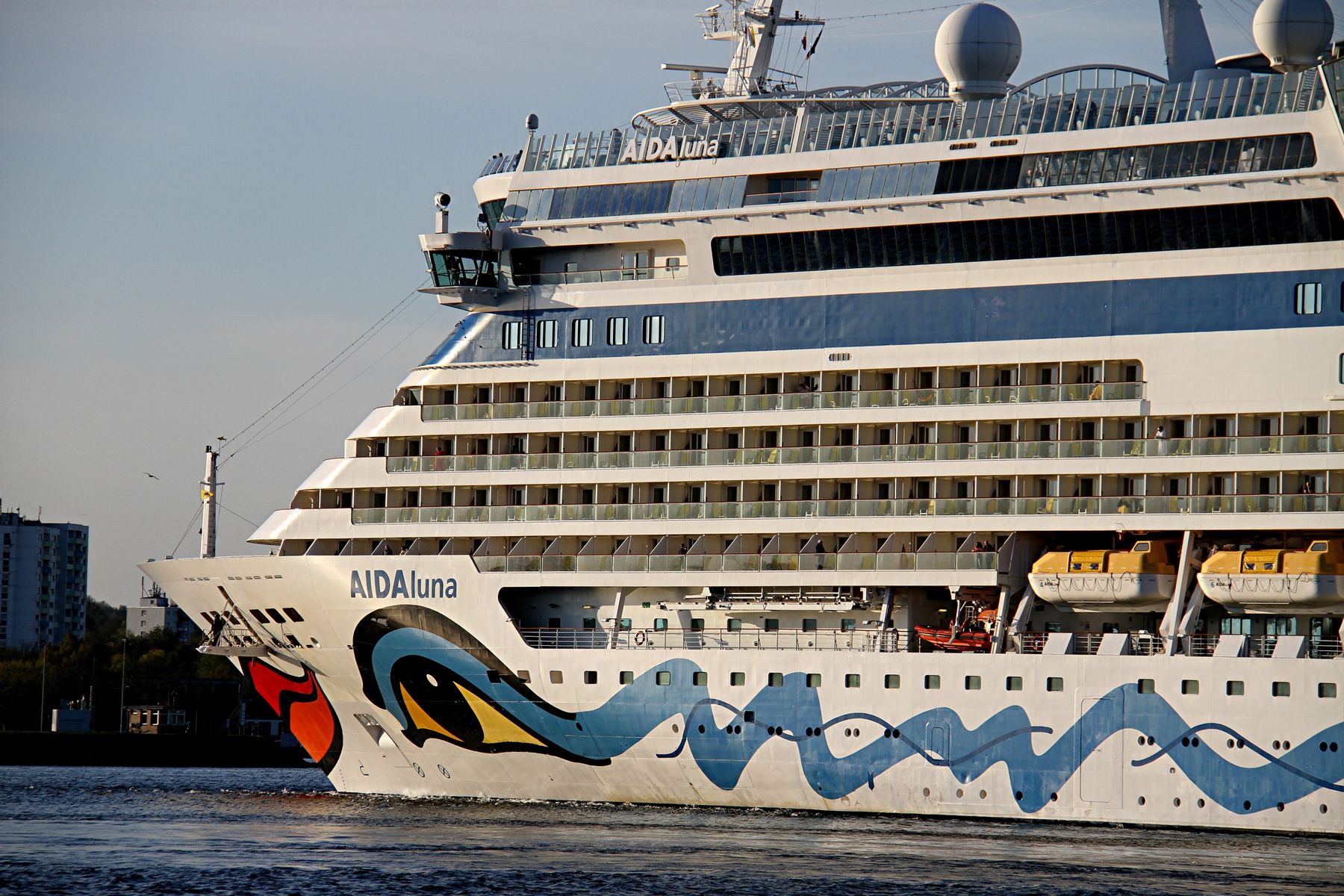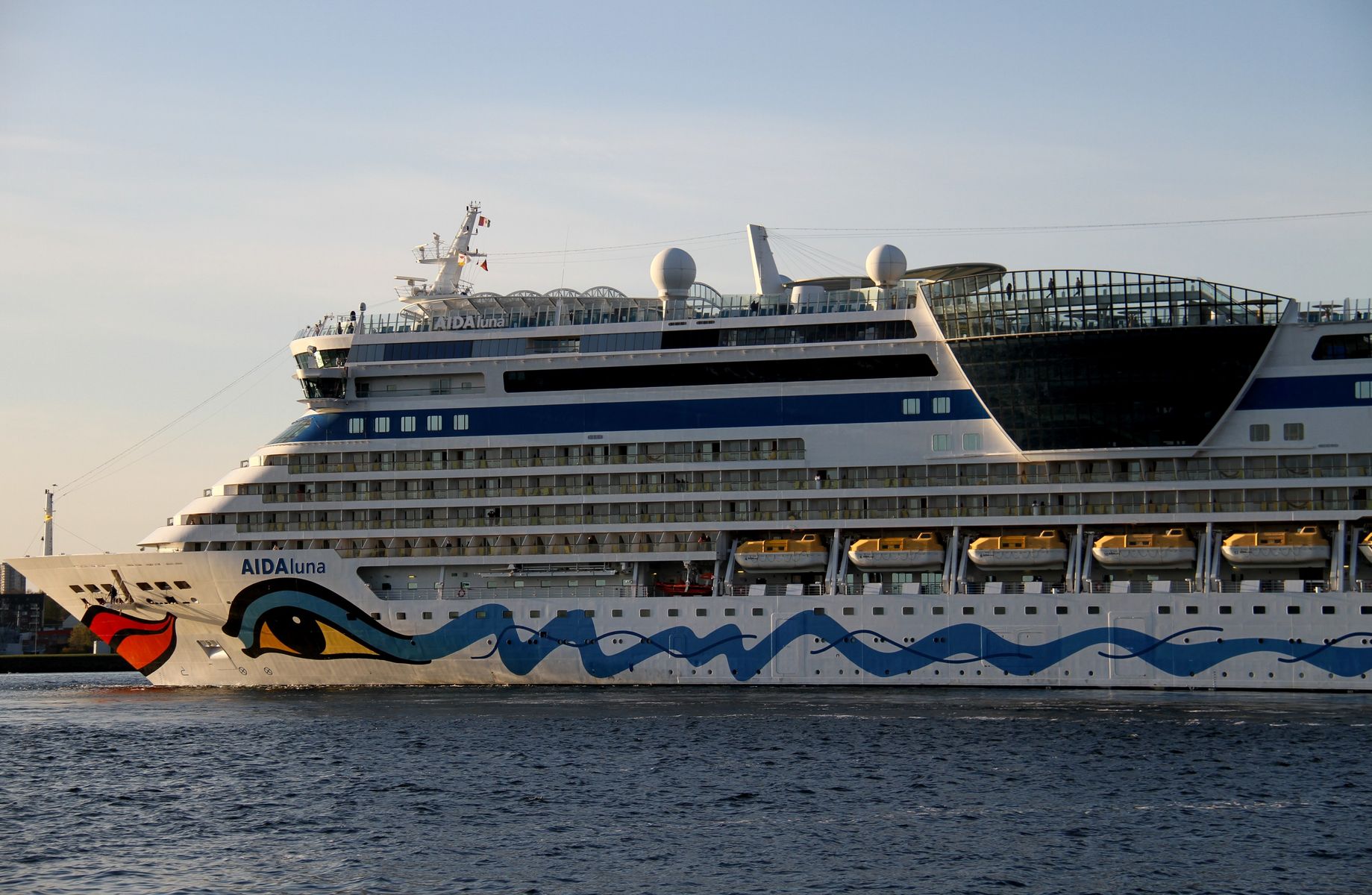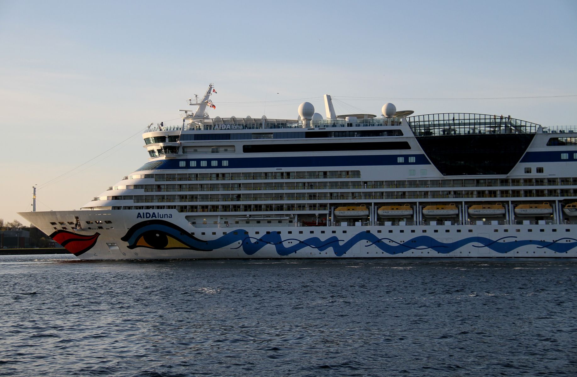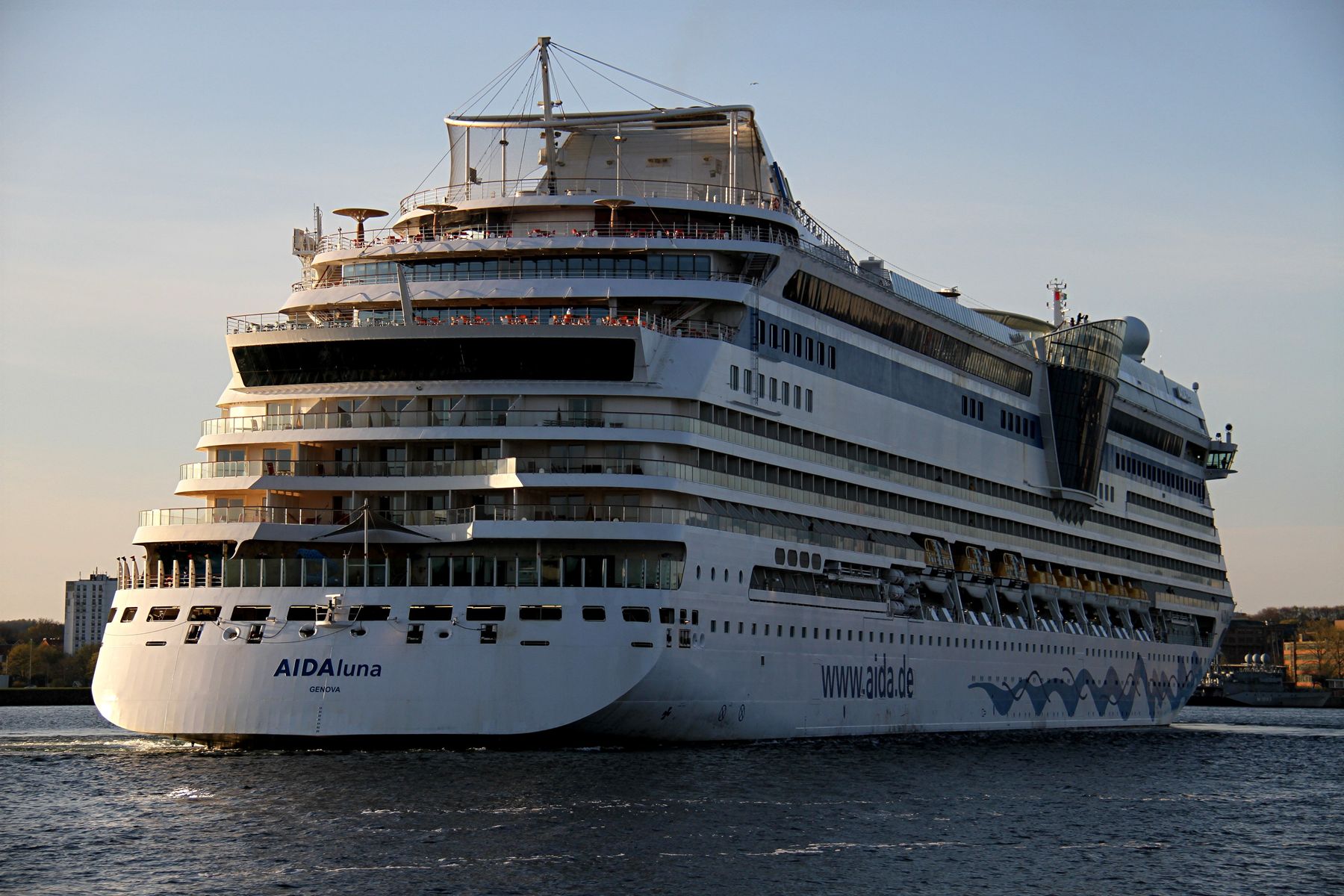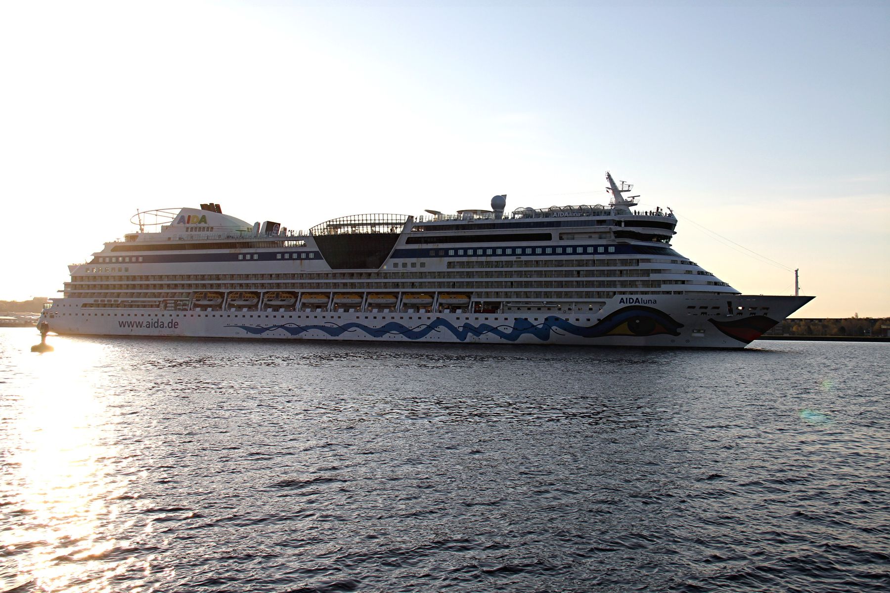Die AIDAluna fährt um 18:03 h auf der "Kieler Förde" ihr Auslaufmanöver